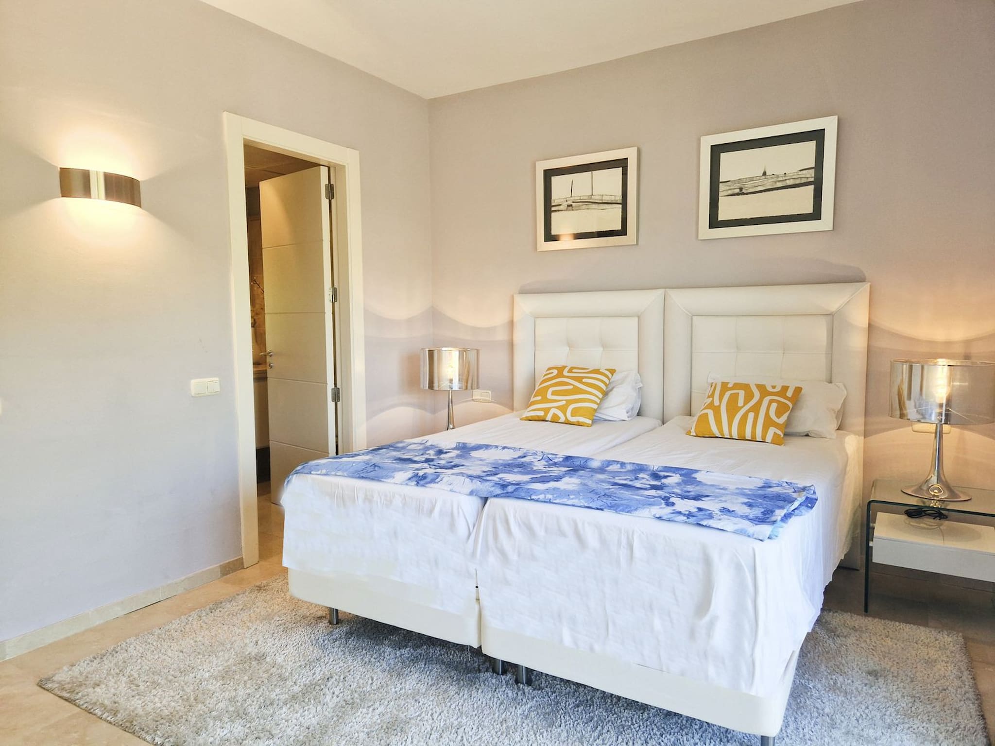 En la primera planta se pueden encontrar los 2 dormitorios. El dormitorio principal tiene una cama de matrimonio, armarios empotrados, un baño en suite con bañera de hidromasaje y ducha, y acceso a una terraza privada. El dormitorio de invitados cuenta con 2 camas individuales, armarios empotrados, un cuarto de baño en suite con ducha y acceso a una pequeña zona de terraza.