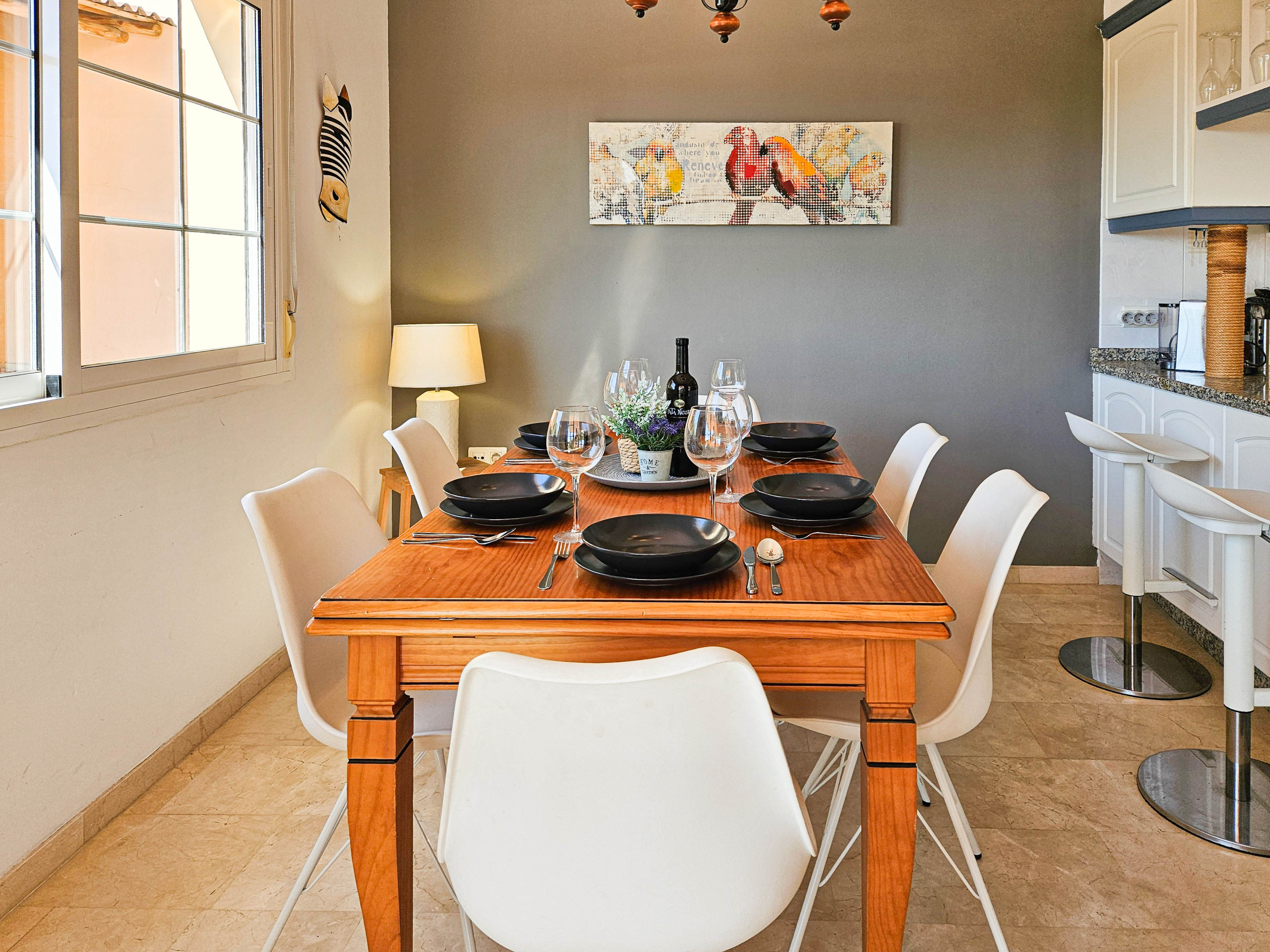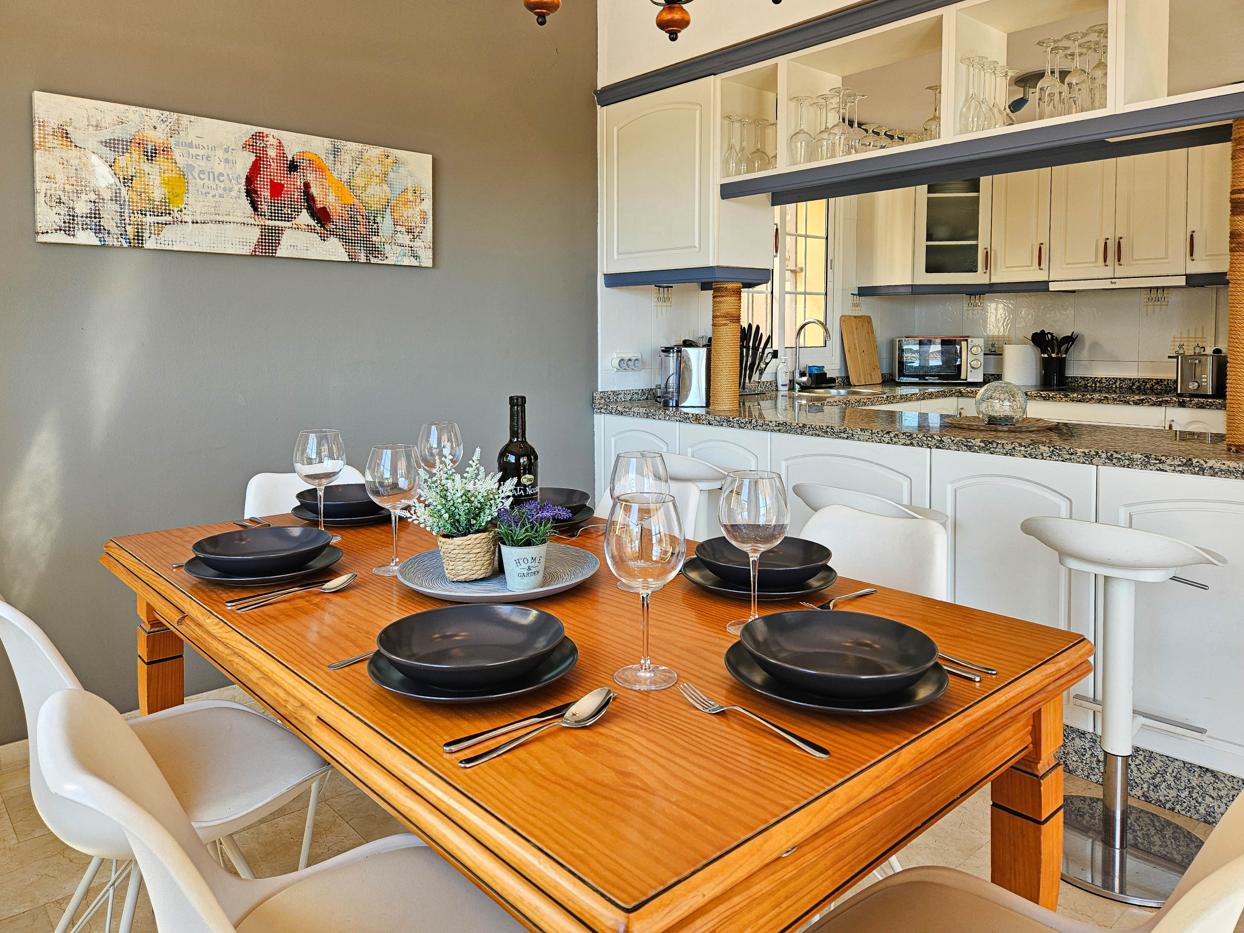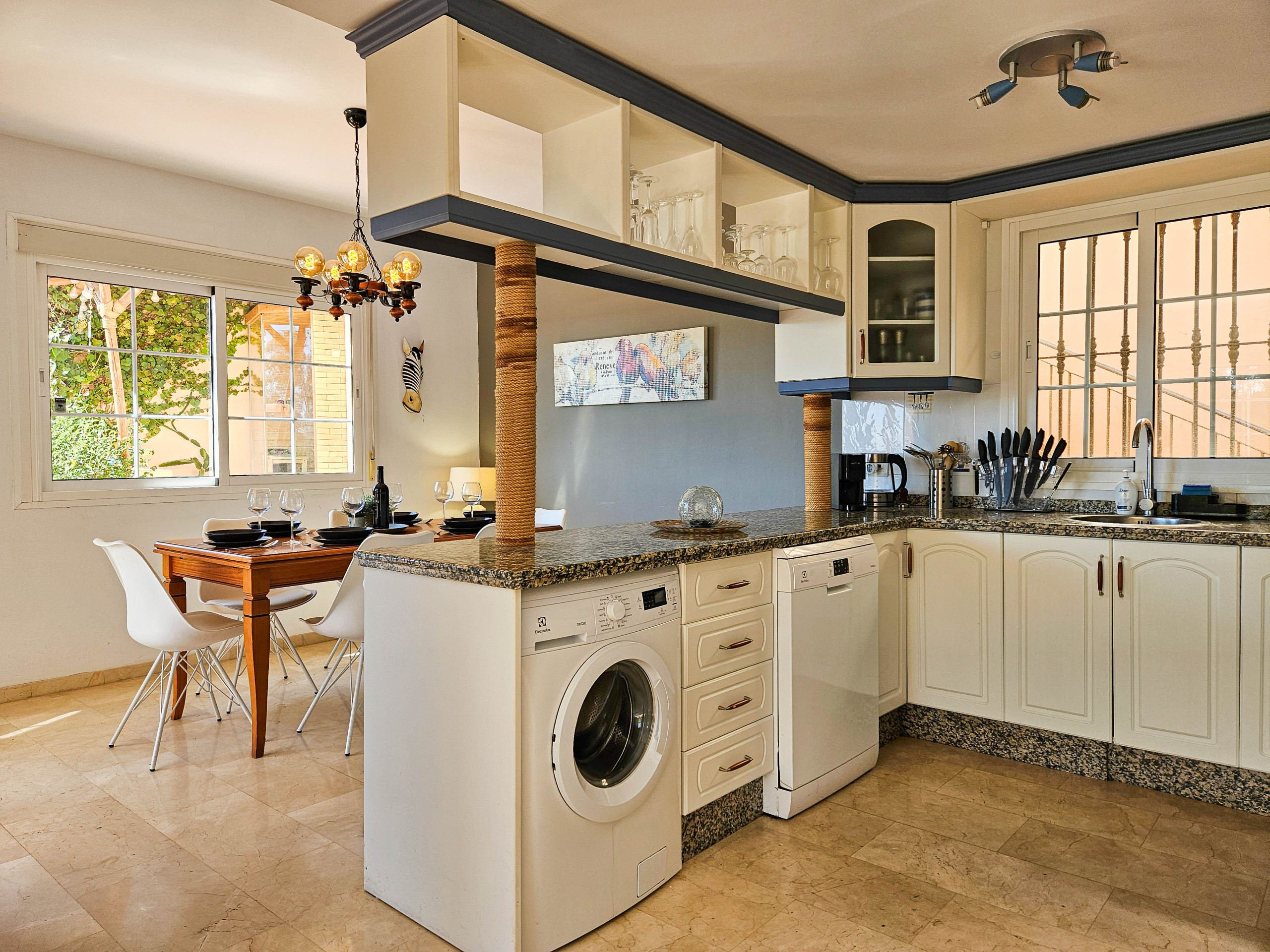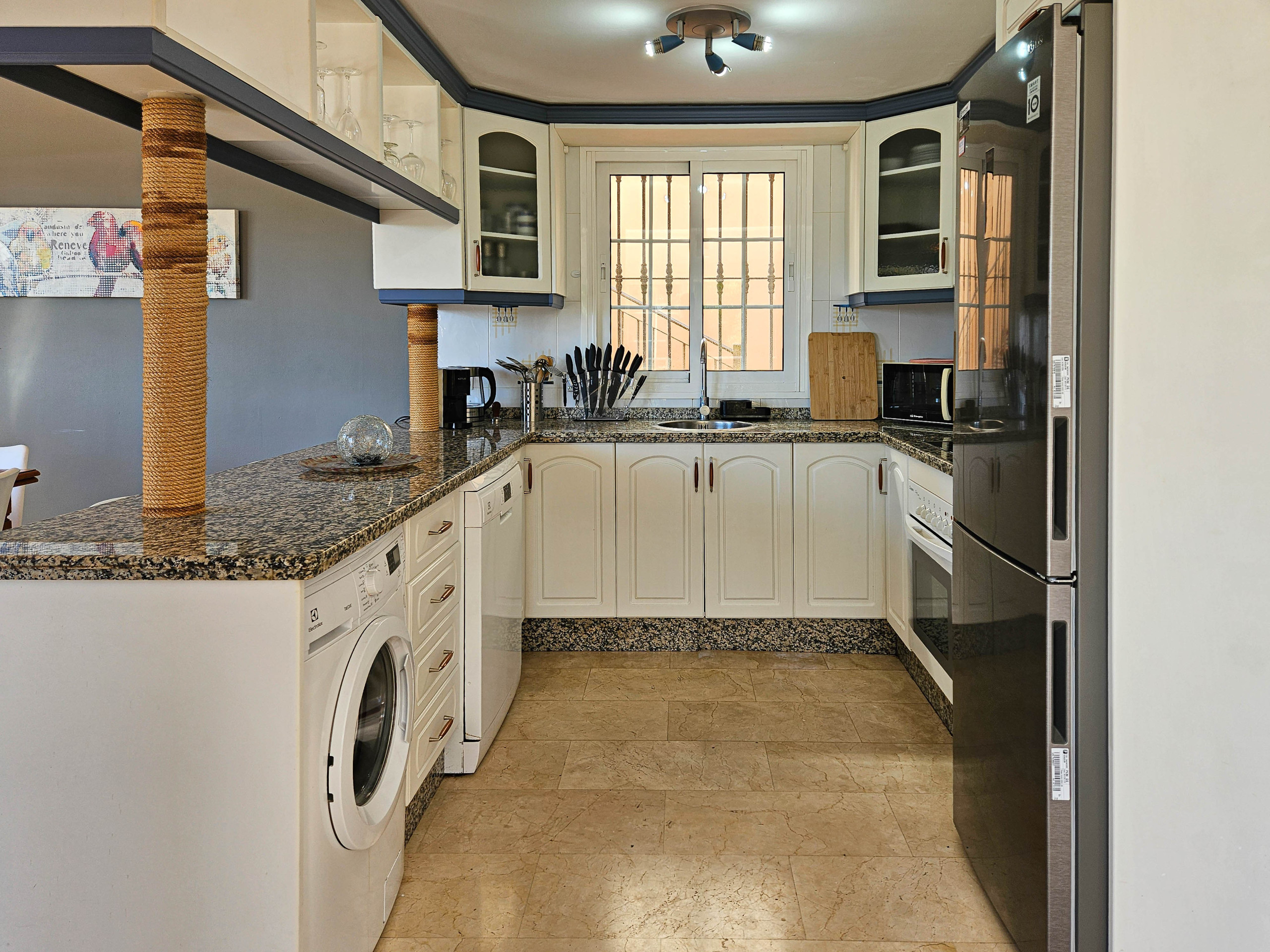 La cocina americana, de vitrocerámica, está equipada con nevera, microondas, horno, congelador, lavavajillas, vajilla/cubertería, utensilios/cocina, cafetera, tostadora, hervidor de agua y exprimidor.