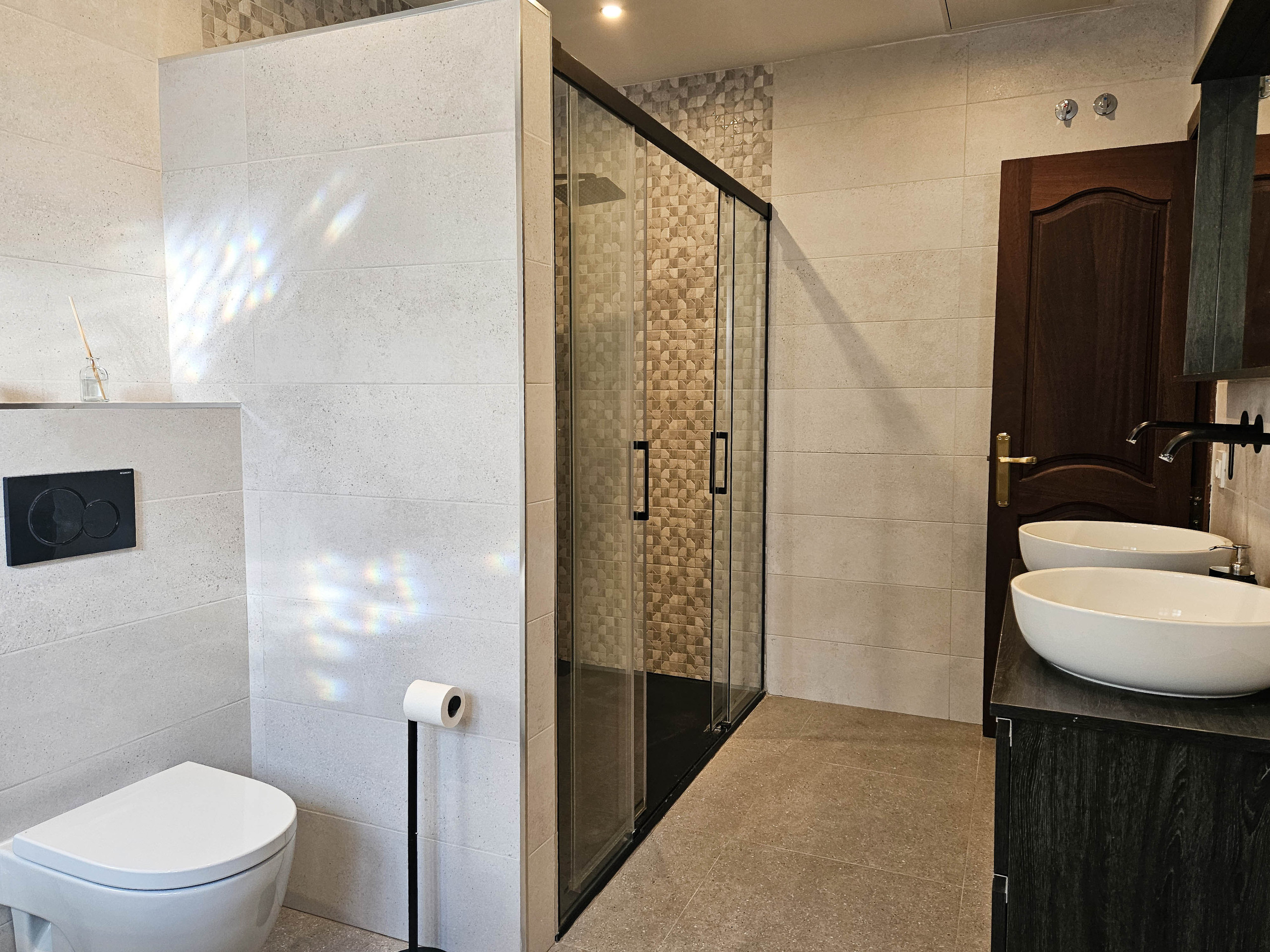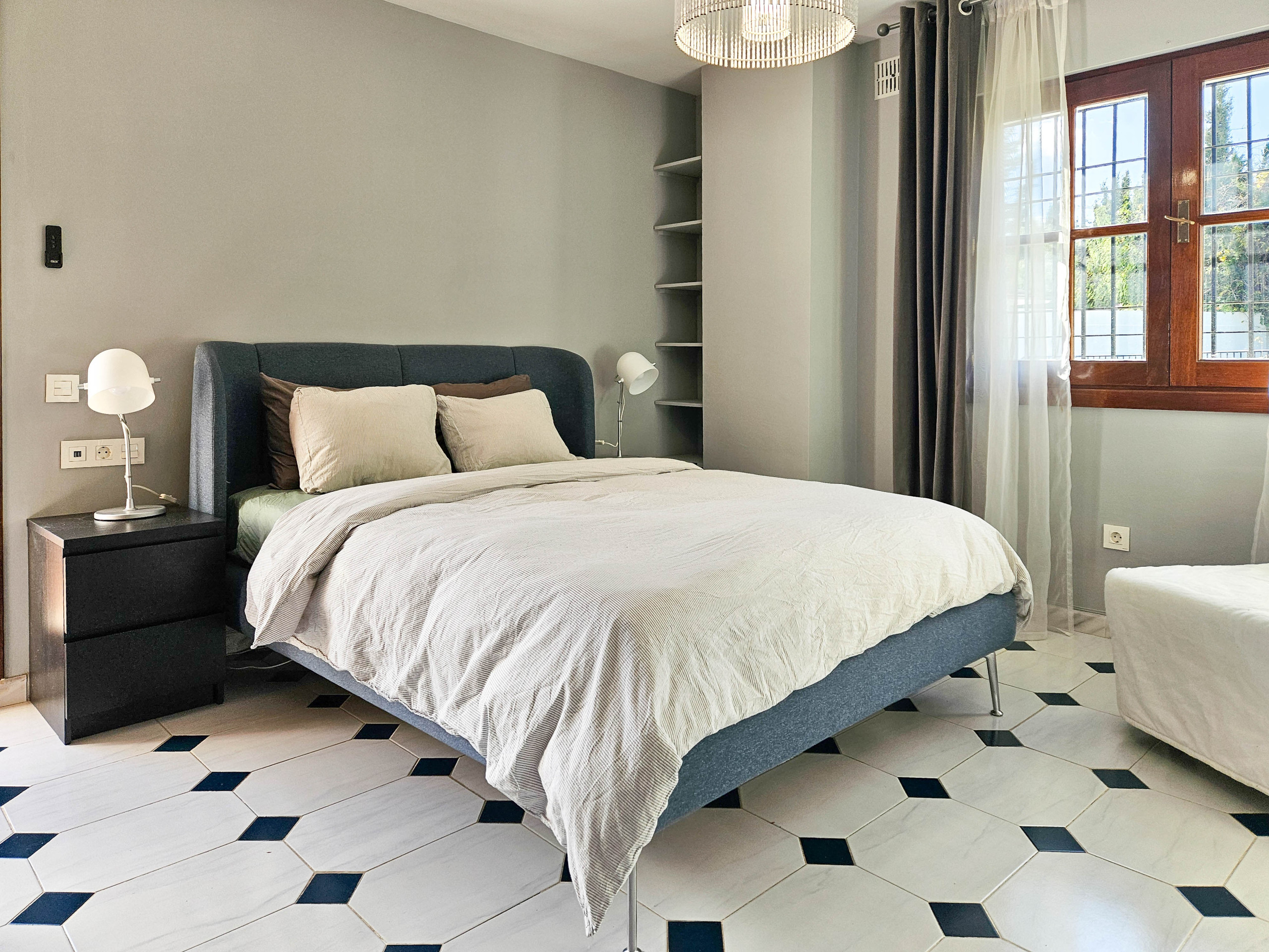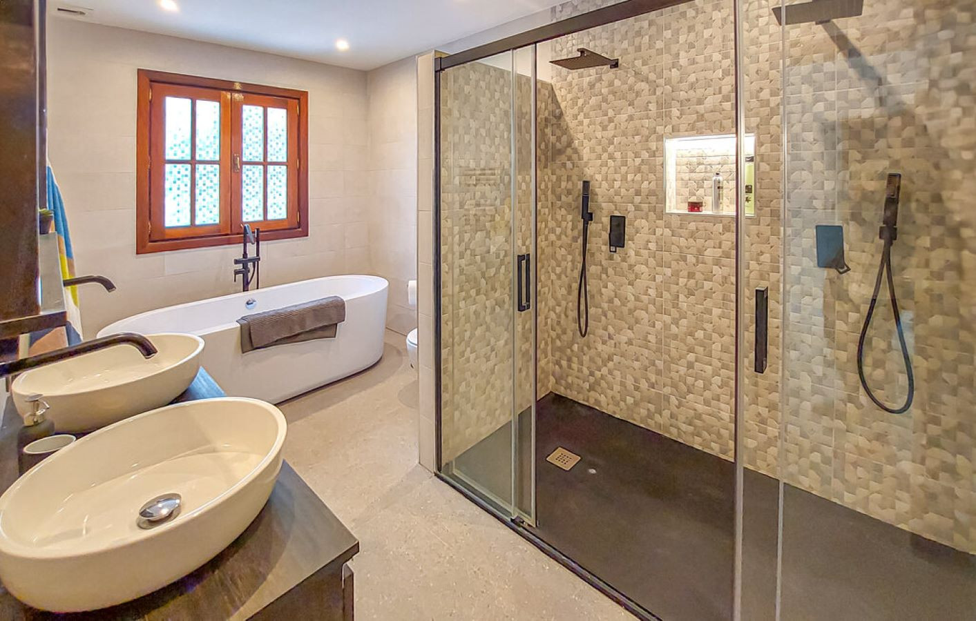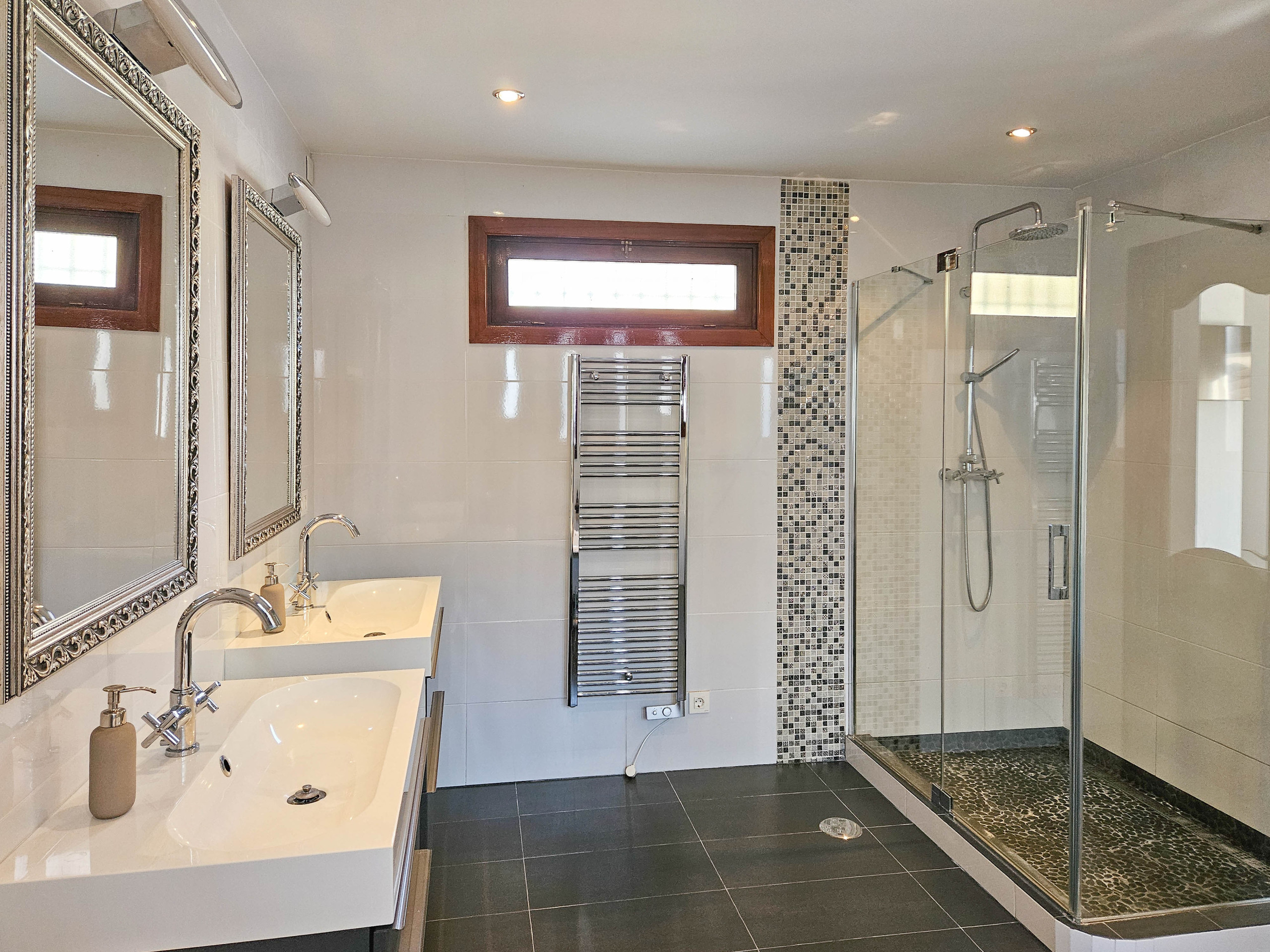 Hay dos dormitorios ubicados en la planta baja. Ambos dormitorios ofrecen una cama de matrimonio, cuartos de baño en suite, armarios empotrados y persianas. El espacioso dormitorio principal también ofrece una cuna y se beneficia de un acceso directo a la terraza cubierta, la piscina y el jardín. El cuarto de baño en suite del dormitorio principal está equipado con una bañera con ducha, una cabina de ducha independiente, un bidé y lavabos dobles. El segundo dormitorio ofrece un cuarto de baño en suite con ducha. También hay un aseo en este nivel. Dos dormitorios de invitados adicionales se encuentran en la primera planta. Ambos dormitorios espaciosos están amueblados con camas individuales, armarios empotrados y persianas. También hay un cuarto de baño de invitados en este nivel, equipado con una bañera con ducha.