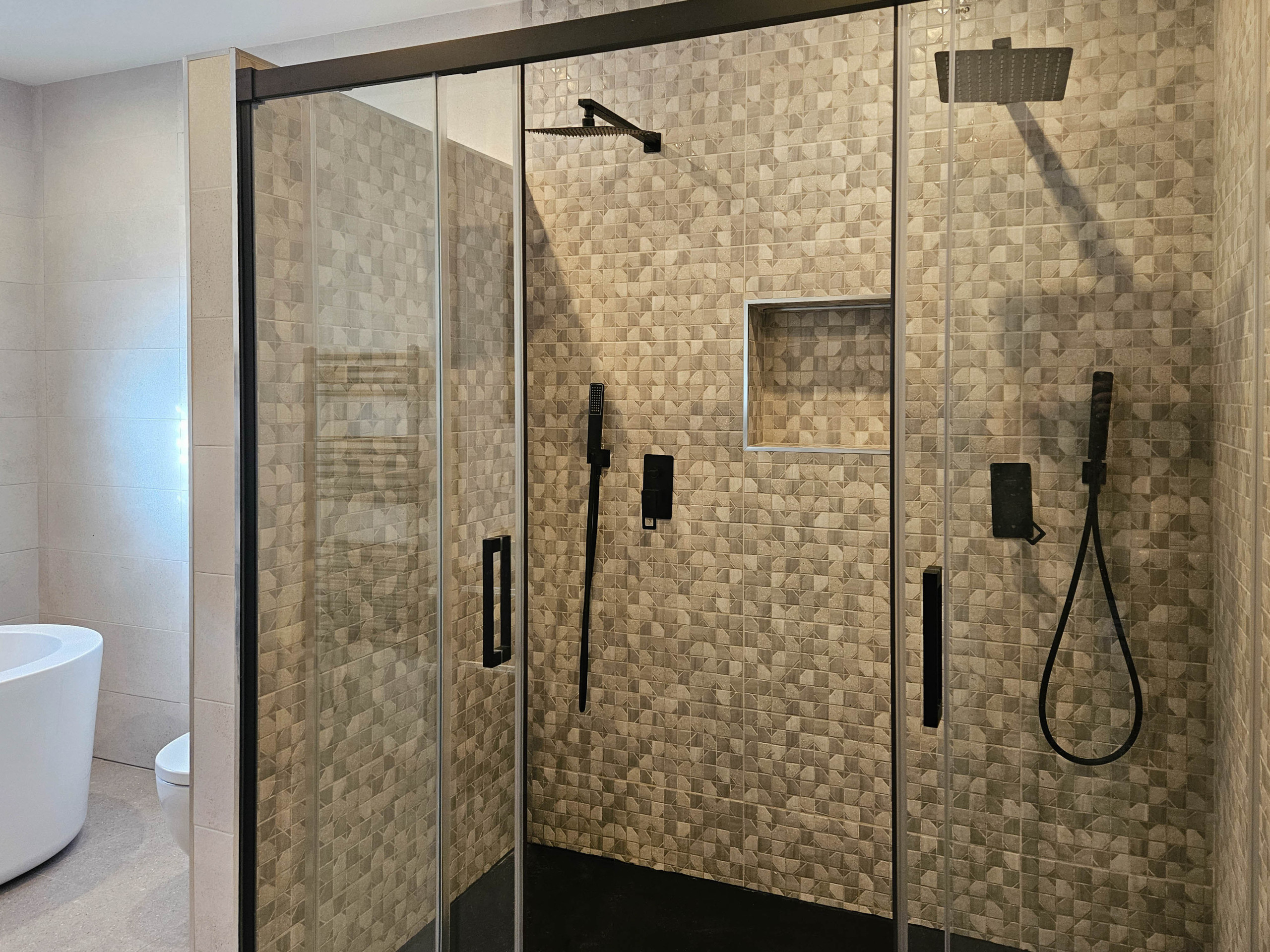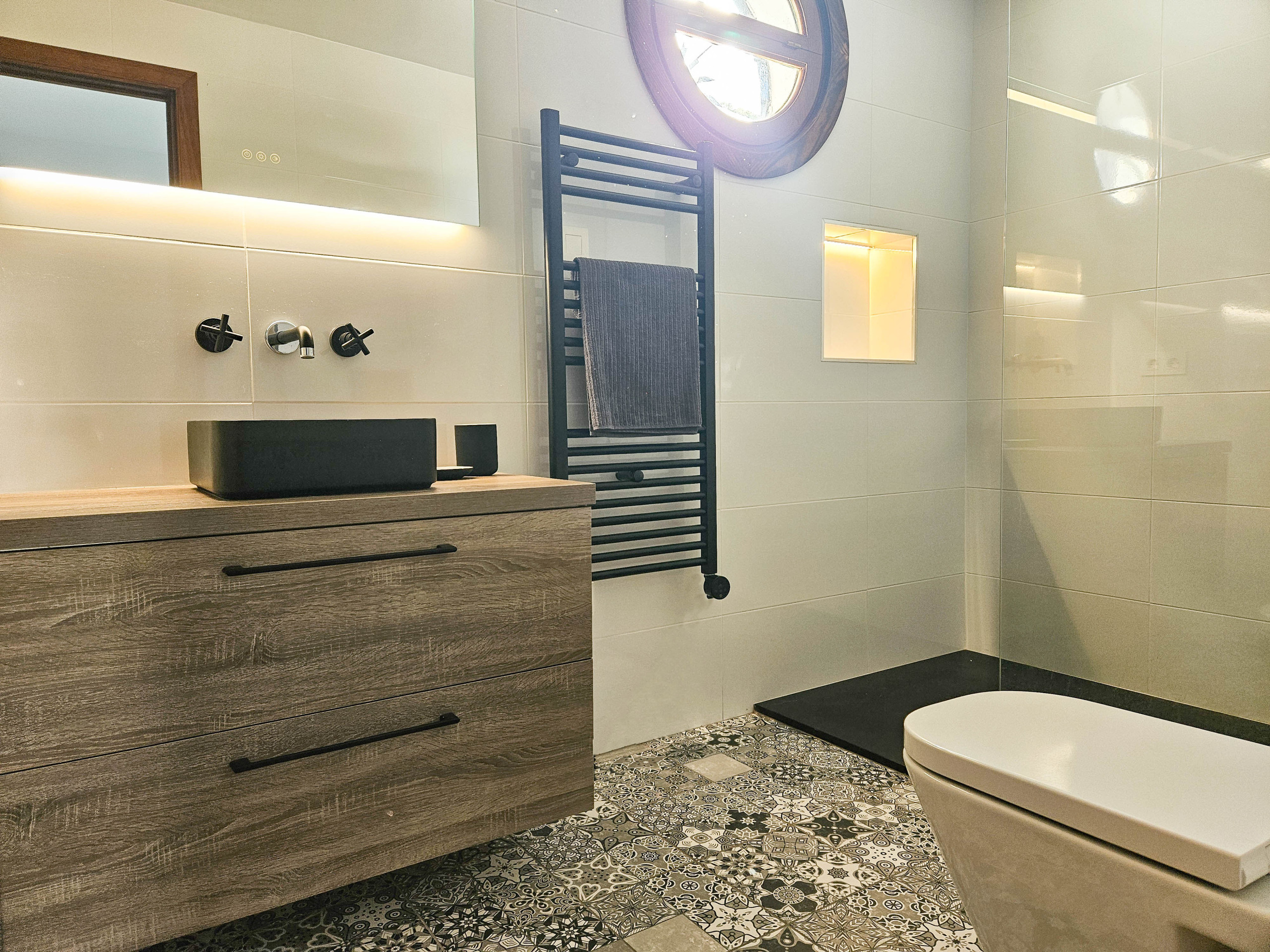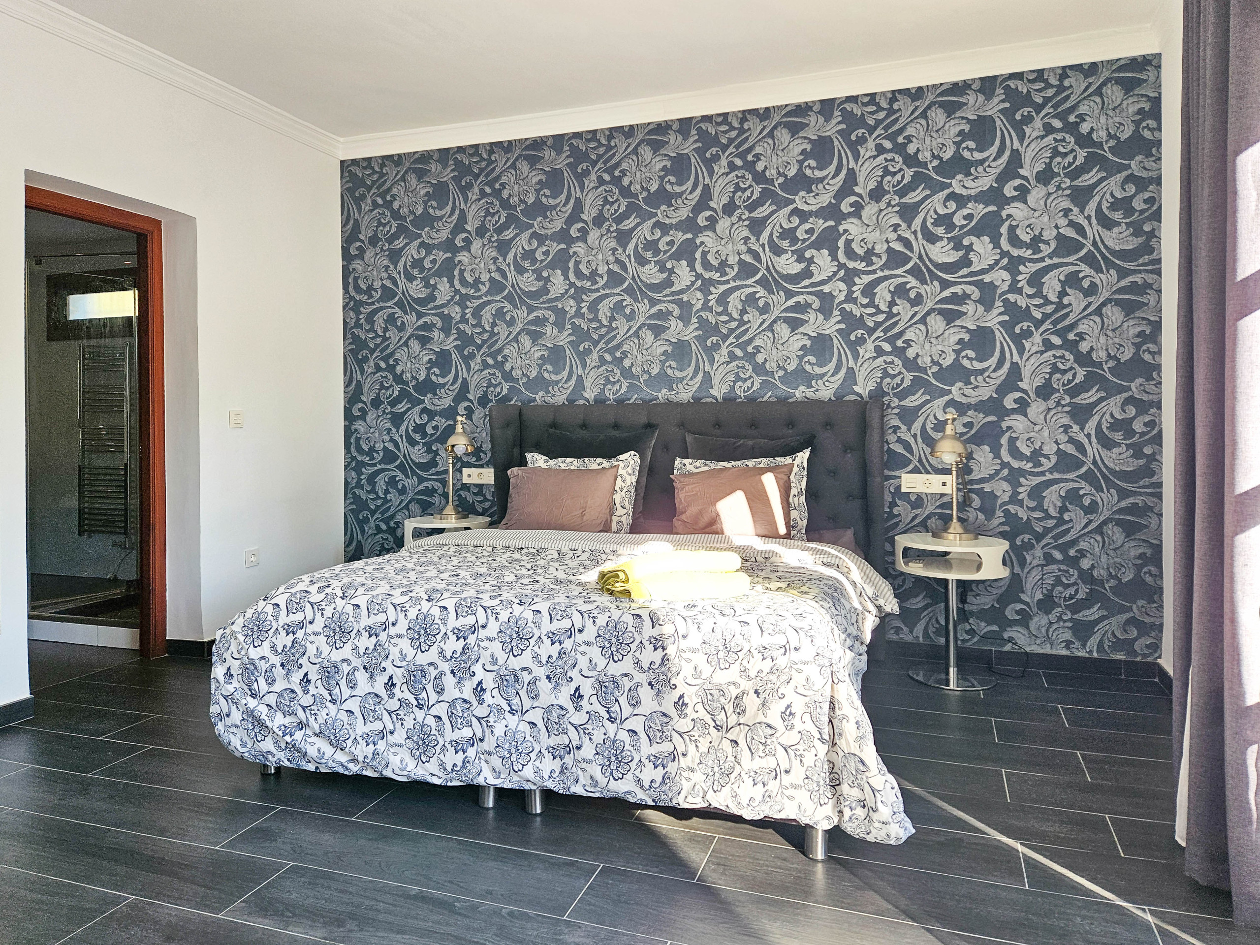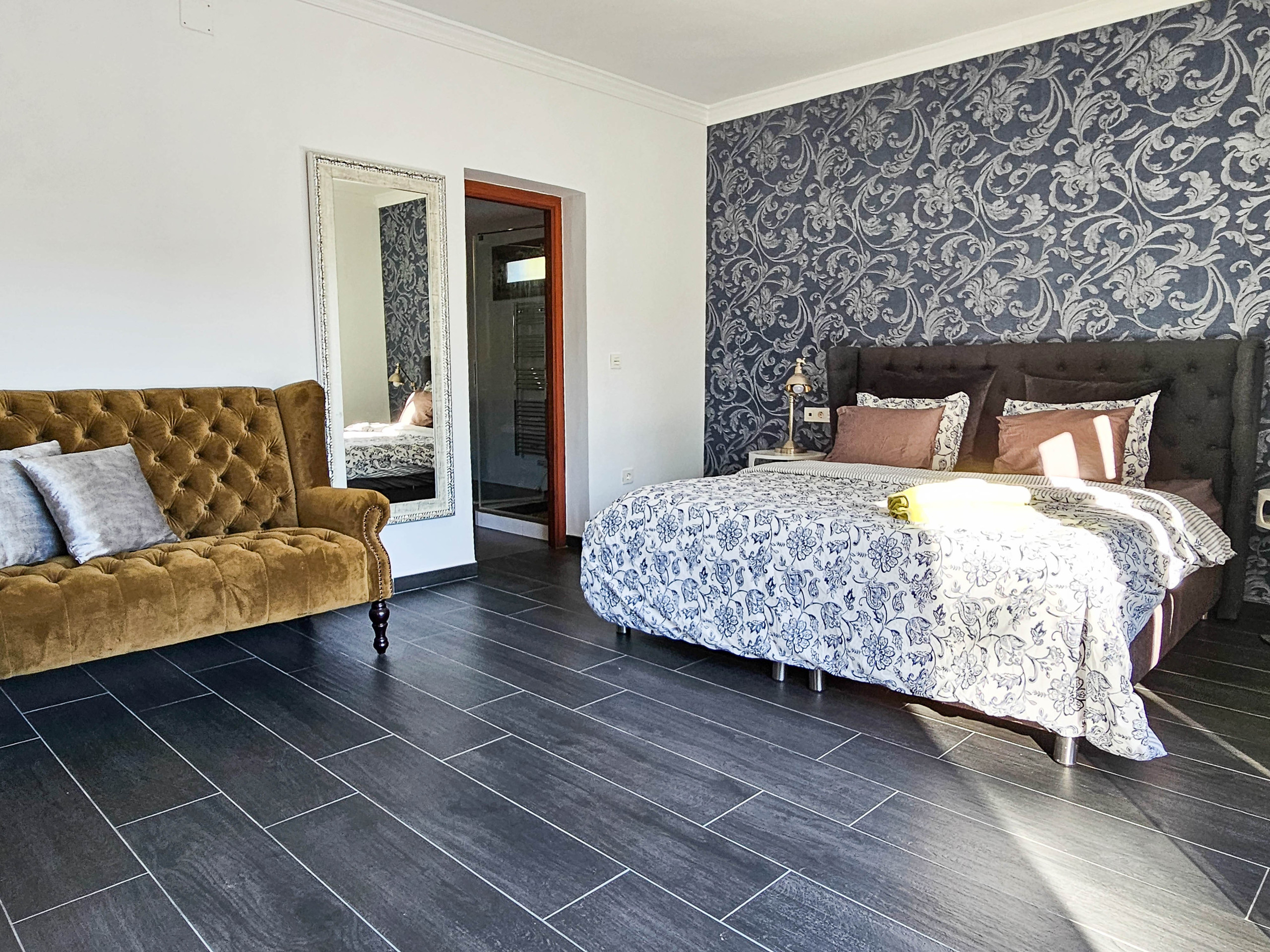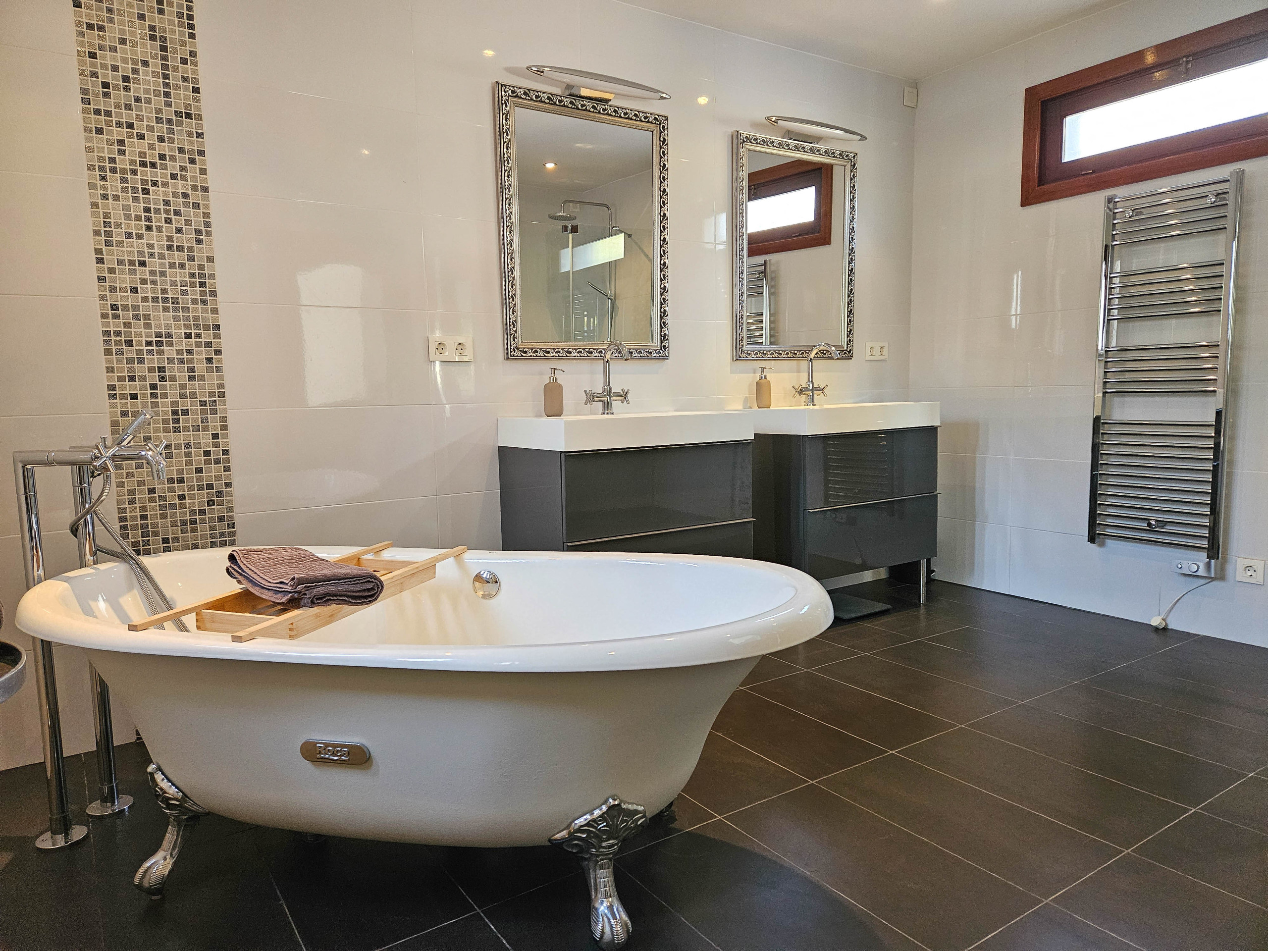 Hay dos dormitorios ubicados en la planta baja. Ambos dormitorios ofrecen una cama de matrimonio, cuartos de baño en suite, armarios empotrados y persianas. El espacioso dormitorio principal también ofrece una cuna y se beneficia de un acceso directo a la terraza cubierta, la piscina y el jardín. El cuarto de baño en suite del dormitorio principal está equipado con una bañera con ducha, una cabina de ducha independiente, un bidé y lavabos dobles. El segundo dormitorio ofrece un cuarto de baño en suite con ducha. También hay un aseo en este nivel. Dos dormitorios de invitados adicionales se encuentran en la primera planta. Ambos dormitorios espaciosos están amueblados con camas individuales, armarios empotrados y persianas. También hay un cuarto de baño de invitados en este nivel, equipado con una bañera con ducha.