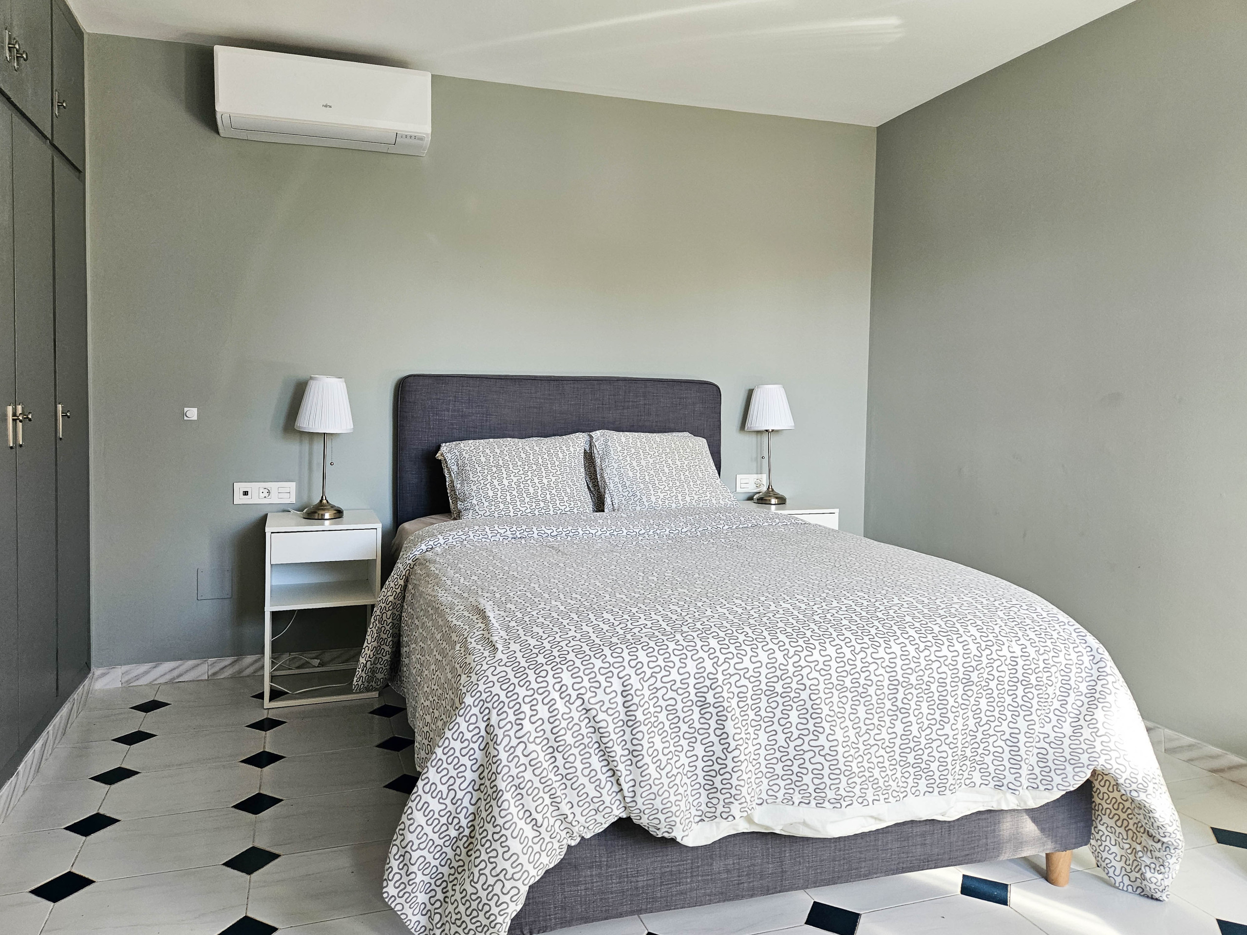 La villa está distribuida en dos niveles con acceso desde la calle. El espacioso interior cuenta con dos salas de estar. La primera sala de estar acogedora ofrece un área de comedor, dos sofás y un TV de 40 pulgadas con canales internacionales. Continuando, se accede a la segunda sala de estar luminosa y diáfana, de planta abierta, y a la cocina. La sala de estar está amueblada con un área de comedor y dos sofás. Aquí podrá disfrutar de las vistas a la piscina, el jardín y vistas parciales al mar. La cocina está bien equipada con una barra de desayuno y taburetes. Desde la cocina, salga a la terraza cerrada, amueblada con un área de comedor adicional. (Desde aquí, baje las escaleras al jardín y la zona de la piscina). En este nivel, también encontrará una de las habitaciones, amueblada con una cama king size, armario y tocador con silla. Junto a la habitación hay un baño familiar, equipado con bañera con ducha.