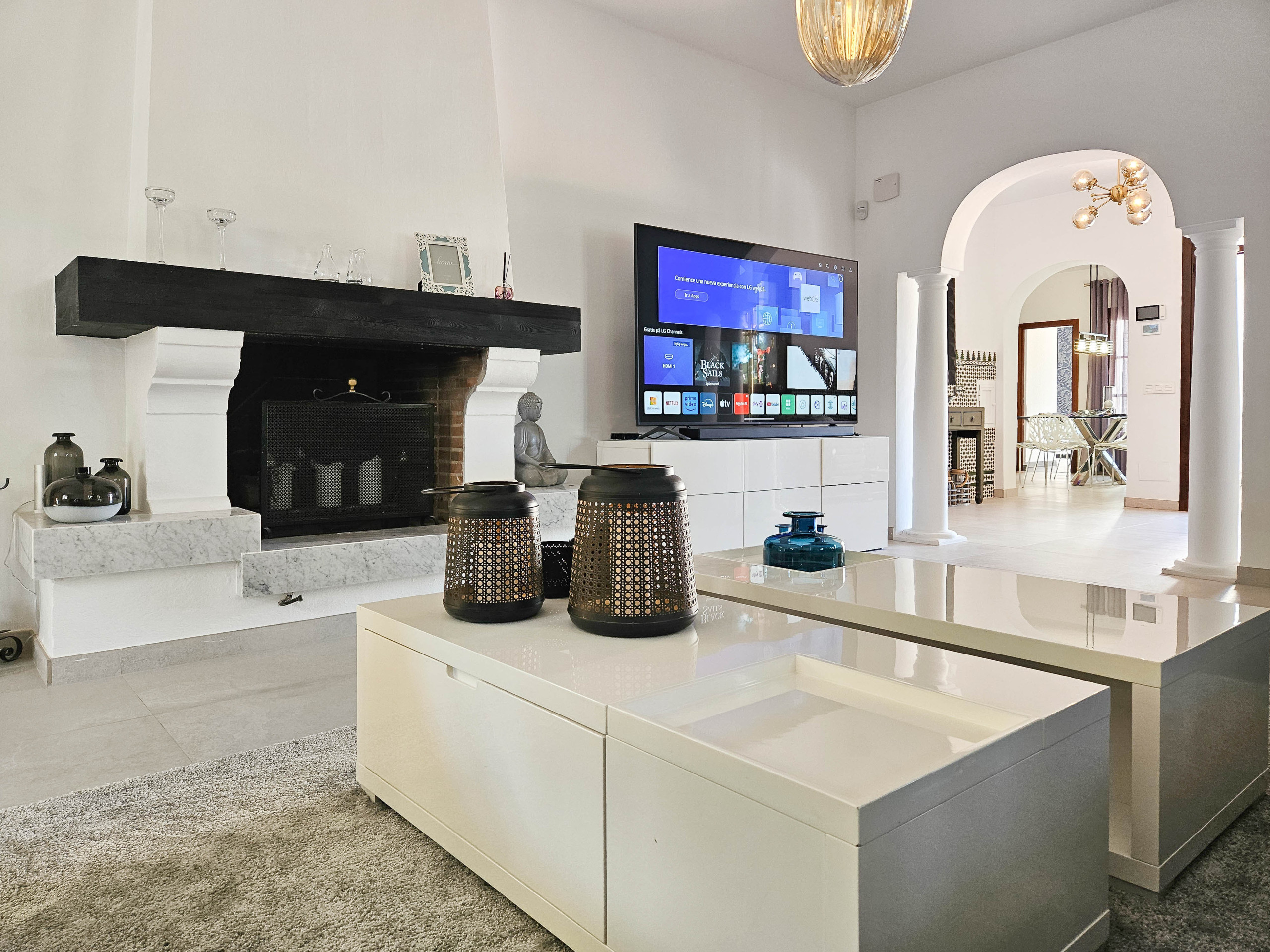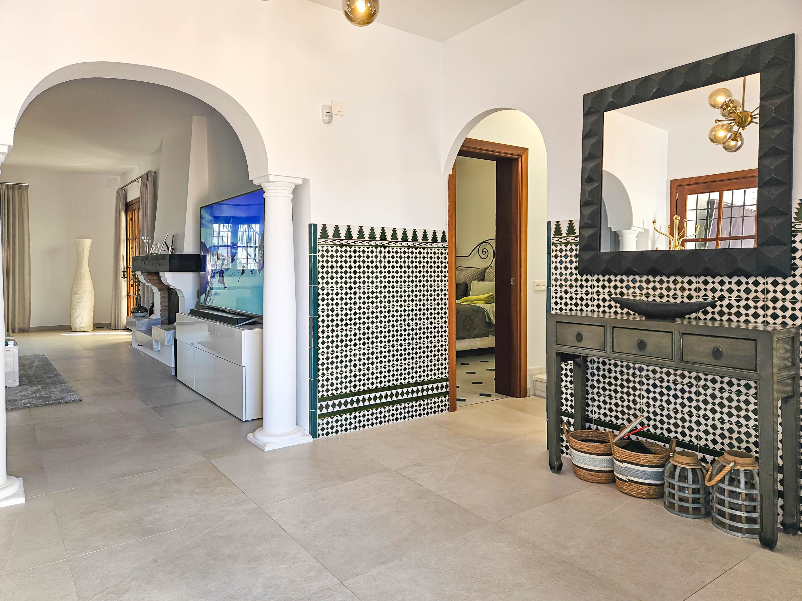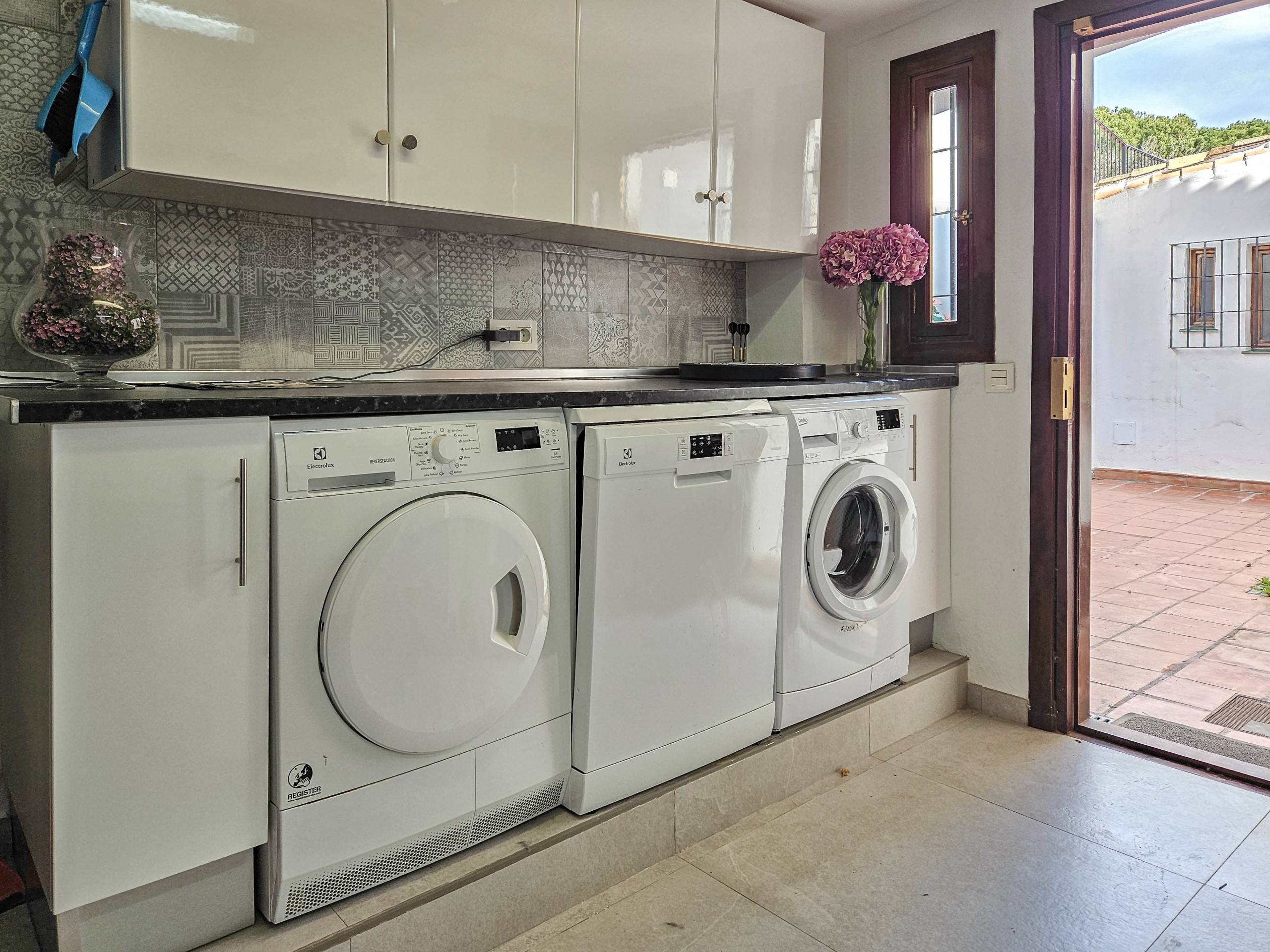La villa está amueblada con gusto en toda su extensión y está distribuida en dos niveles. El hall de entrada da acceso a la cocina independiente y totalmente equipada, que se beneficia de un frigorífico americano, una isla de cocina con barra de desayuno y taburetes y una sala de servicio independiente, con lavadora y secadora. El espacioso salón de niveles divididos está amueblado con una zona de comedor, que conduce a la sala de estar, donde se puede disfrutar del cómodo sofá en forma de L, un sillón y un televisor inteligente, con canales internacionales. La terraza cubierta, el jardín y la piscina se pueden acceder desde las zonas de salón y comedor.
