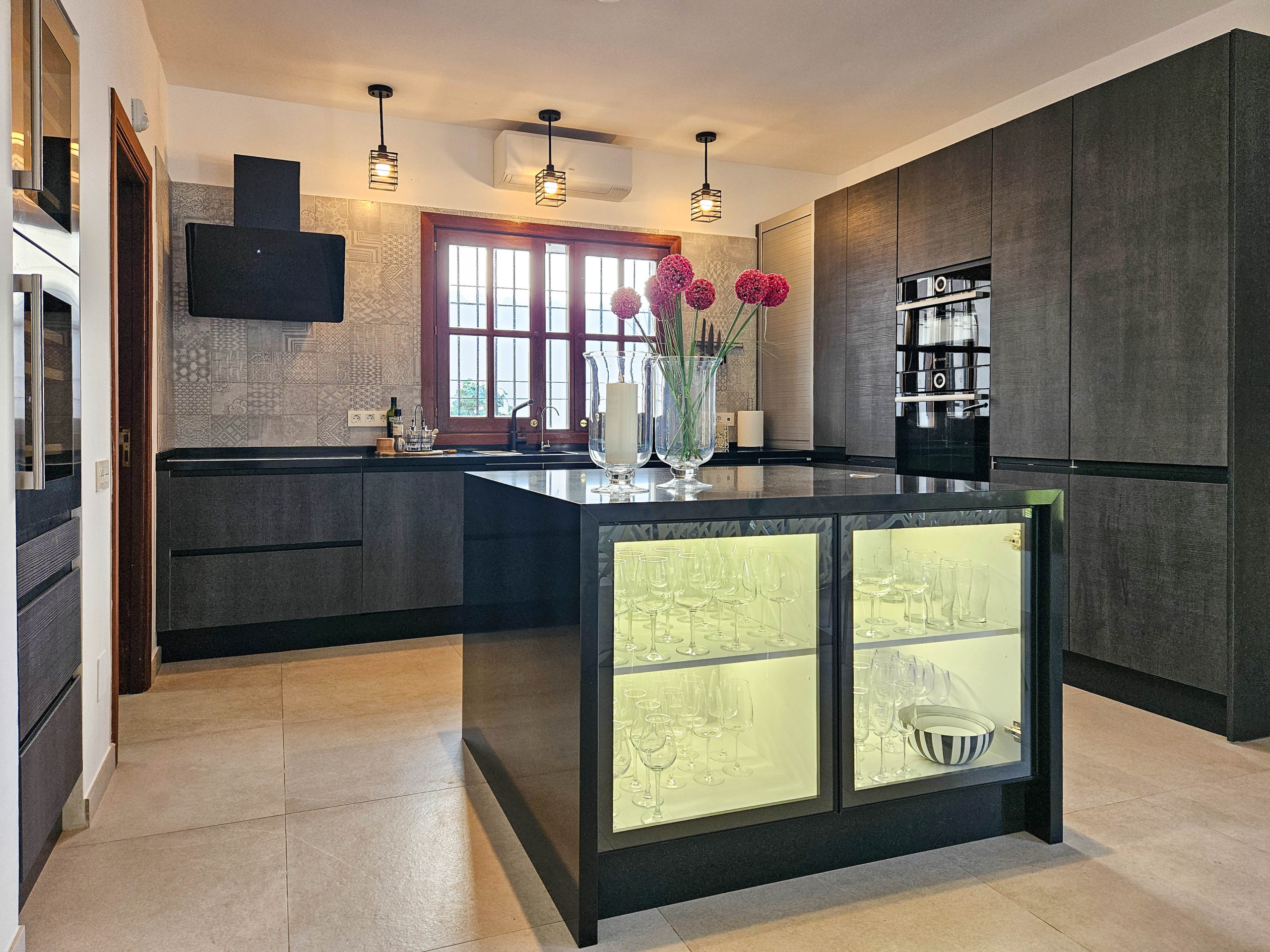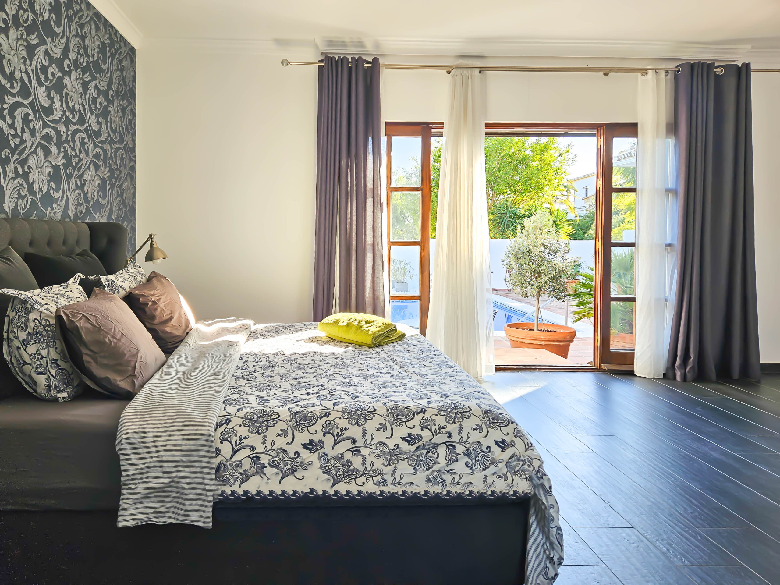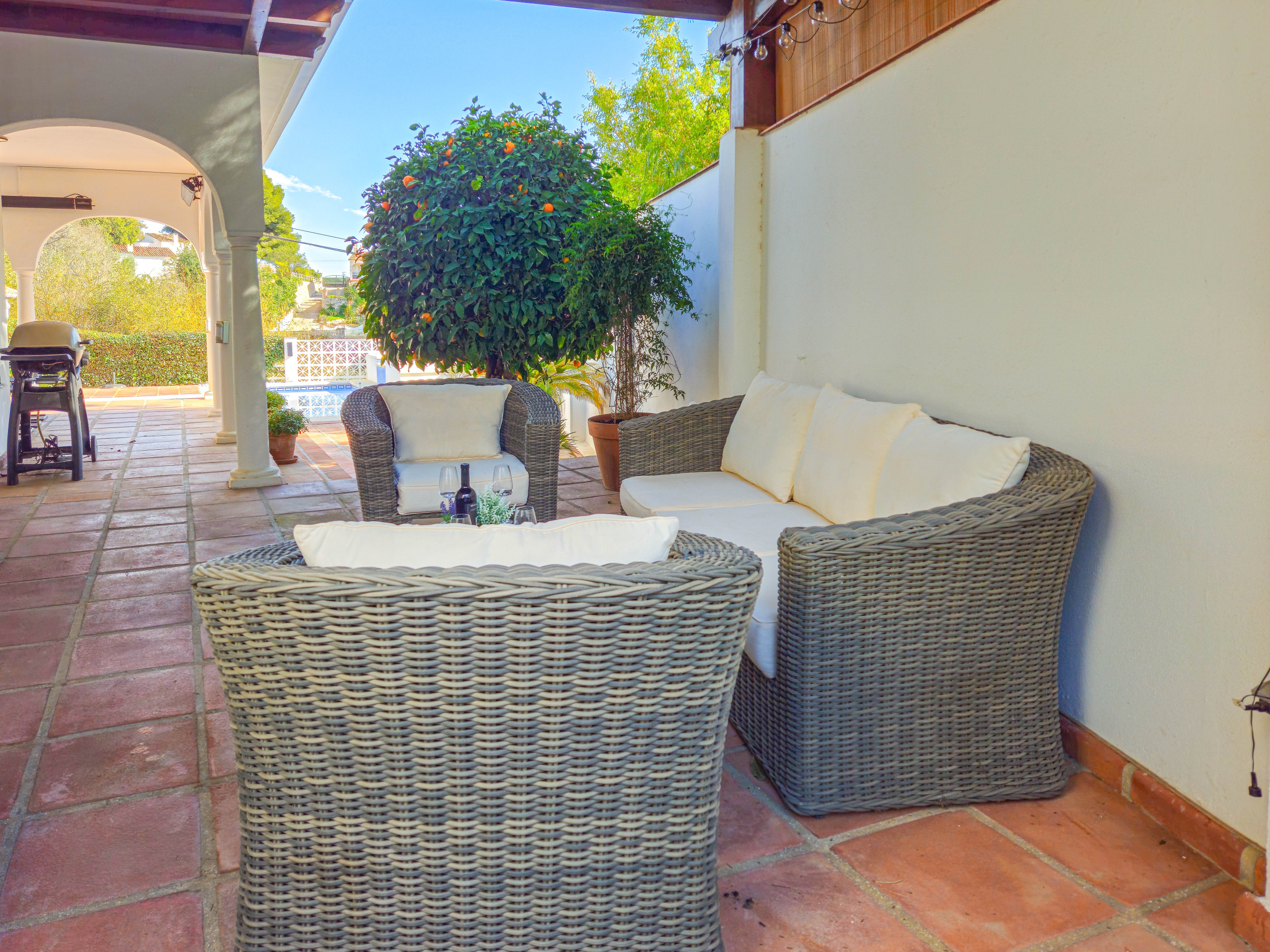 Accede a la terraza de la piscina y al jardín desde la terraza de la entrada principal, la terraza de la cocina o el dormitorio principal. Relájate junto a la piscina en los tumbonas y sillas. Hay una terraza cubierta amueblada con un salón y un área de comedor, una barbacoa de gas y una cocina pequeña, equipada con un fregadero, nevera y microondas. También hay un gran jardín con césped en la parte trasera de la villa, además de un aseo.