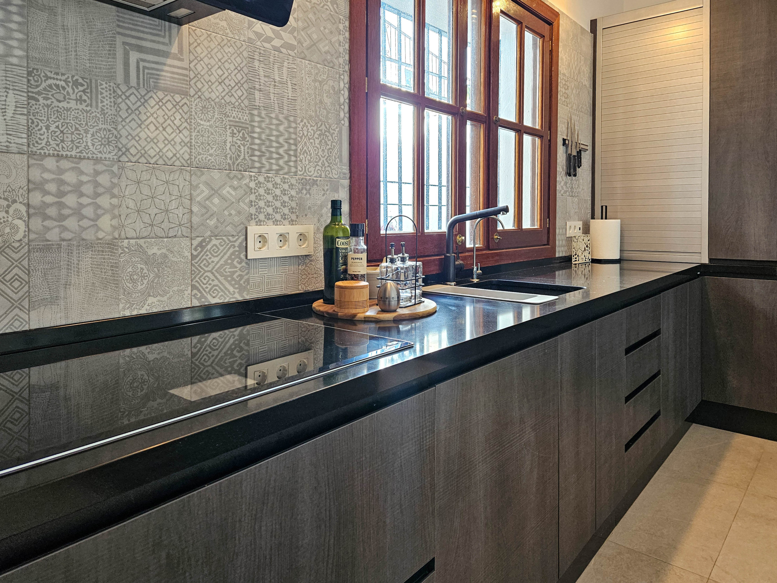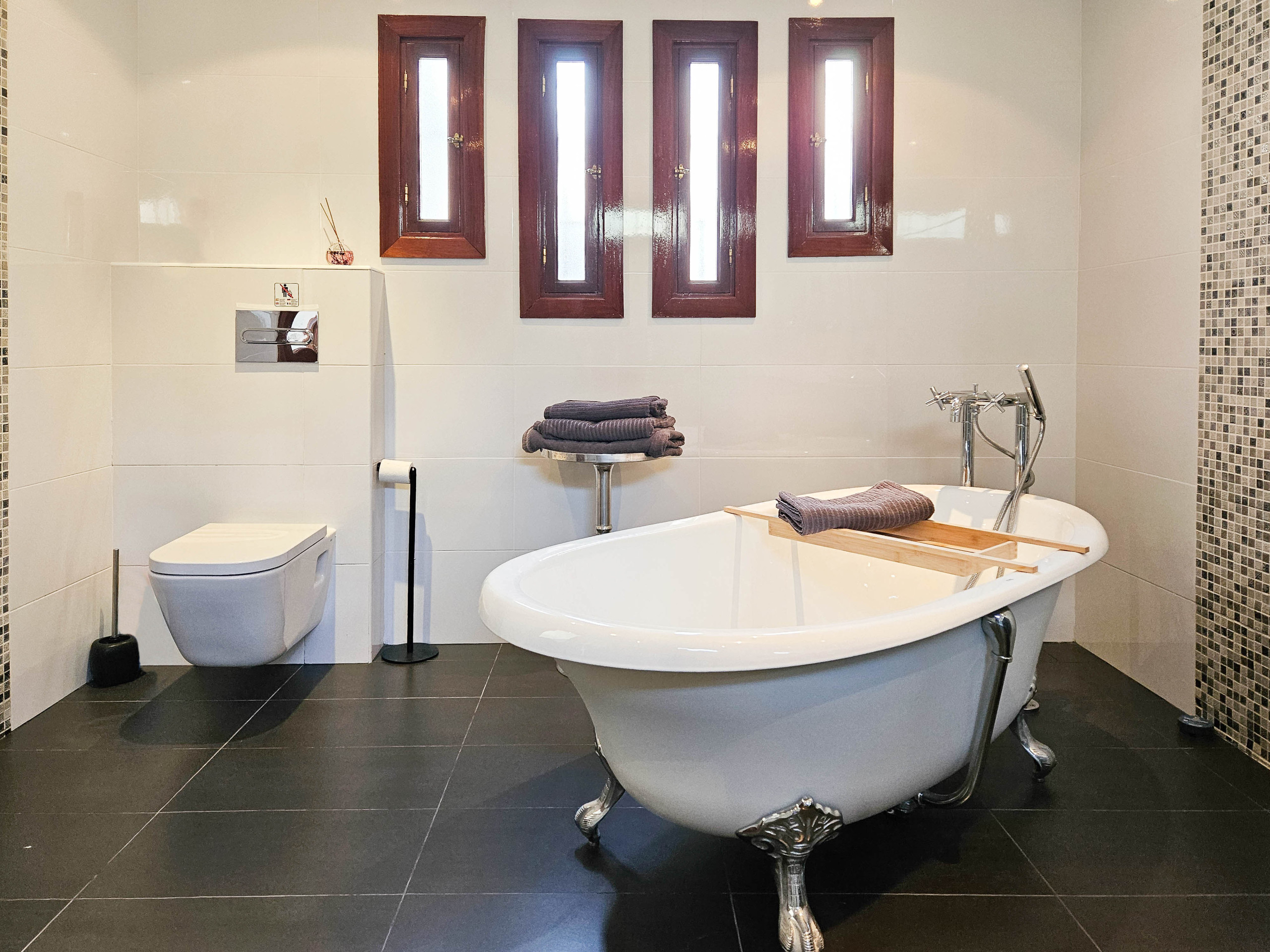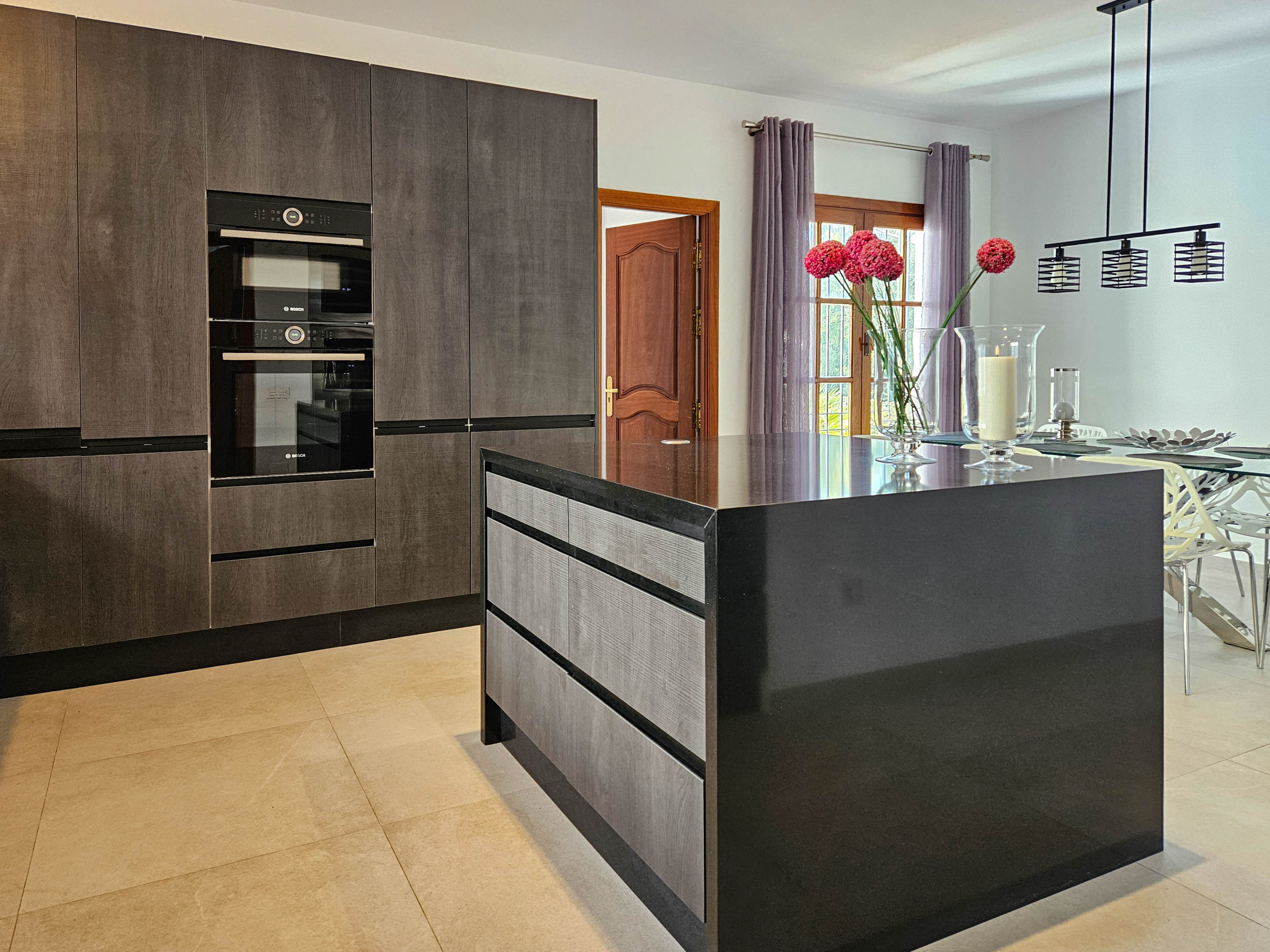 Accede a la terraza de la piscina y al jardín desde la terraza de la entrada principal, la terraza de la cocina o el dormitorio principal. Relájate junto a la piscina en los tumbonas y sillas. Hay una terraza cubierta amueblada con un salón y un área de comedor, una barbacoa de gas y una cocina pequeña, equipada con un fregadero, nevera y microondas. También hay un gran jardín con césped en la parte trasera de la villa, además de un aseo.
