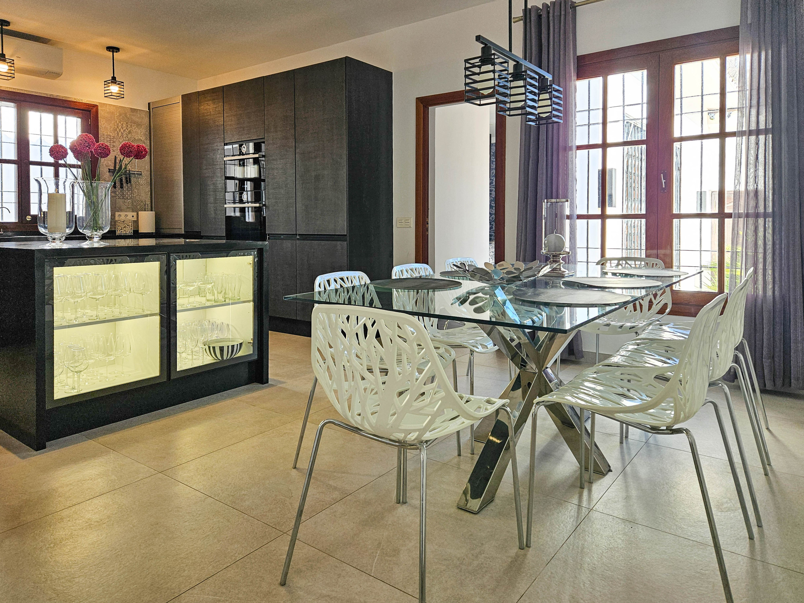 La villa está amueblada con gusto, es moderna. Tiene vistas al jardín y a la piscina.