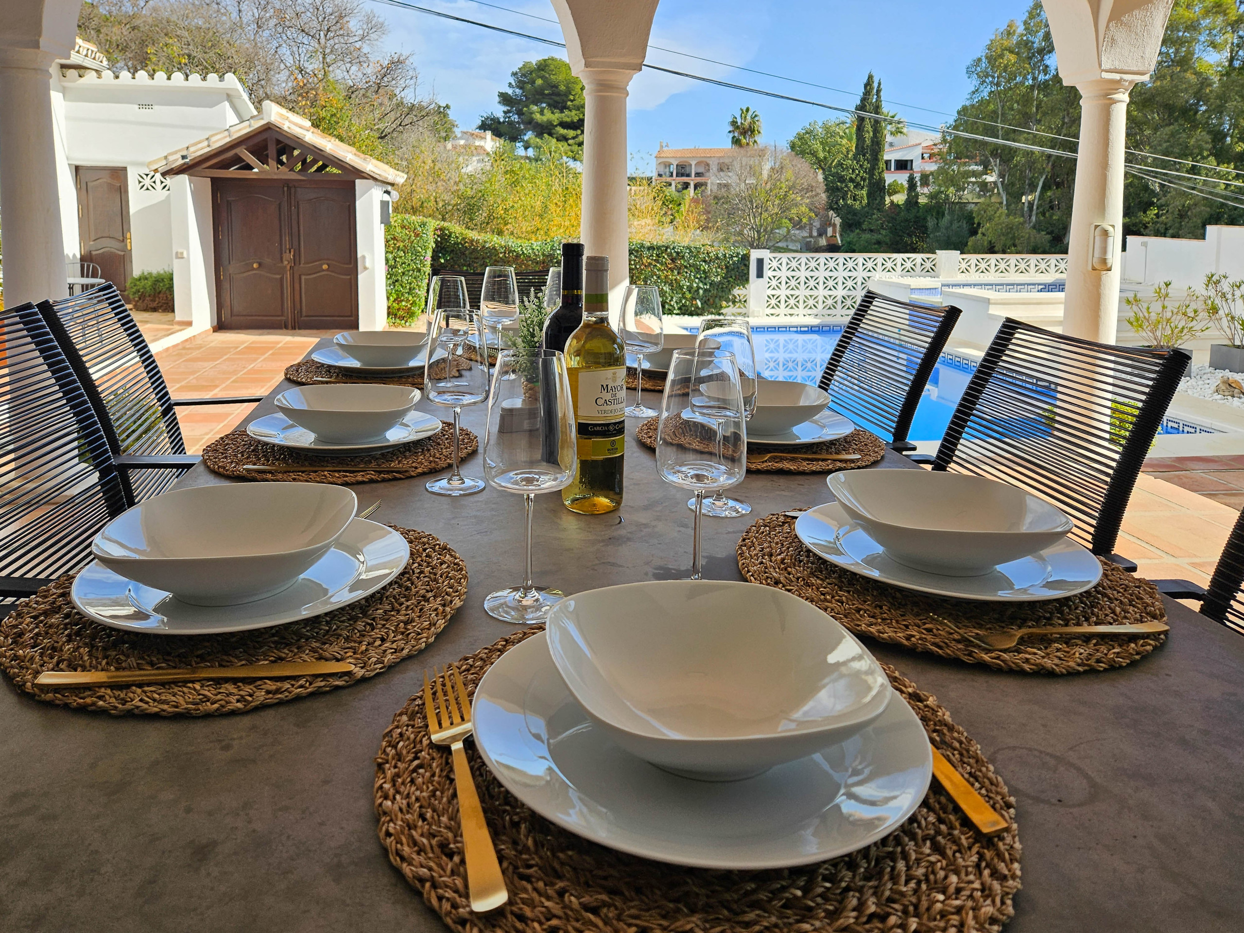 La villa en Mijas Costa tiene 4 dormitorios y capacidad para 8 personas.