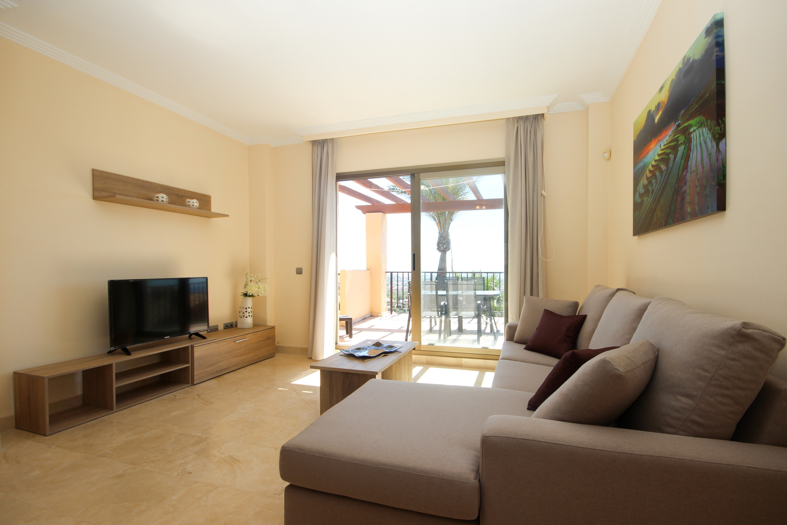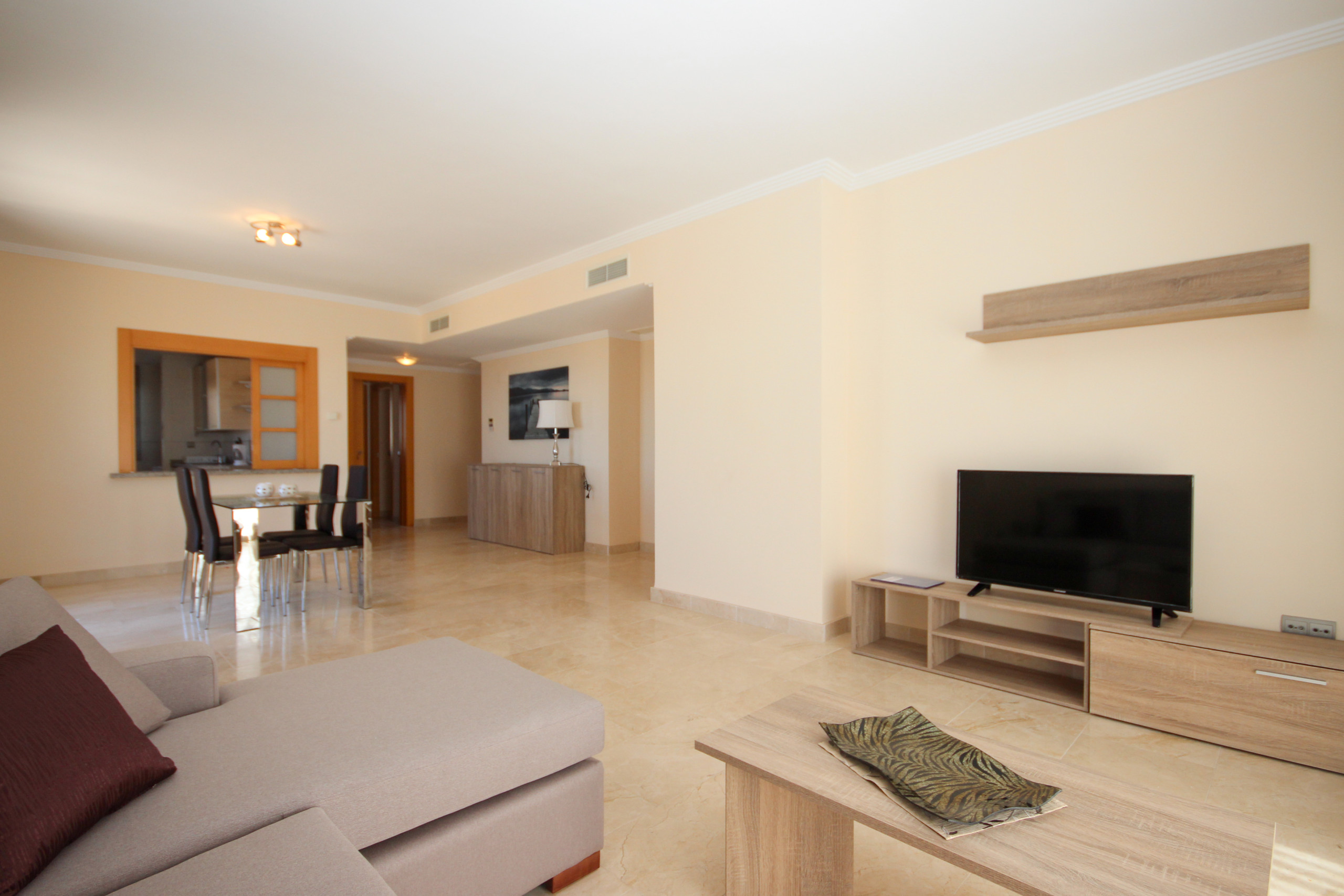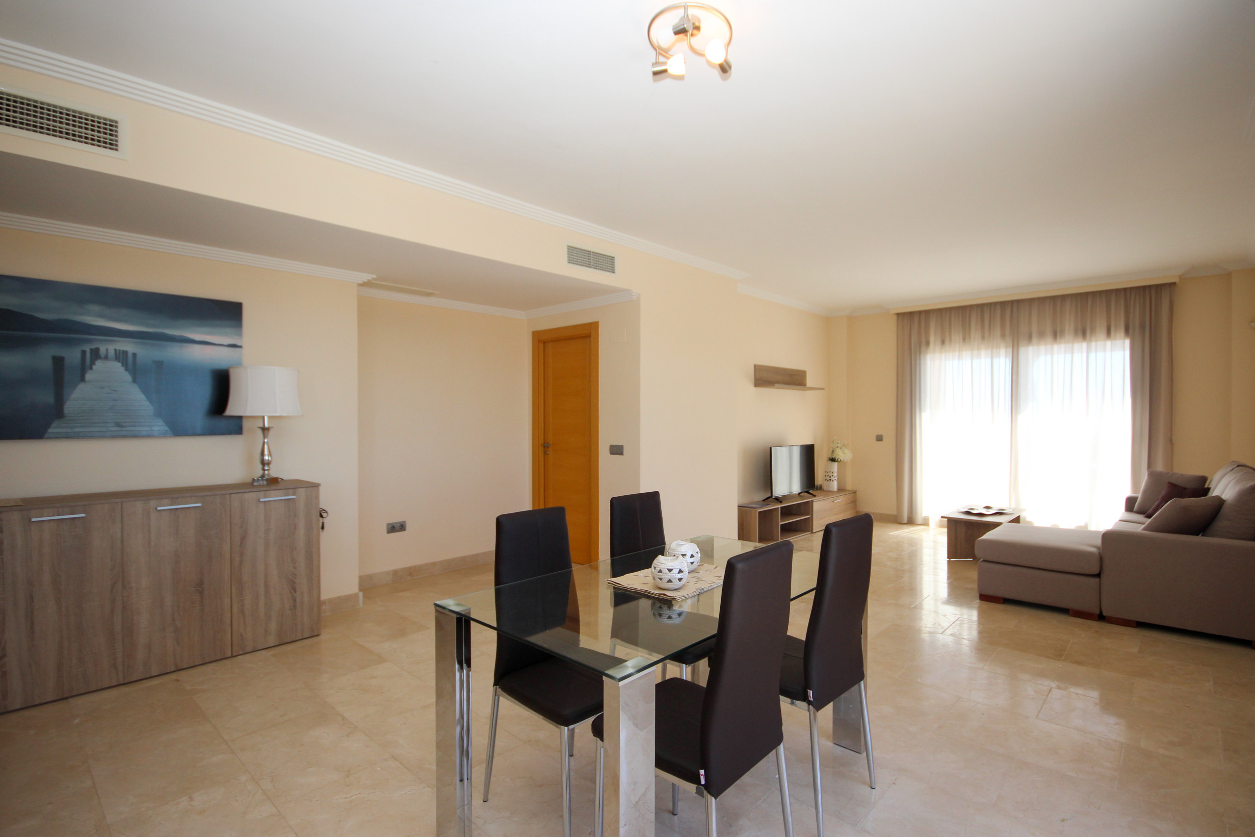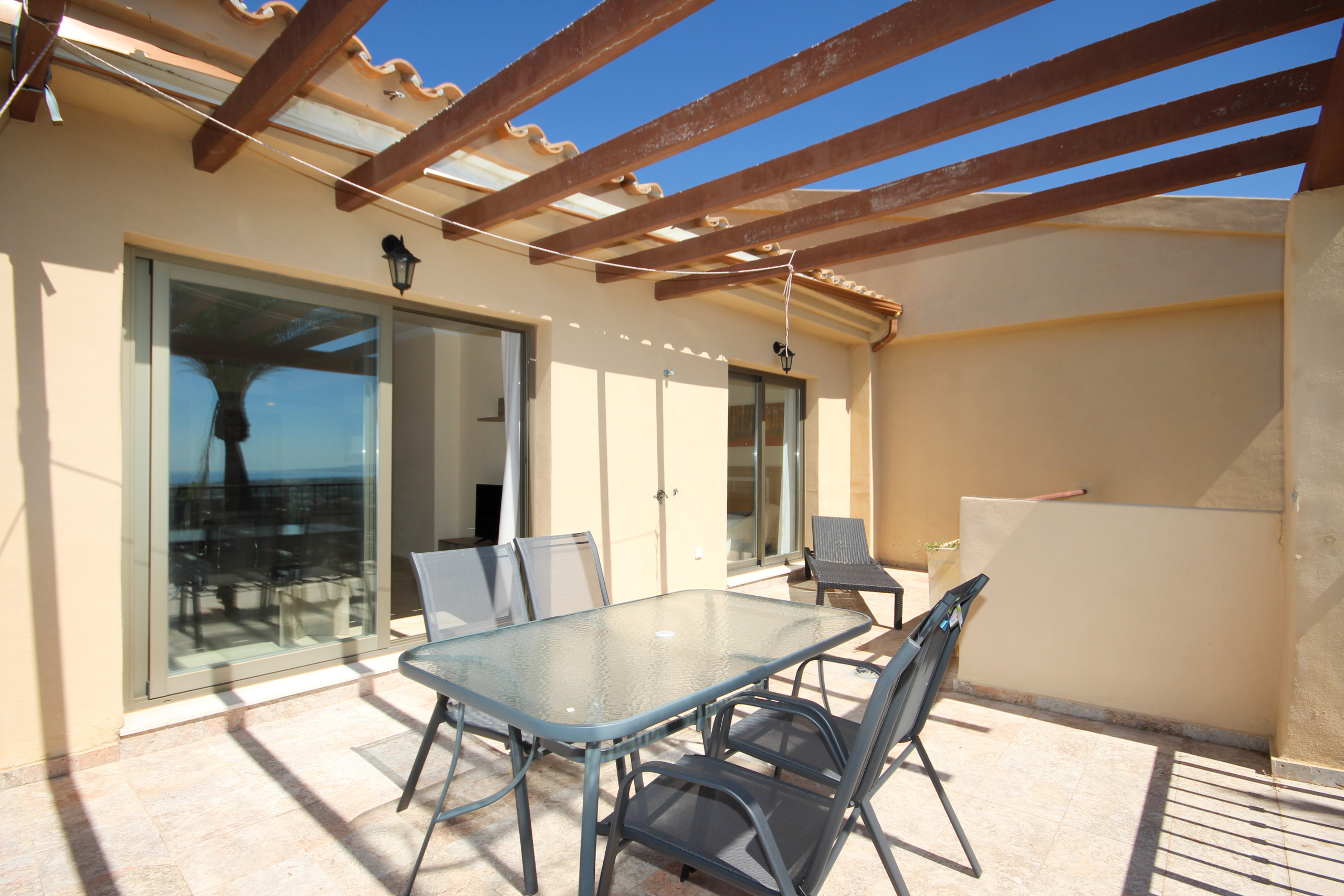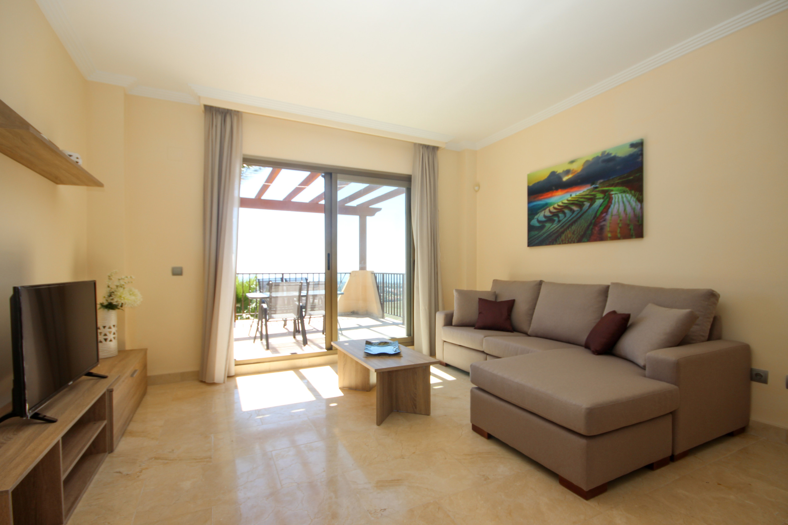 The second bedroom has twin beds and fitted wardrobes. There is a good sized fitted kitchen with all appliances including dishwasher and washing machine, coffee maker etc. The lounge and dining area is very spacious and has a large flatscreen TV, dining table, comfortable L shaped sofa and leads out onto both the main terrace as well as the side terrace which also has views down over the pool area.