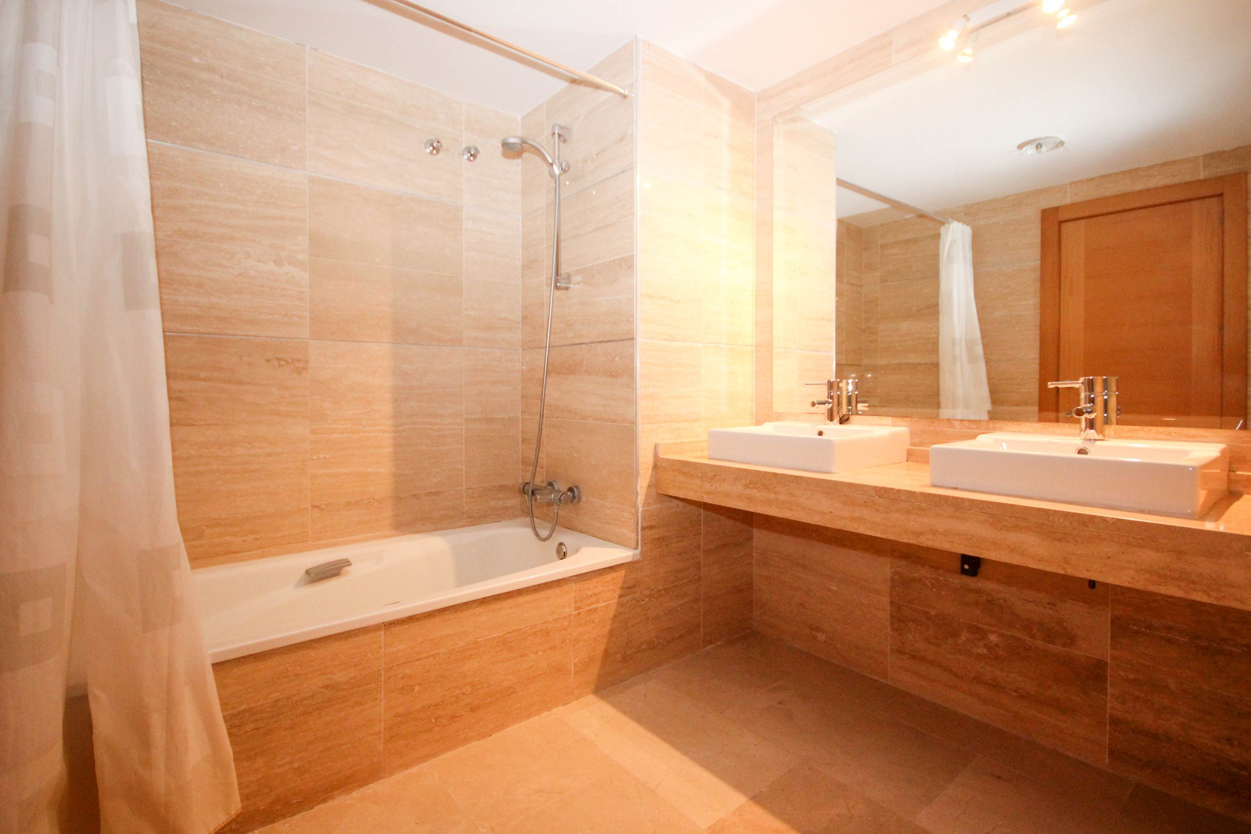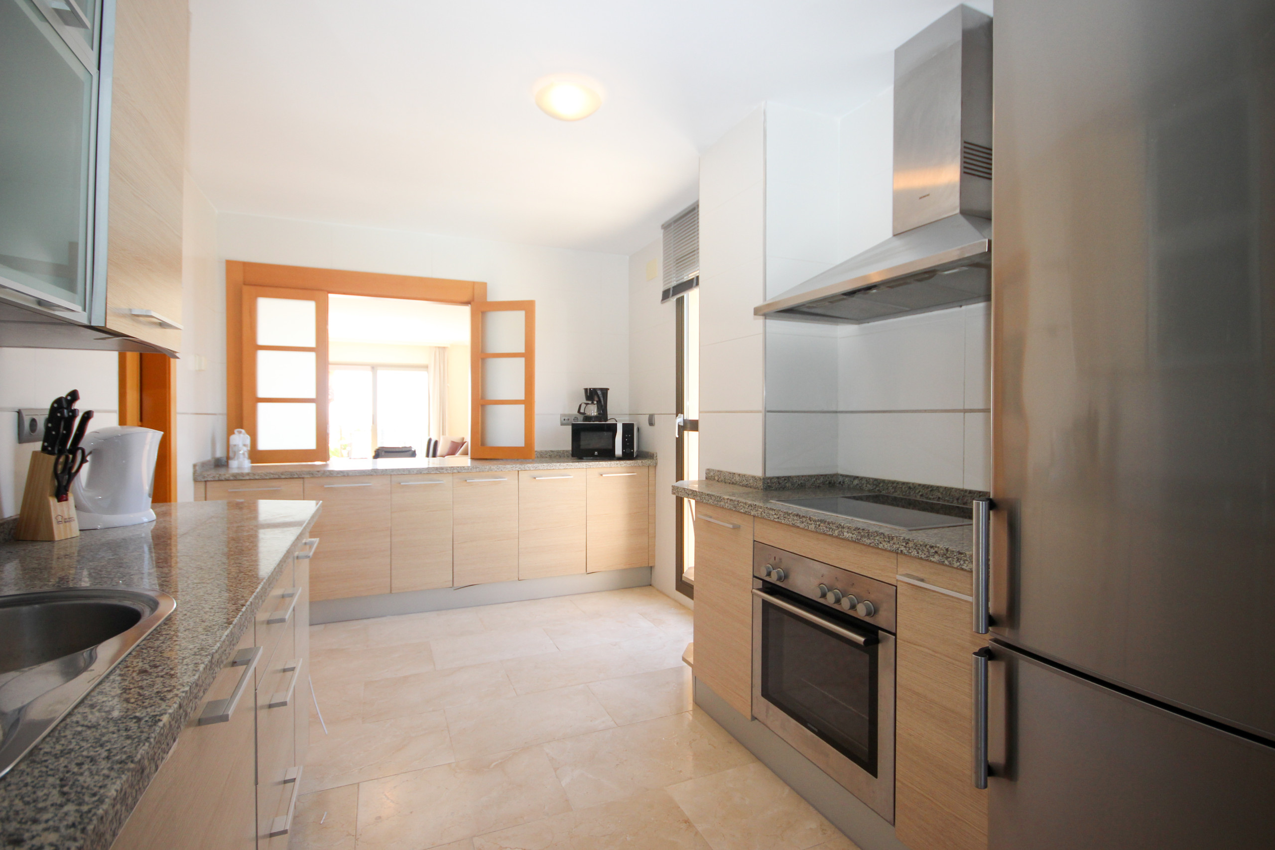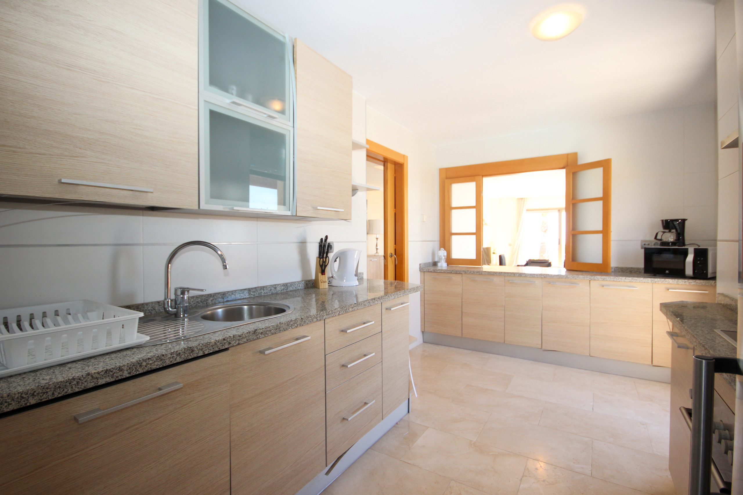 This apartment is located on the 1st floor and is arranged over one floor. The separate kitchen is located at the entrance and is fully equipped including an under counter fridge. The open plan lounge/diner offers a dining area for 4 people, a sofa, 2 chairs and a 55" smart TV with international channels. From the lounge is access to the terrace, which benefits from a further dining area for 4 people.