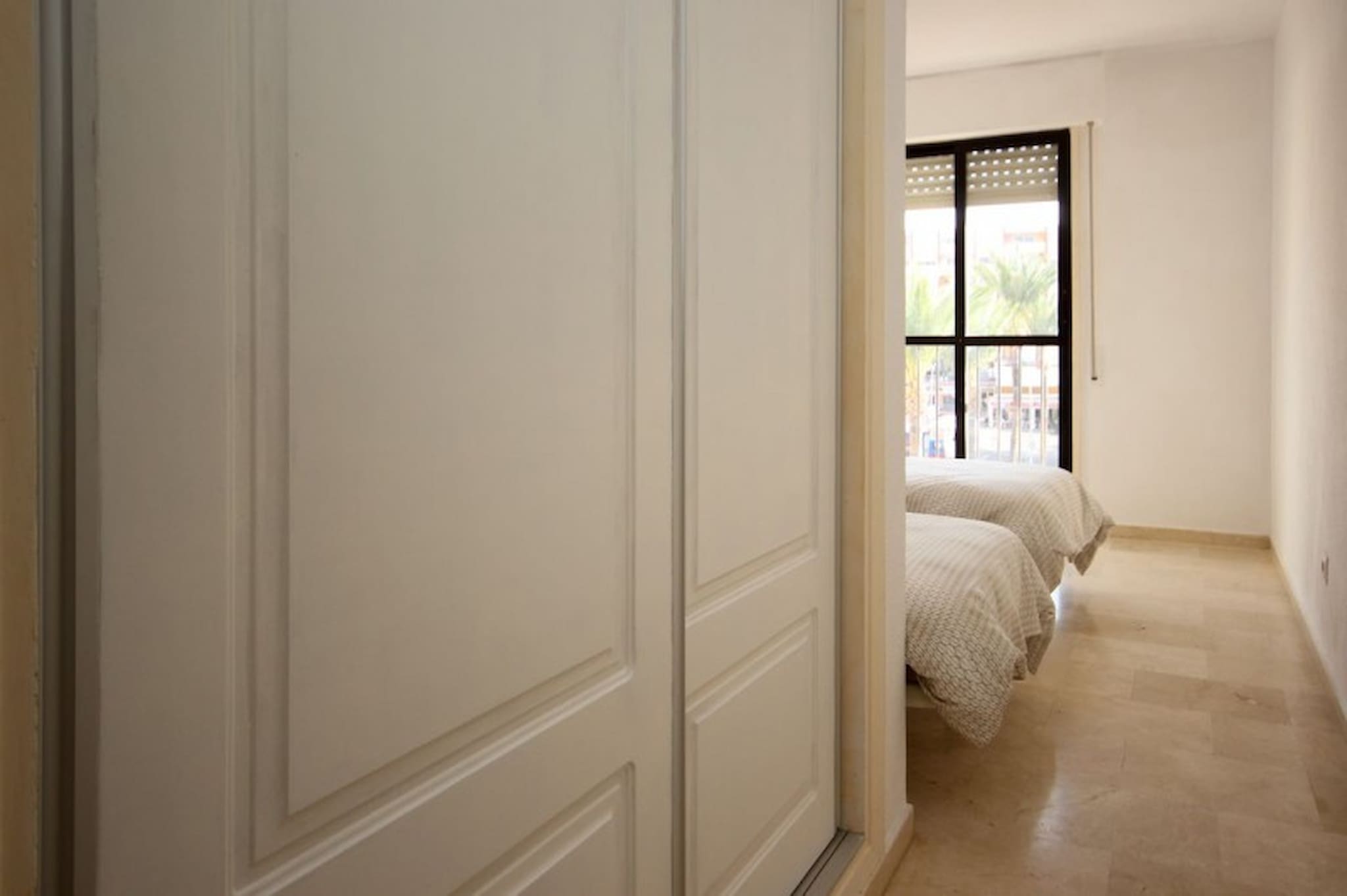The master bedroom benefits from a super king size bed, fitted wardrobes and has an en suite shower room. The shower room is fitted with a large walk in shower, a bidet and double sinks. The guest bedroom is furnished with a king size bed and fitted wardrobes. Both bedrooms have access onto a shared terrace, with a table and chairs and stunning views over the Marina. There is also access to a guest bathroom, fitted with a bath and shower attachment, and a bidet.