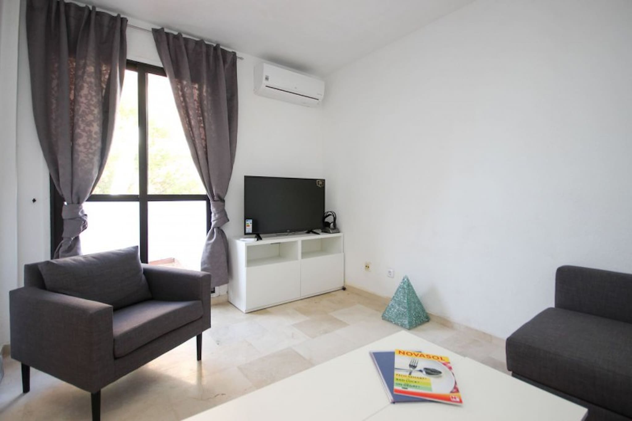 The apartment is located on the ground floor, arranged over one floor and is tastefully furnished to a high standard. The open plan living space offers a fully equipped kitchen, with a separate utility room and small breakfast bar with stools. Leading out from the kitchen is the terrace garden area, furnished with a dining seating area and sun loungers. The lounge benefits from a large comfortable L shaped sofa bed, that can be pulled out to make a king size bed. There is also an armchair and a 49¨TV. Leading out from the lounge you enter the covered part of the terrace, where you can enjoy the dining area for up to six people and a lounge seating area. From here you can enjoy the views to the pool and grounds.