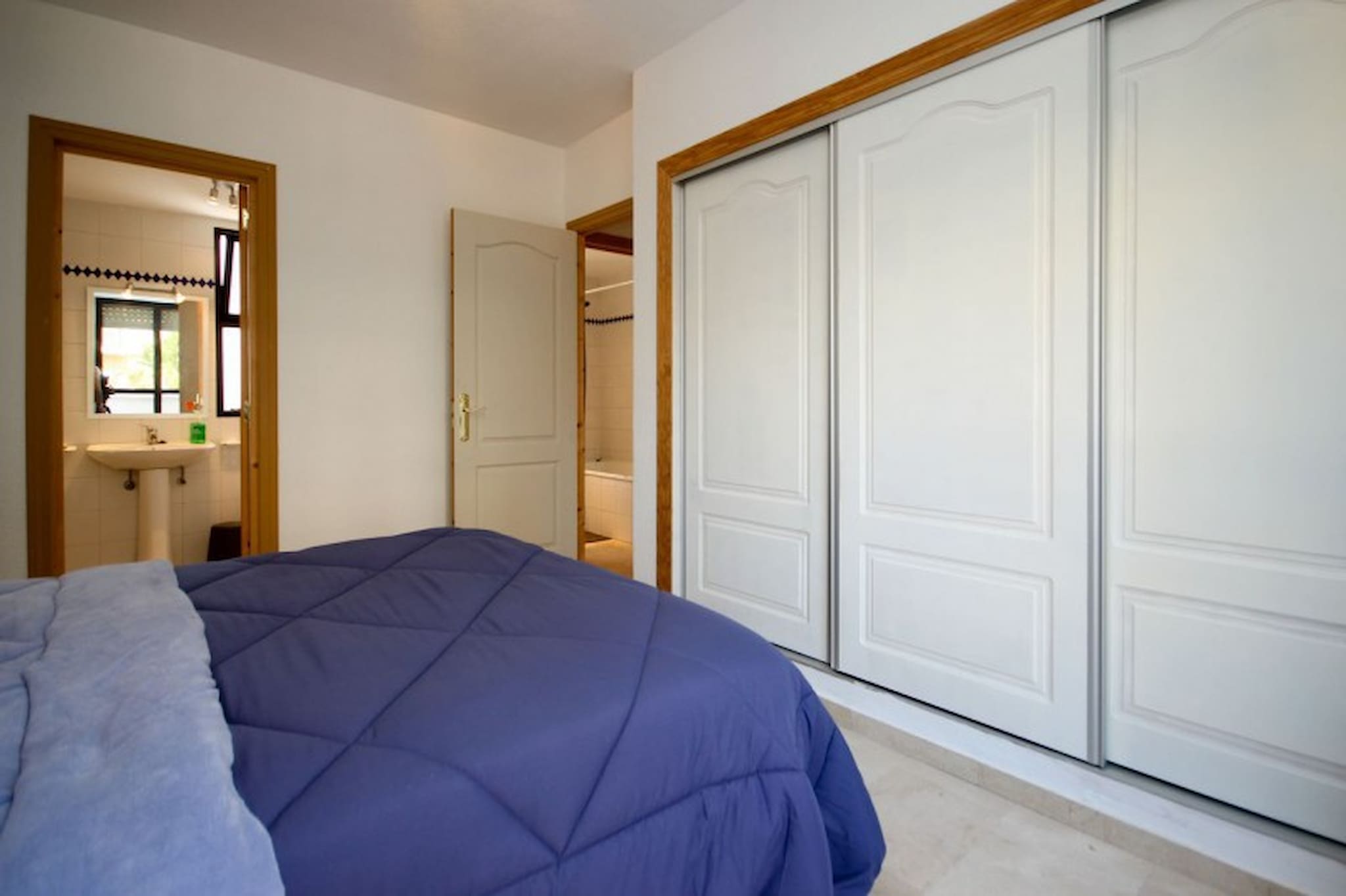 The master bedroom is furnished with a king size bed. There is ample storage space with the fitted wardrobes and high and low units. There is also a work station, a 32¨TV and an en suite bathroom with a bath and shower attachment. The master bedroom enjoys direct access onto the terrace. The guest bedroom is furnished with twin beds, fitted wardrobes and has direct access to the terrace garden. This bedroom has use of the guest shower room.