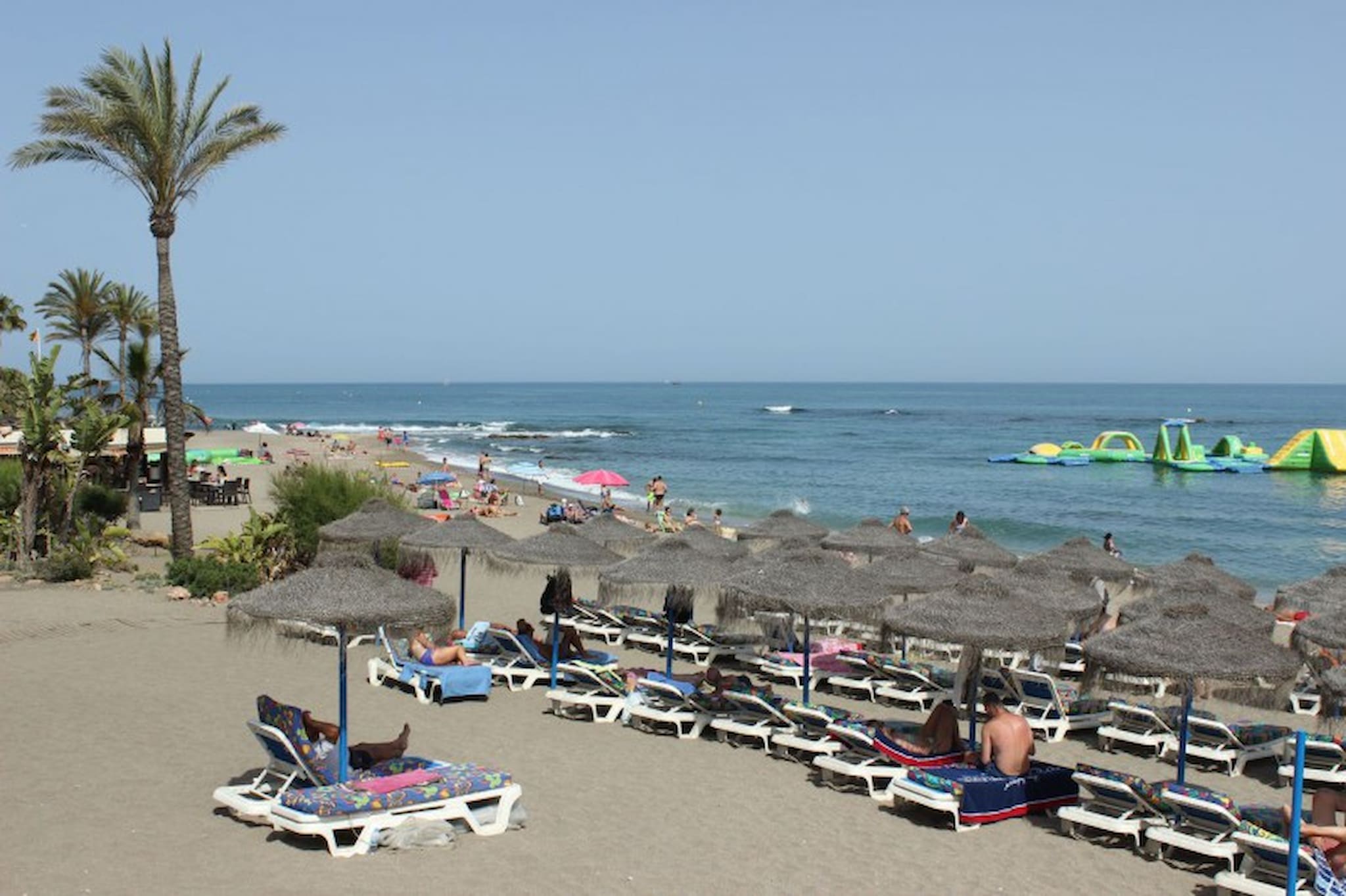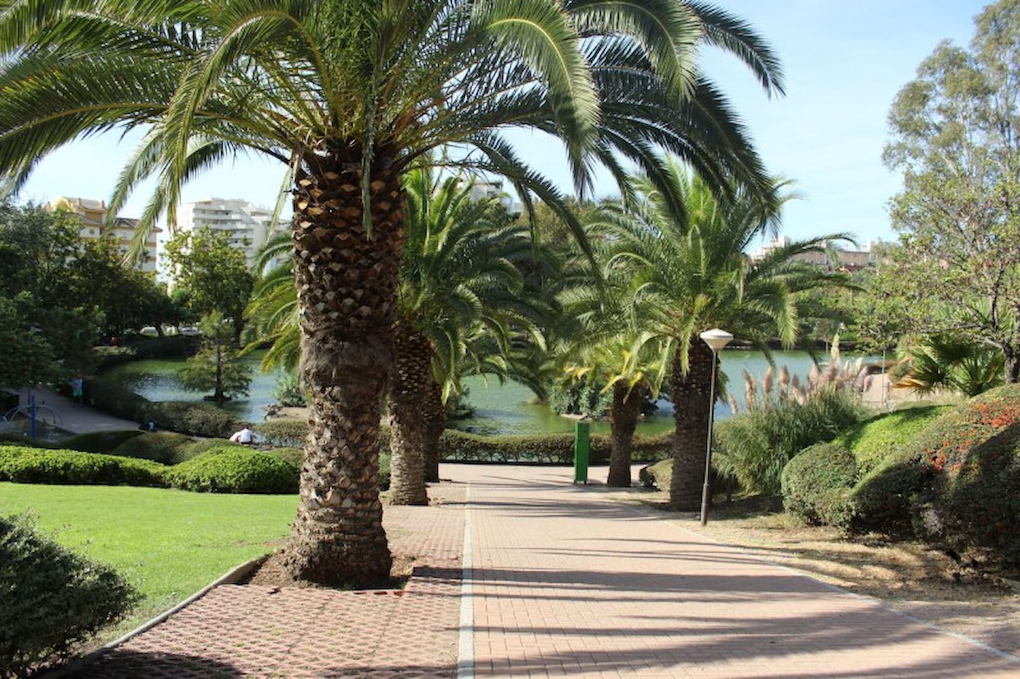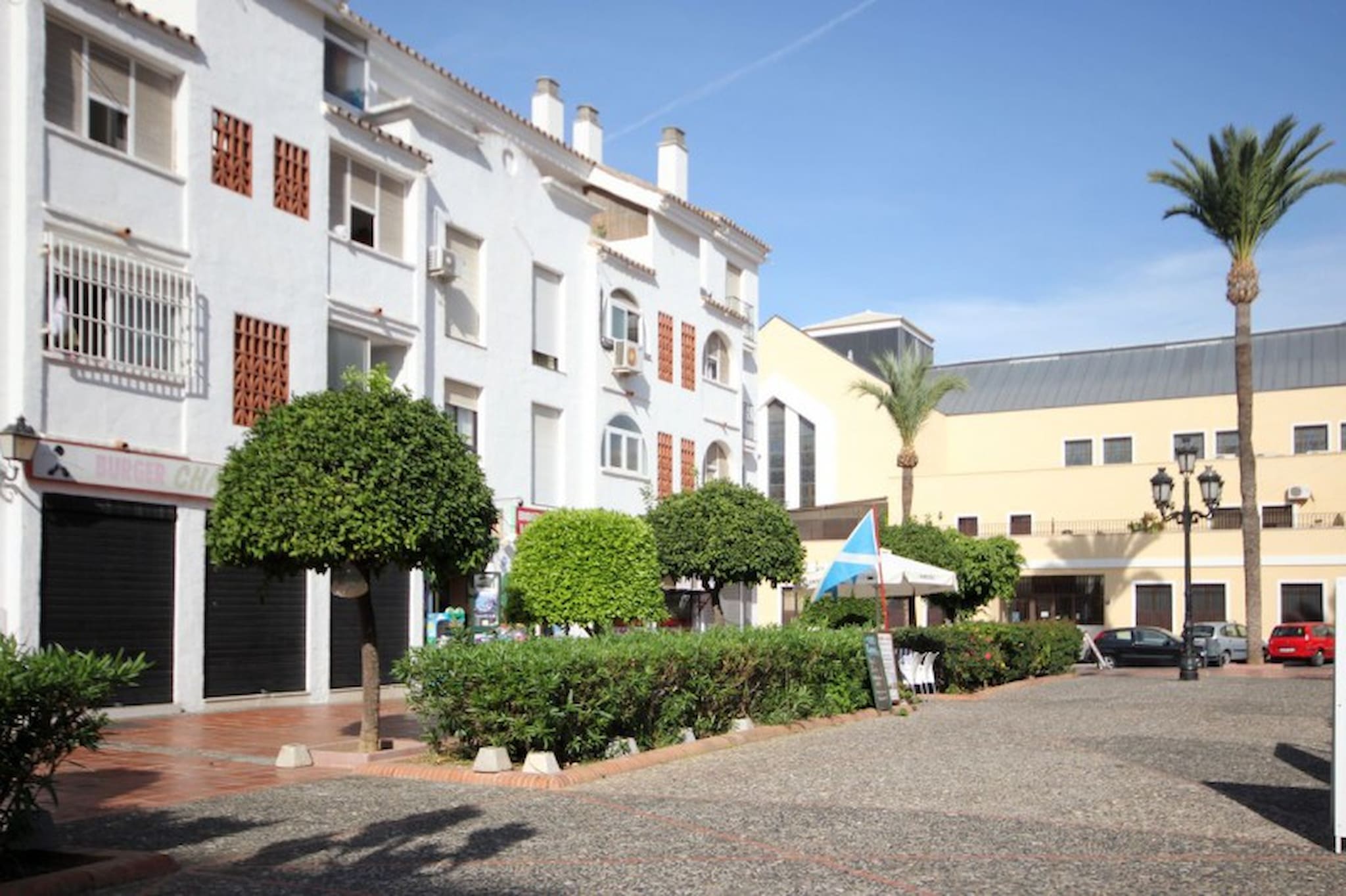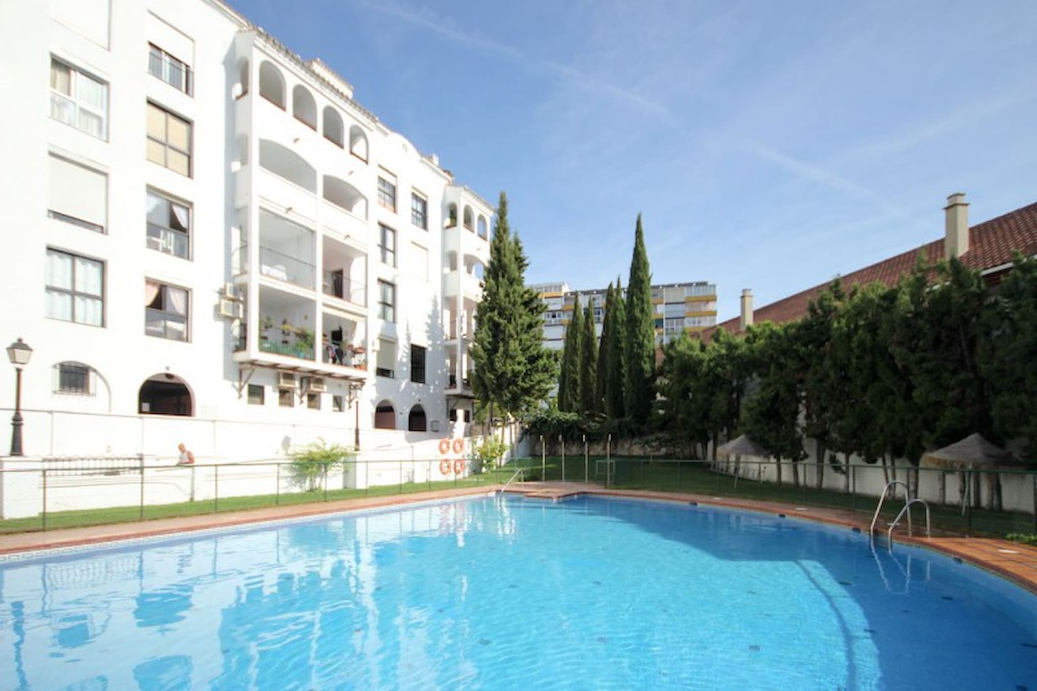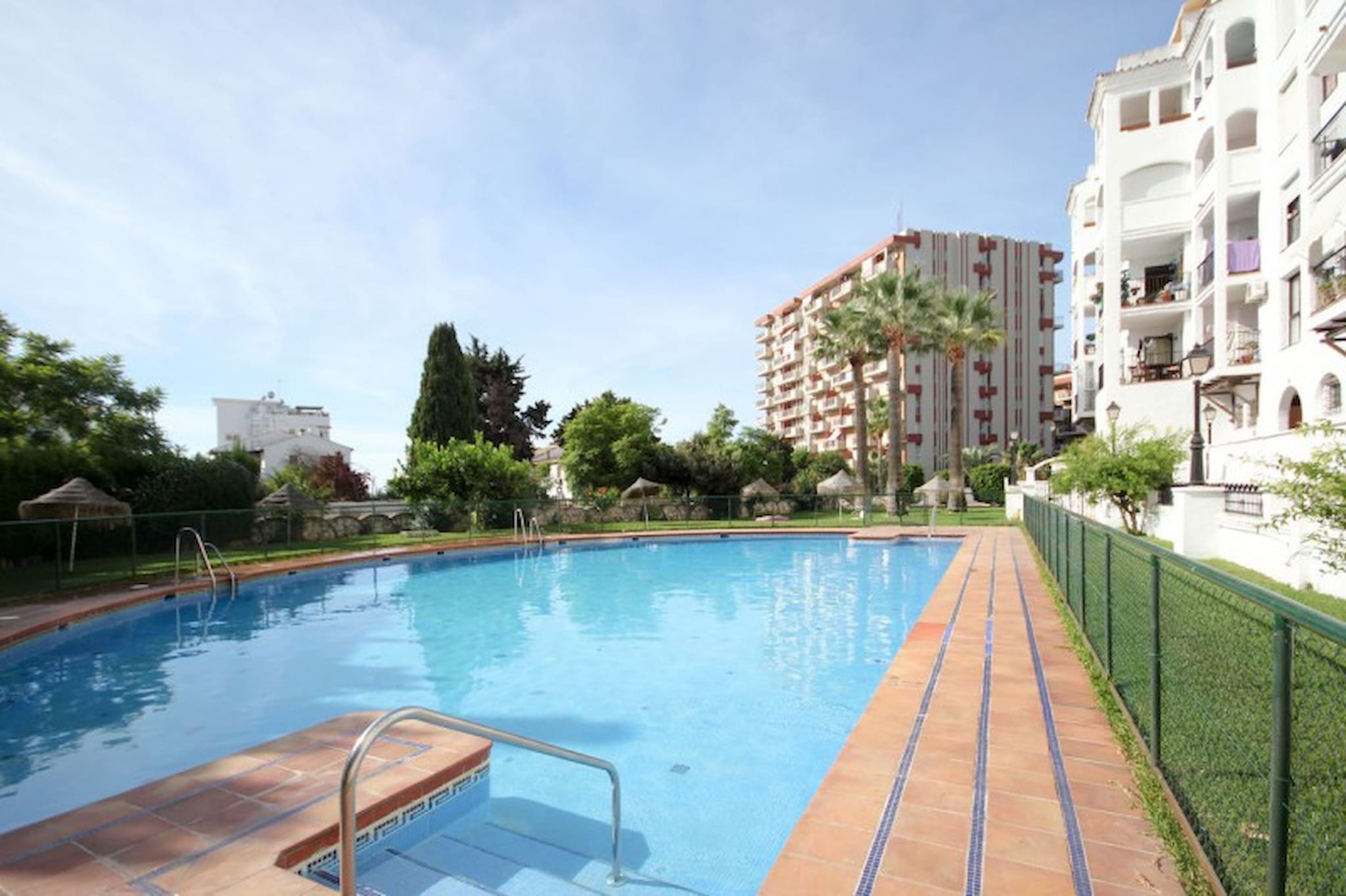 This street complex offers a large gated and private pool area and is located within walking distance to the beach, the long promenade featuring many restaurants, bars, shops and supermarkets, and the beautiful Paloma Park where you can take relaxing walks through the manicured pathways, have a coffee in the café, stroll around the lake and interact with the parks wildlife including rabbits, hens and other birdlife. This 3rd floor apartment is accessed by stairs (no lift) and is arranged over one floor. The lounge/diner is furnished with a sofa bed, TV, armchair and dining table and chairs. The dining area leads out onto the west facing terrace, which is fitted with a terrace sofa and chairs and has views over the tree lined streets and to the sea (awning not in use). The kitchen is fully fitted.The master bedroom is fitted with a double bed and benefits from a small terrace and full en suite bathroom. The guest bedroom is furnished with twin beds and has use of the full guest bathroom.