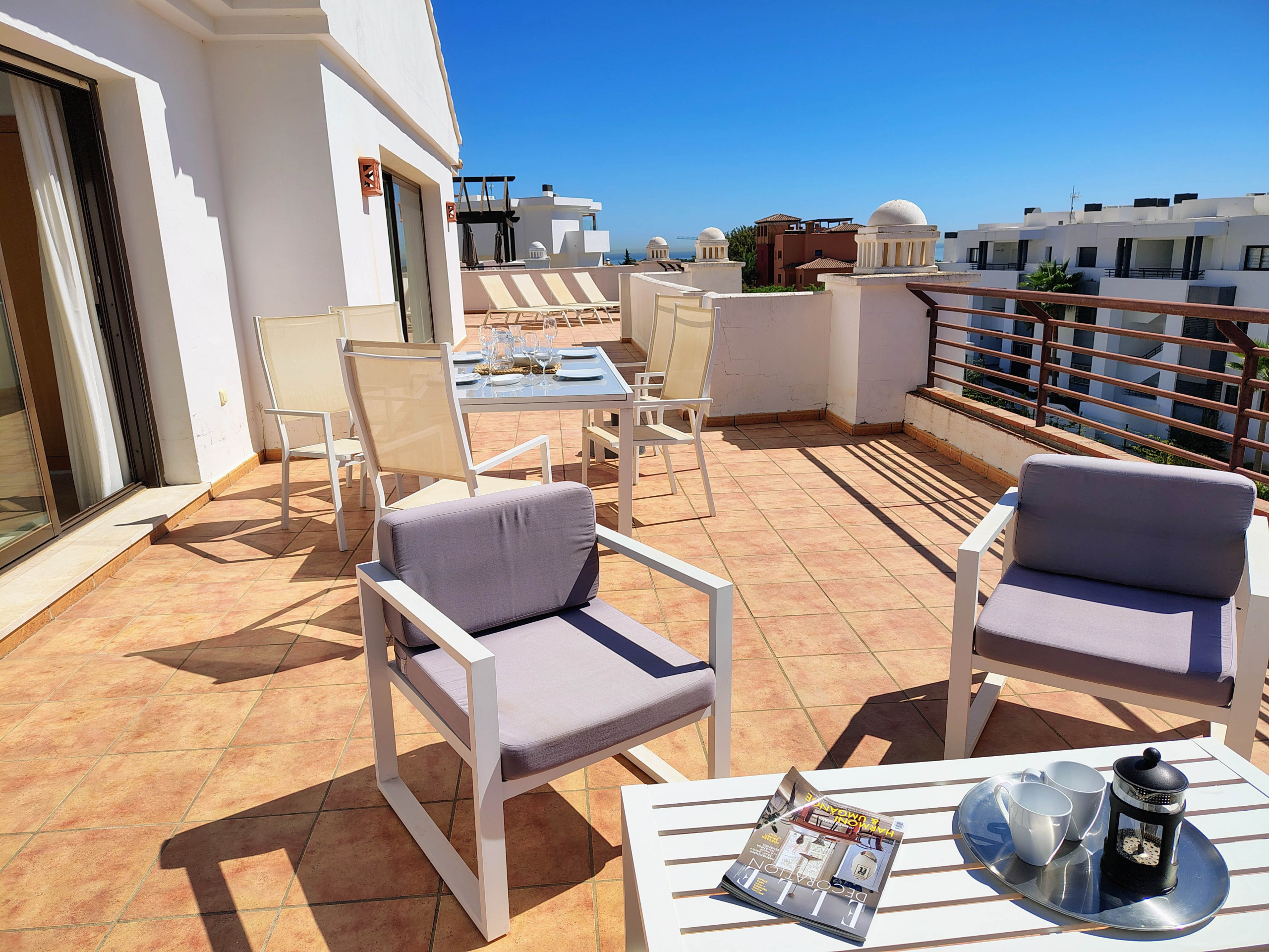 Live the dream of being one of the first in a new professionally decorated 2 bedroom apartment. Set right on the beach in Casares del Mar, Casares, this spacious apartment has top of the range furnishings and a south facing terrace. The terrace offers amazing views over the complex pool to the sea. The terrace is furnished with a sofa and armchairs and a dining table and chairs. There is also a gas BBQ.