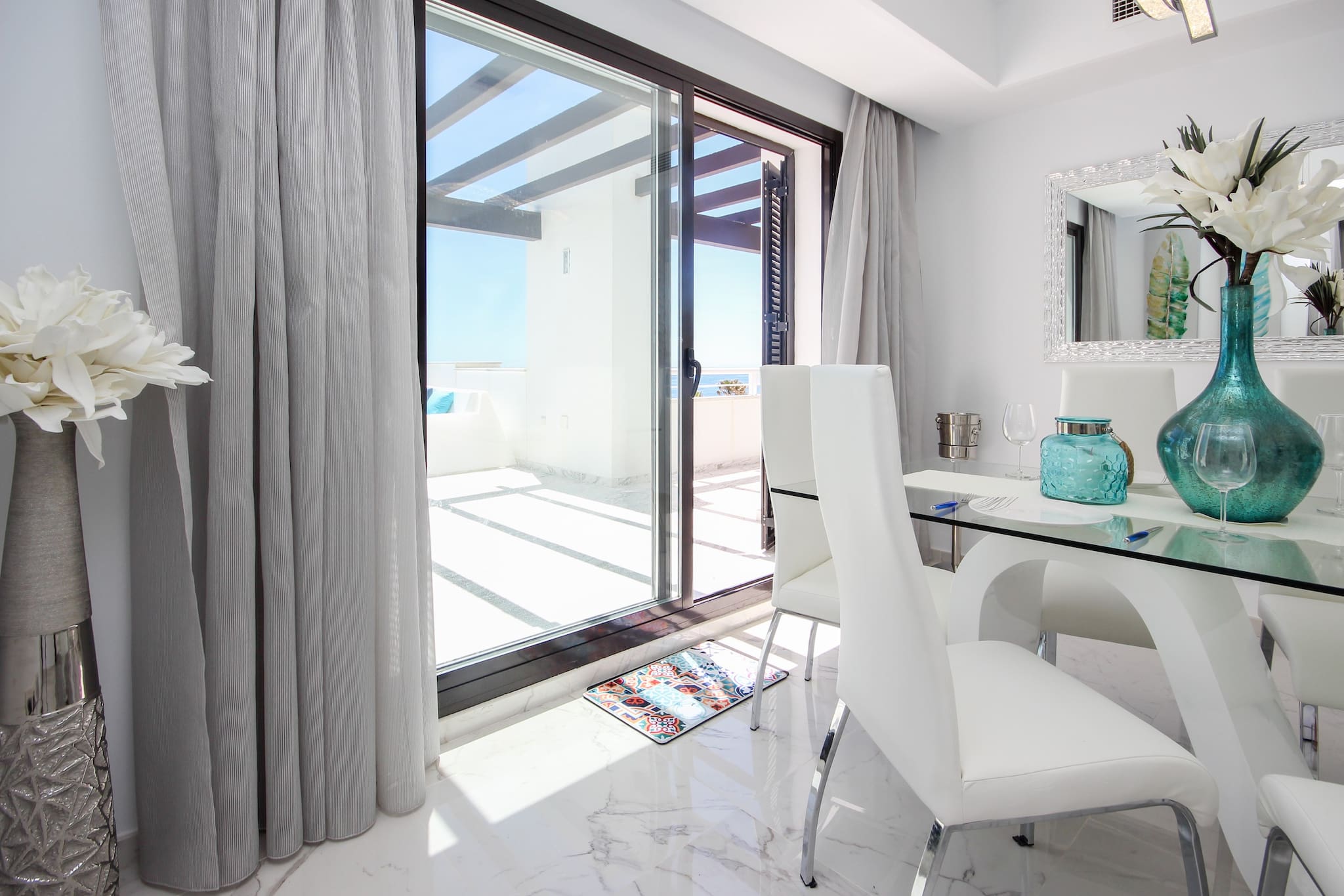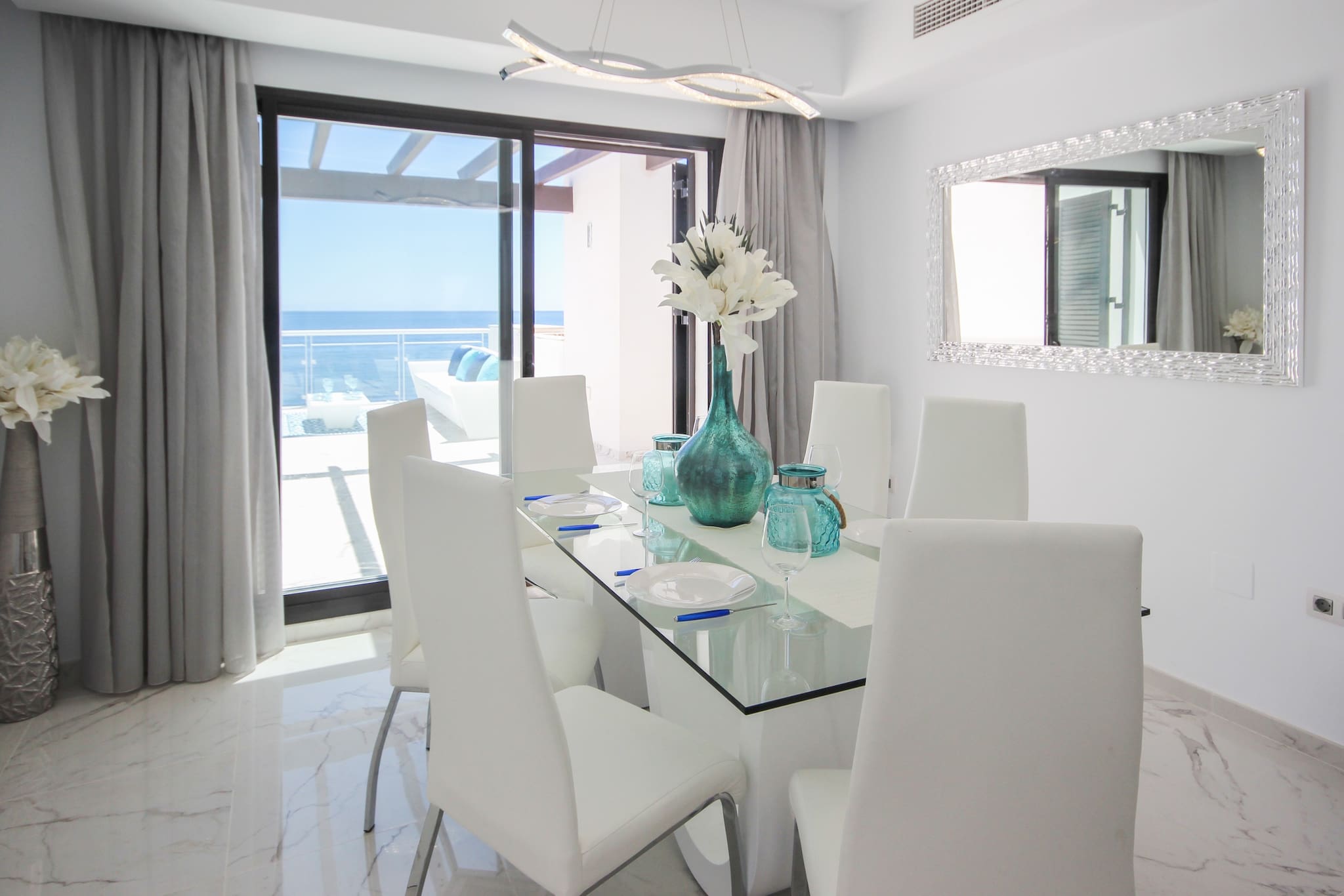 - The dining area, with a table for seven, seamlessly connects to the living space, creating an ideal setting for shared meals and conversations. - Step out onto any of the 4 terraces and enjoy the stunning views of the sea and mountains, a perfect spot for morning coffee or relaxing in the evening.