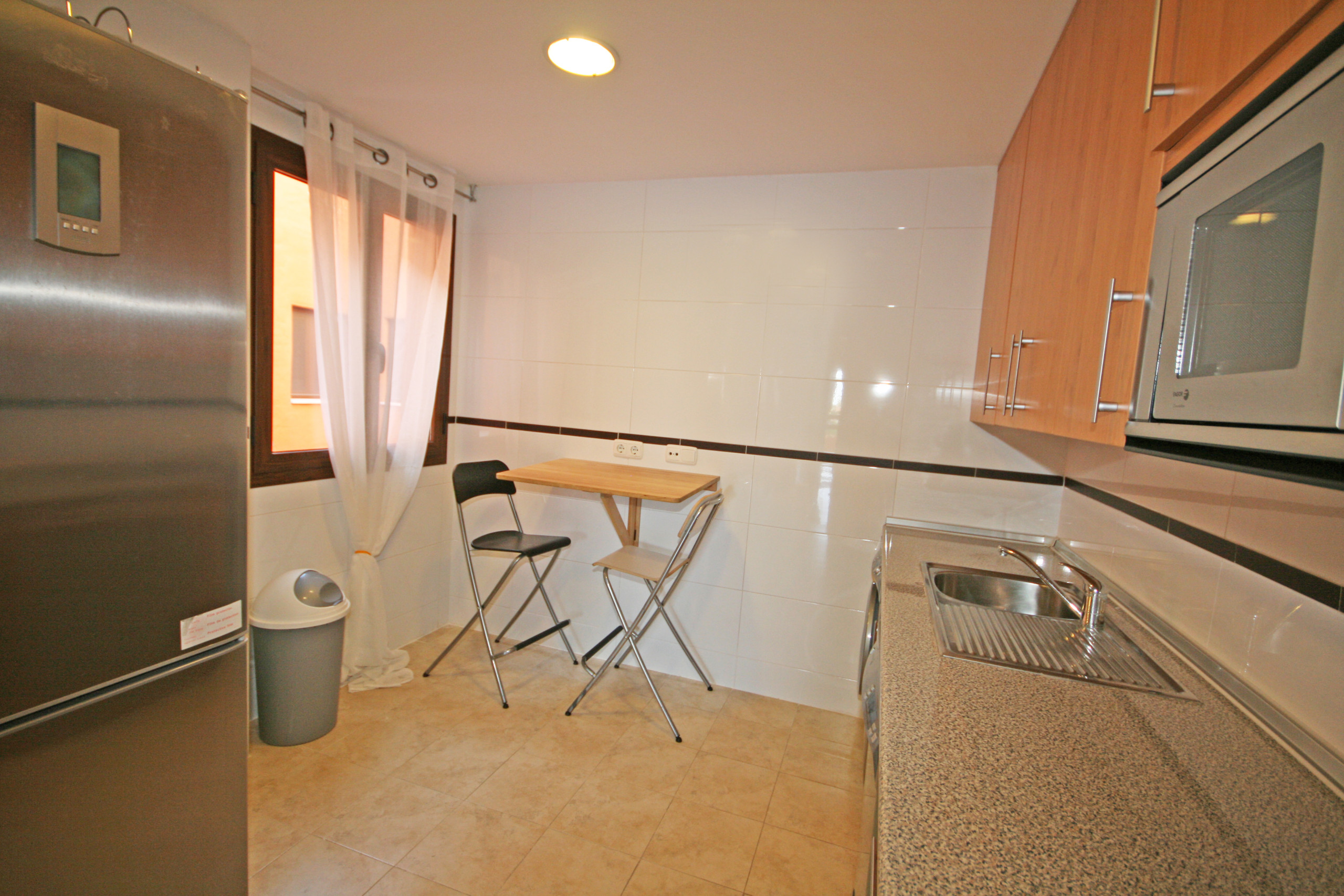 The apartment is located on the 3rd floor and comprises of a lounge/diner furnished with 2 sofas, dining table and chairs and a TV. Access to the south facing lounge terrace and roof terrace is through the lounge. The compact, modern kitchen is fully equipped.