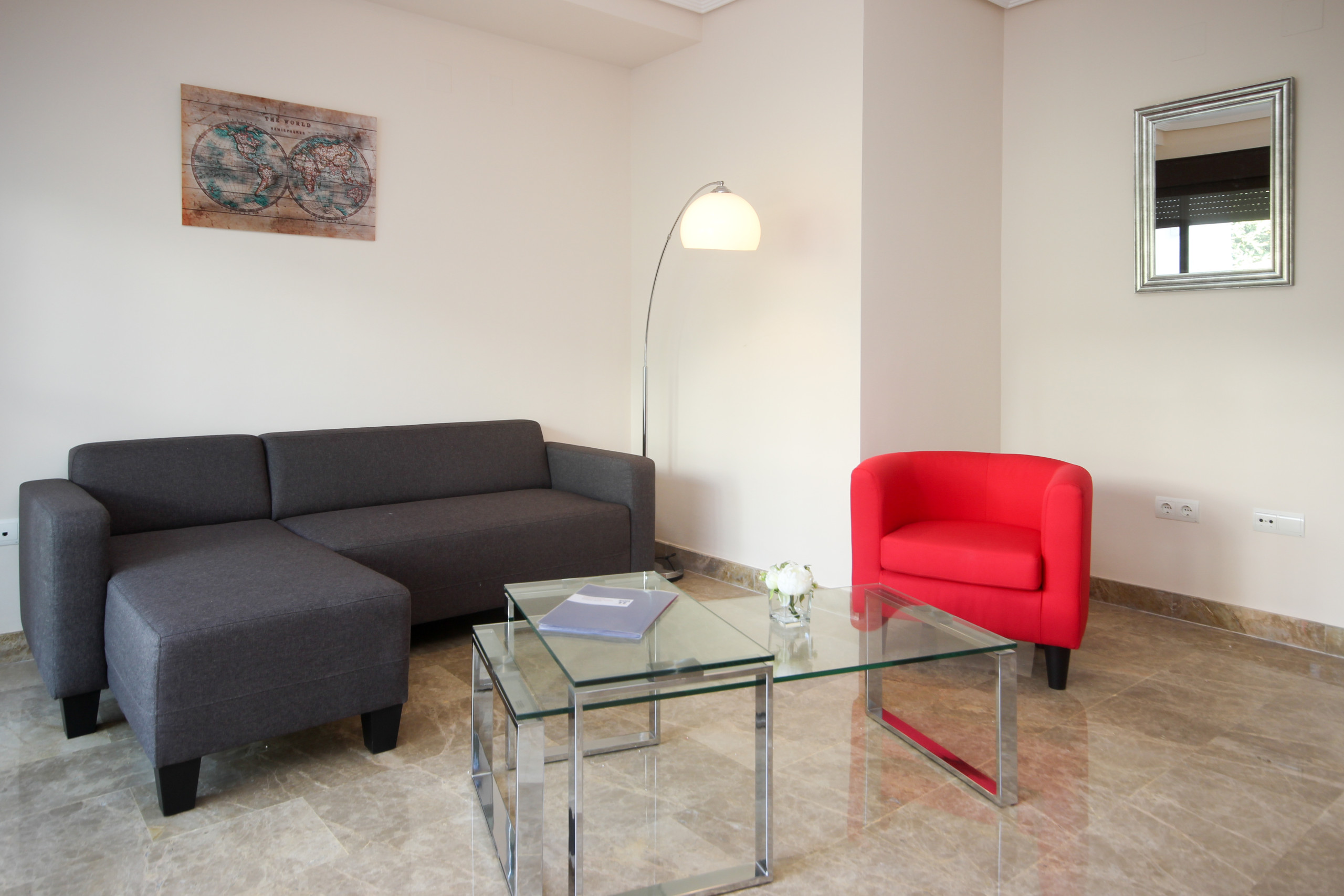 There is a lift to the 3rd floor apartment which consists of a large lounge/diner furnished with a sofa and dining table and chairs. The lounge leads out onto the south east facing terrace fitted with a coffee table and chairs. The modern kitchen has a small utility terrace with the washing machine.