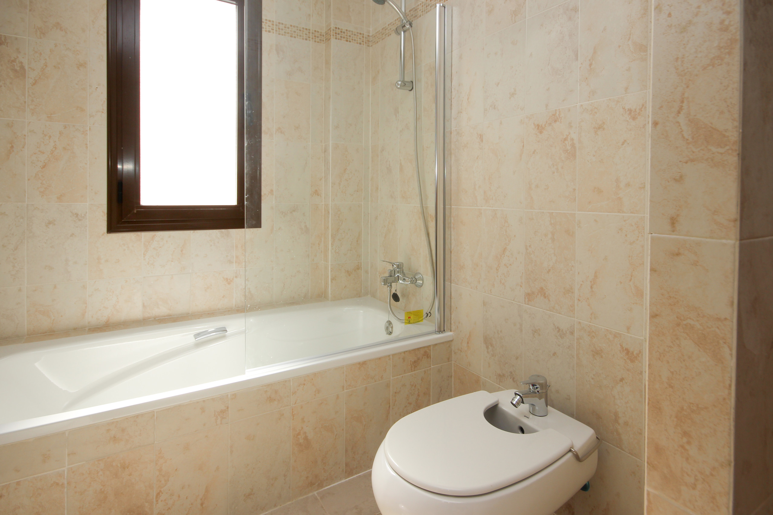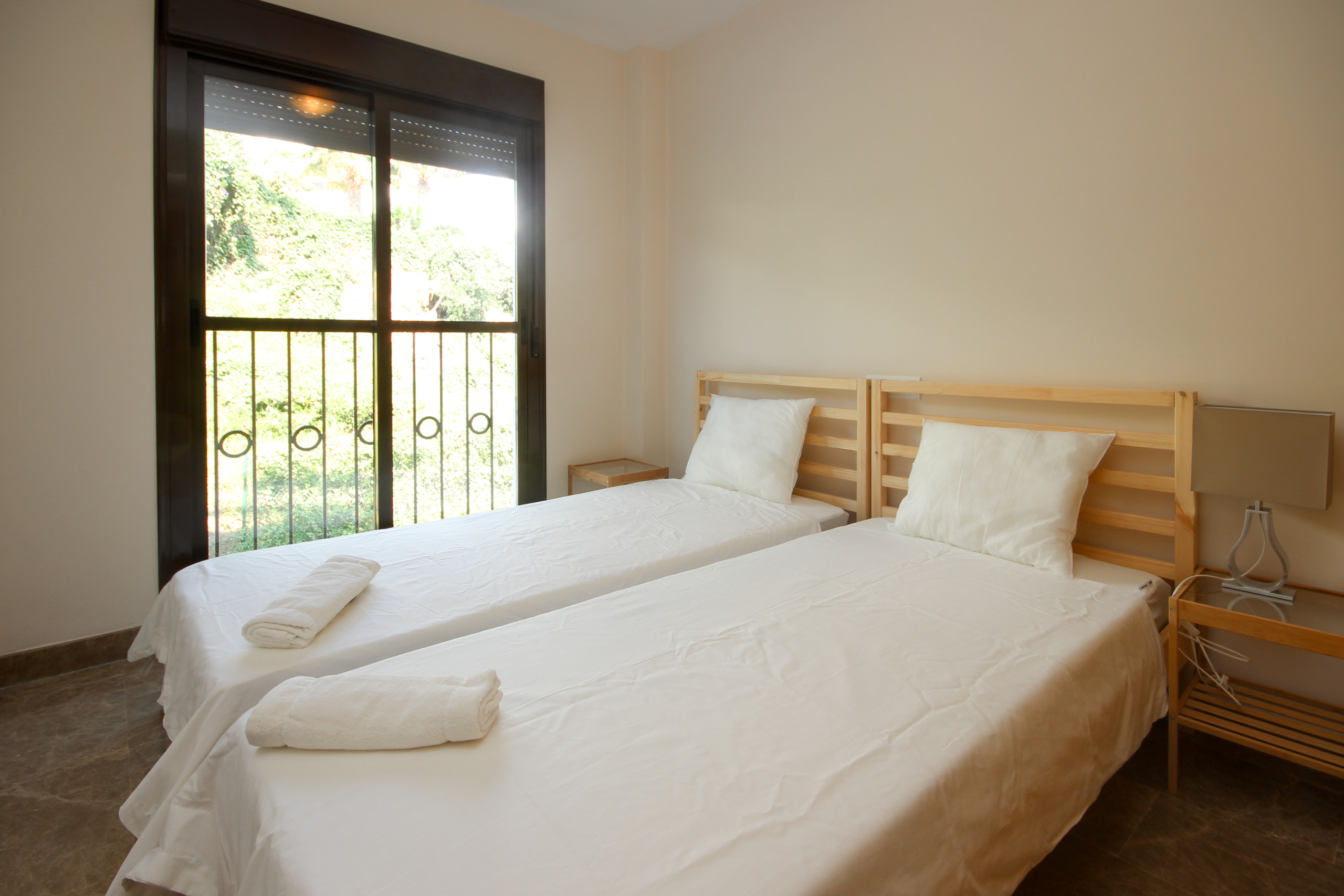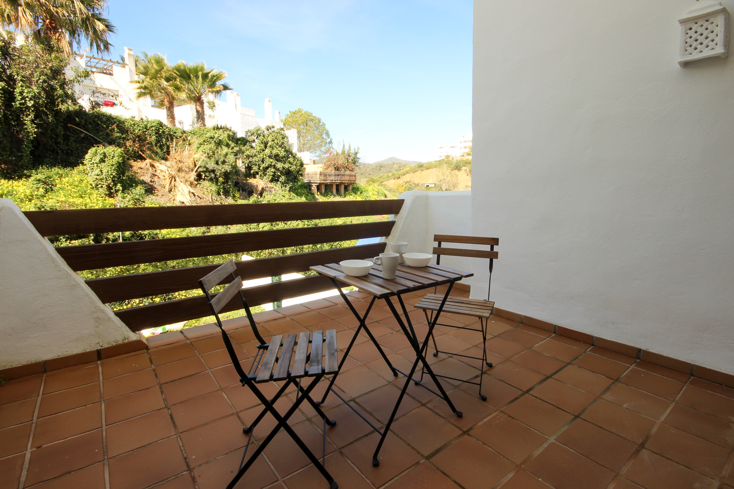 The master bedroom is furnished with a king size bed and benefits from an en suite bathroom and access to the terrace. The second bedroom is furnished with twin beds and has use of the guest shower room.