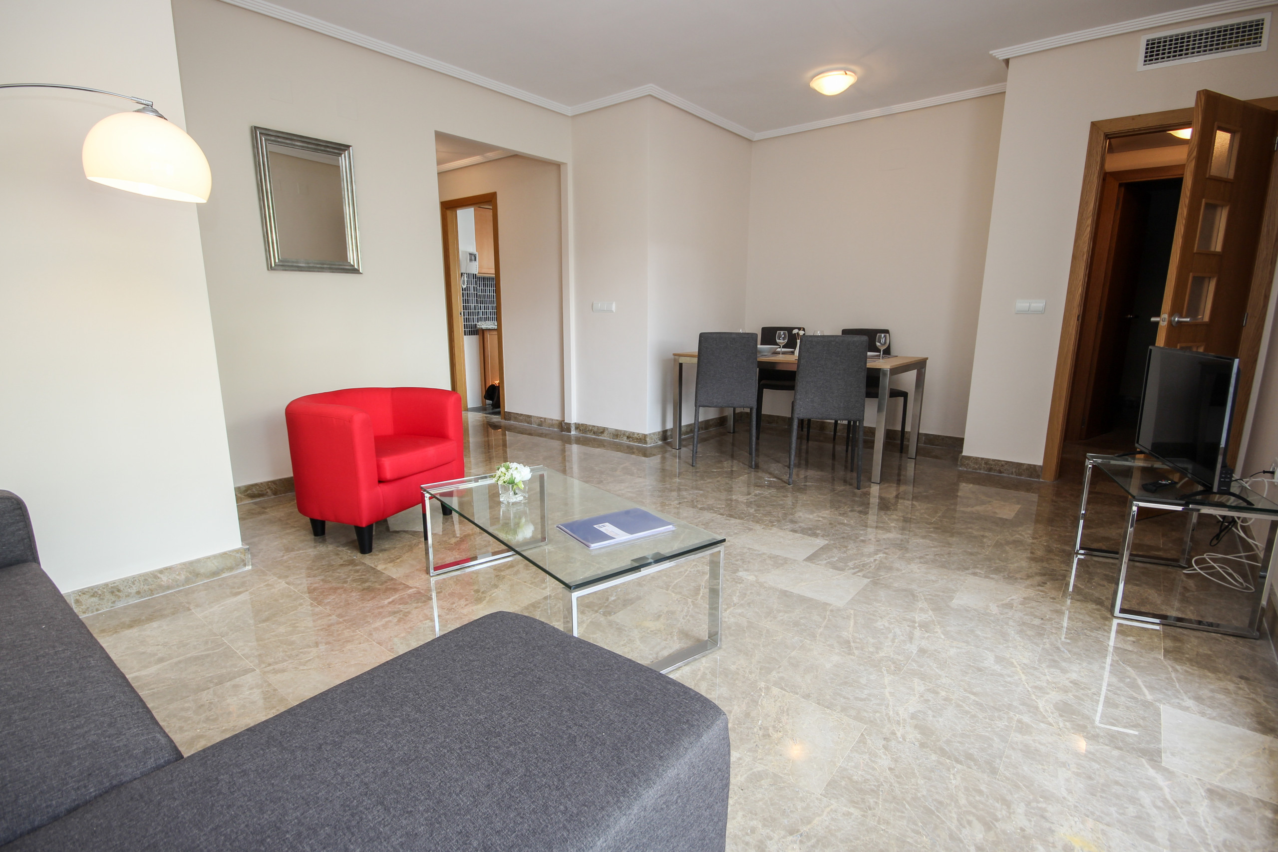 The apartment is located on the 3rd floor and comprises of a lounge/diner furnished with 2 sofas, dining table and chairs and a TV. Access to the south facing lounge terrace and roof terrace is through the lounge. The compact, modern kitchen is fully equipped.