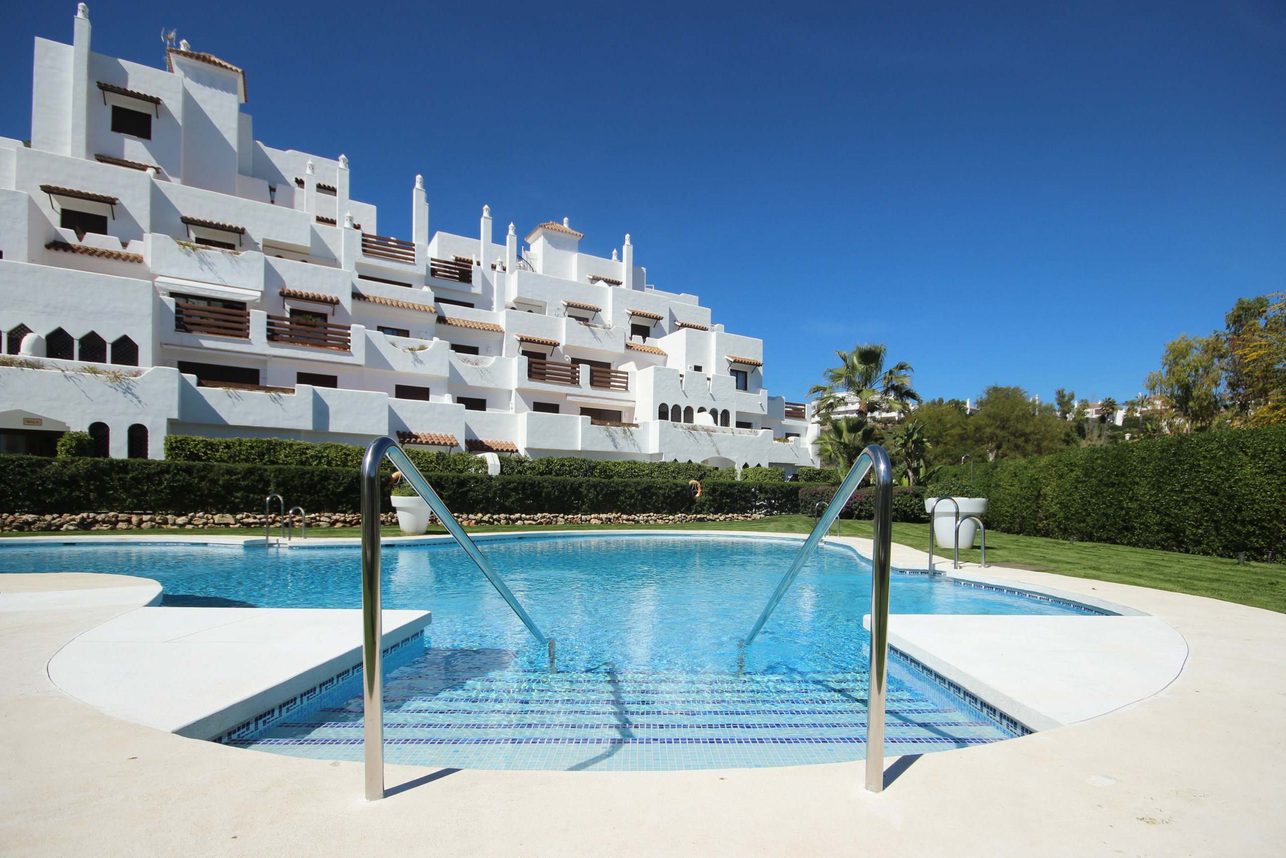 This 2 bedroom apartment is situated in the beautiful, gated complex of Golf Hills Estepona located close to the Selwo Adventure Park and La Resina Golf Club. The complex offers a lovely grassed communal pool area with large pool and separate kids pool, kids playground and private parking.