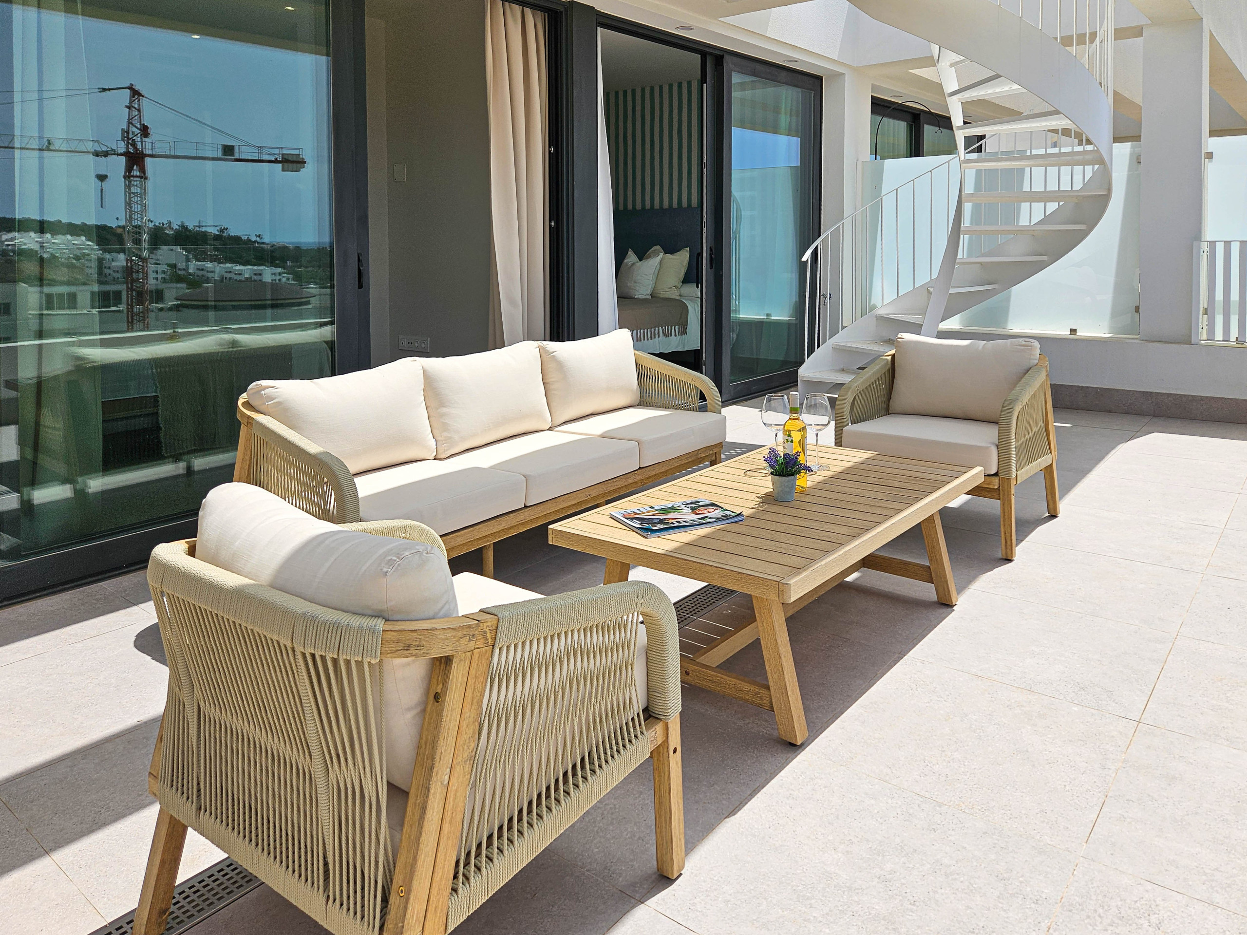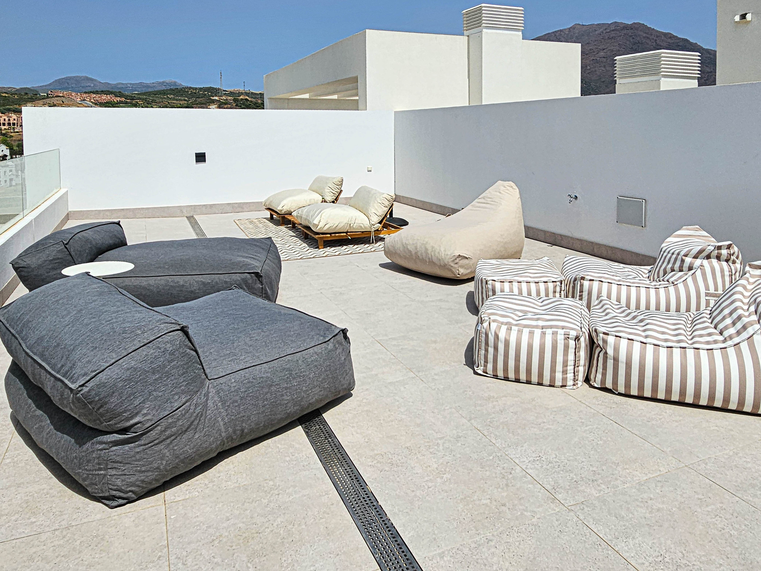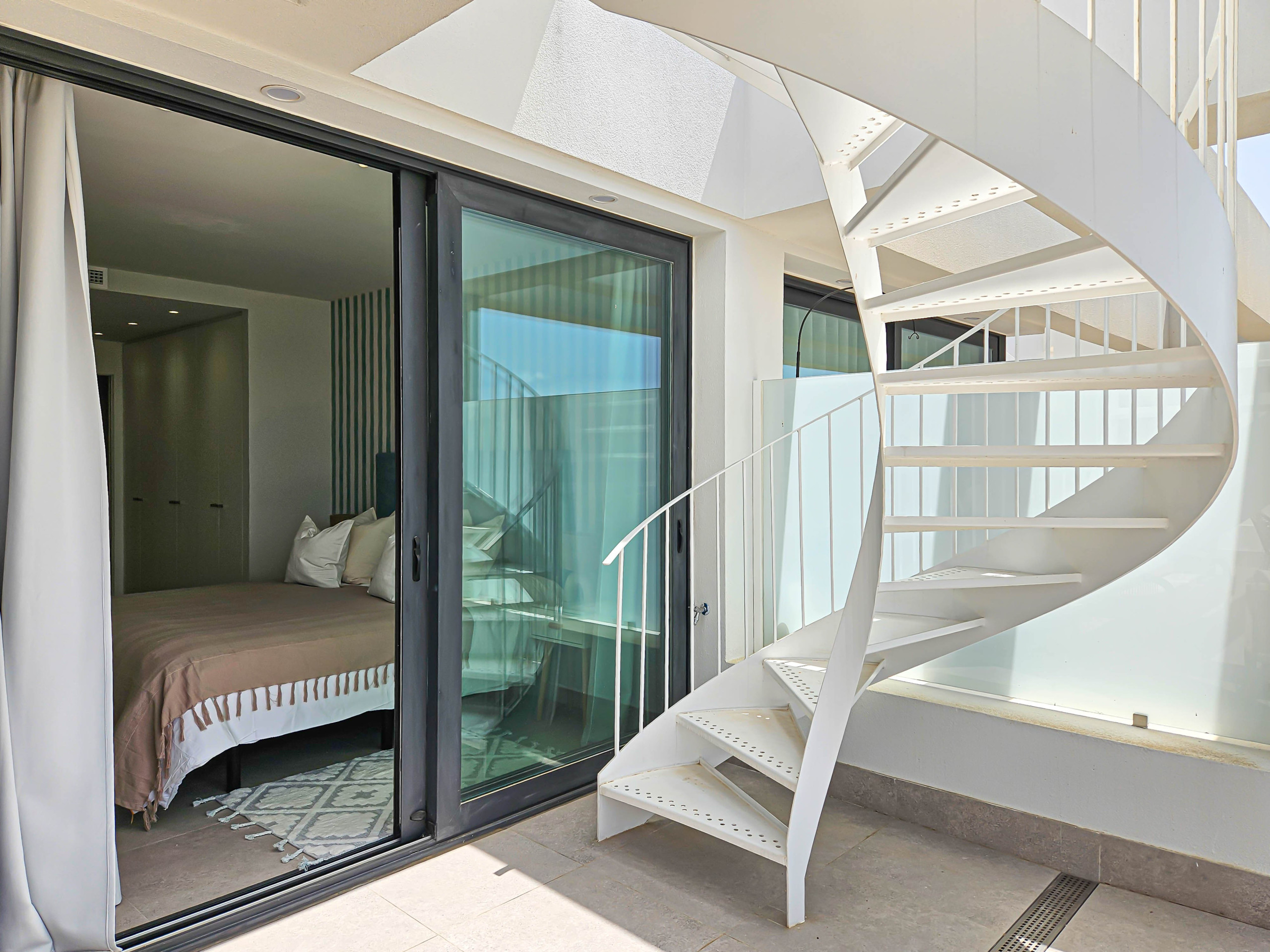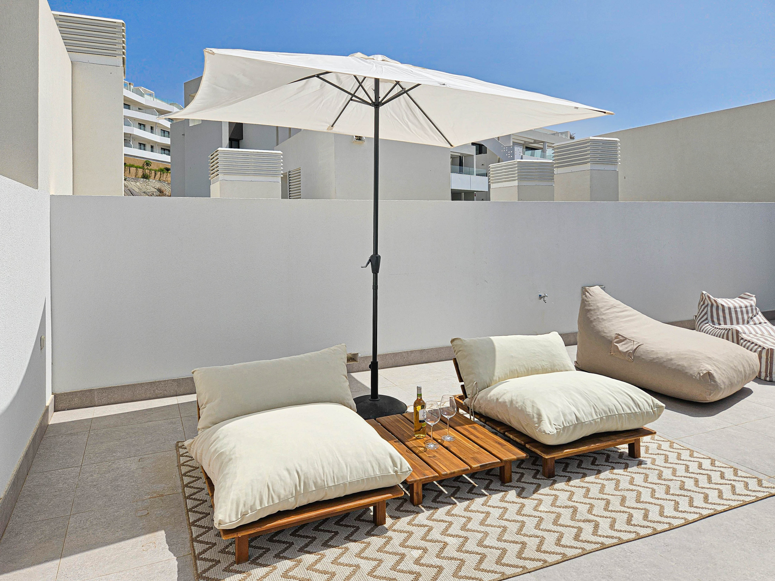 This tastefully furnished apartment is located on the third floor with access by lift and is arranged over two levels. The open plan living space offers a well-equipped kitchen with a kitchen island and a breakfast bar with stools. There is a dining seating area and the lounge is furnished with an L-shaped sofa, two poofs and a 55" smart TV. Leading out from the living space is the lower terrace, where you can enjoy the dining and lounge seating areas, gas BBQ and sea views. Take the spiral staircase up to the spacious roof terrace where you have a choice of lounge seating, with bean bag beds and chairs. There is also an electric awning on the lower terrace and a pergola on the roof terrace, to offer respite from the sun on those hotter days.