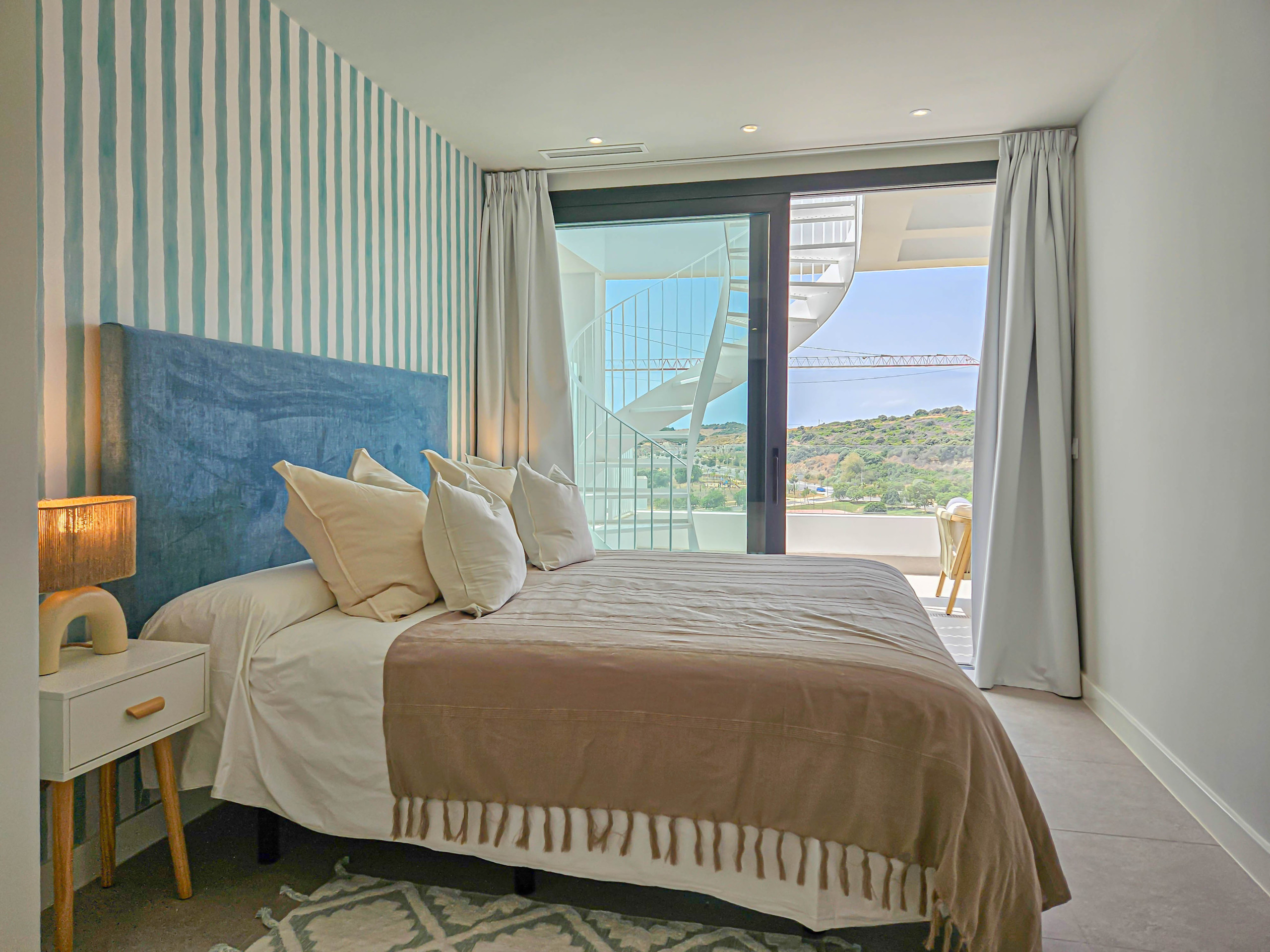 This modern two bedroom penthouse apartment is located in the newly built complex of Azahar de Estepona. The secure gated complex offers a communal pool and gym, and is located 1.5km away from the beach & 2.5km form the nearest golf club. There are a large supermarket and a restaurant just 900m away from the complex. The complex benefits from secure underground parking with two parking spaces available. There is hot & cold vented aircon, free WIFI and blackout curtains in the bedrooms.