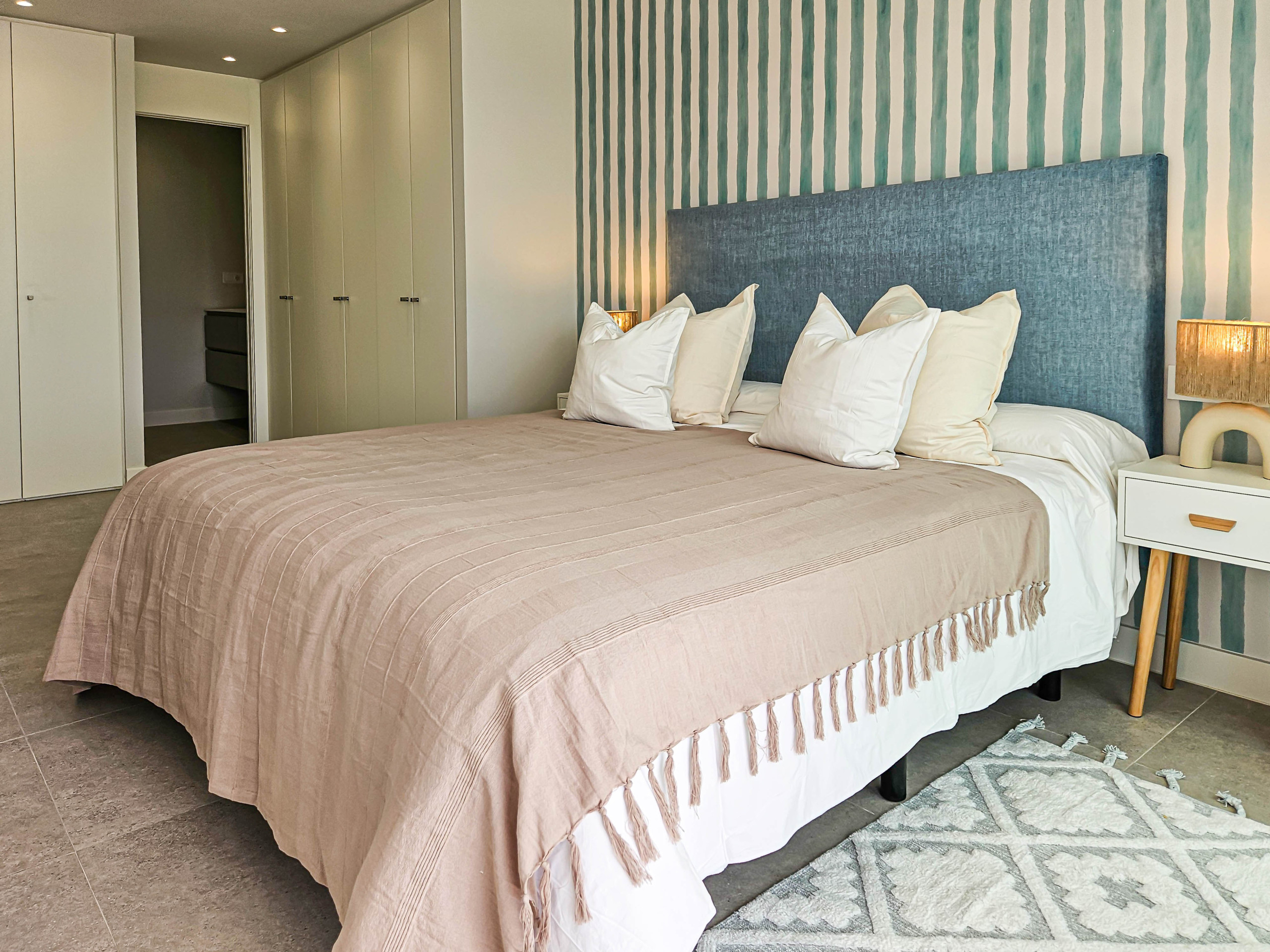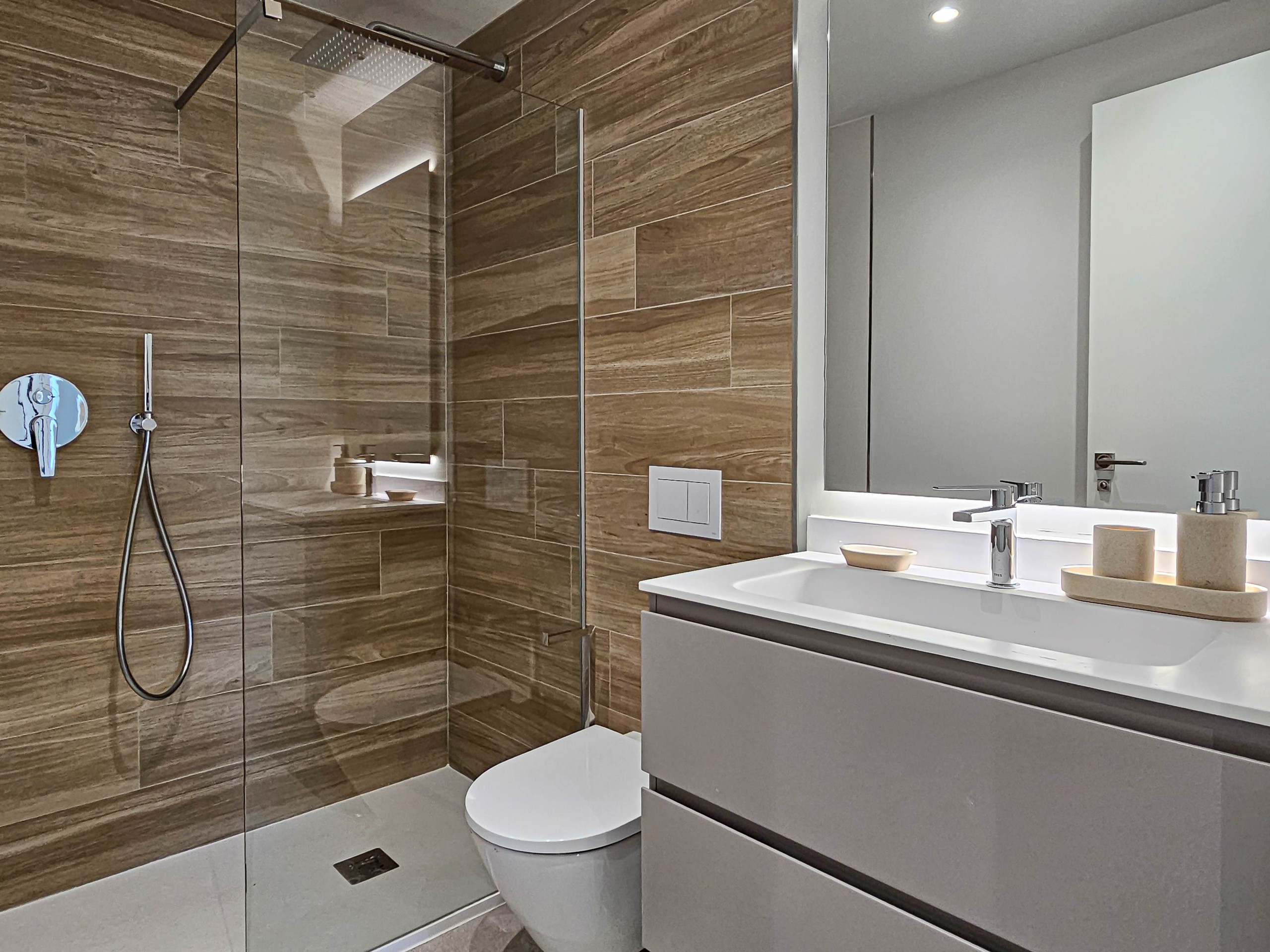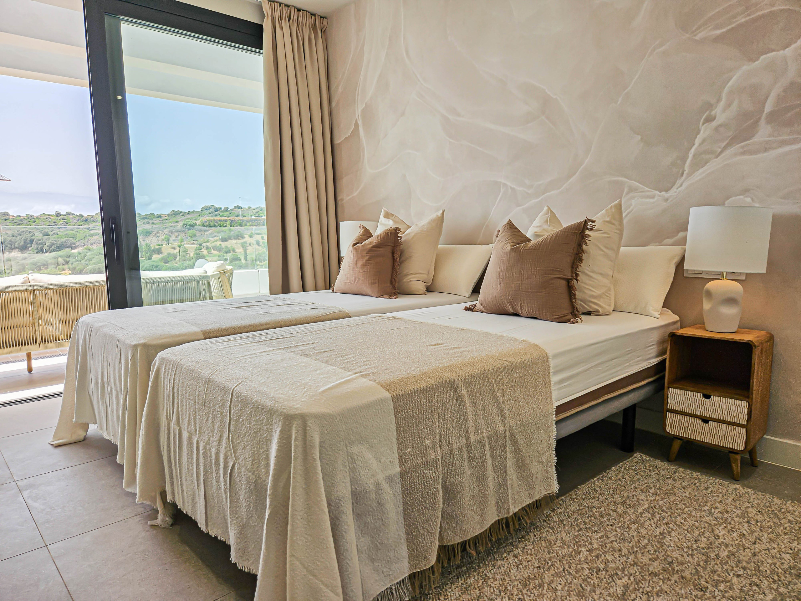 The master bedroom benefits from a super king size bed, fitted wardrobes and has direct access onto the terrace. There is also an ensuite shower room fitted with a walk in shower and double sinks. The guest bedroom is furnished with twin beds and fitted wardrobes. There is access to a guest shower room fitted with a walk in shower.