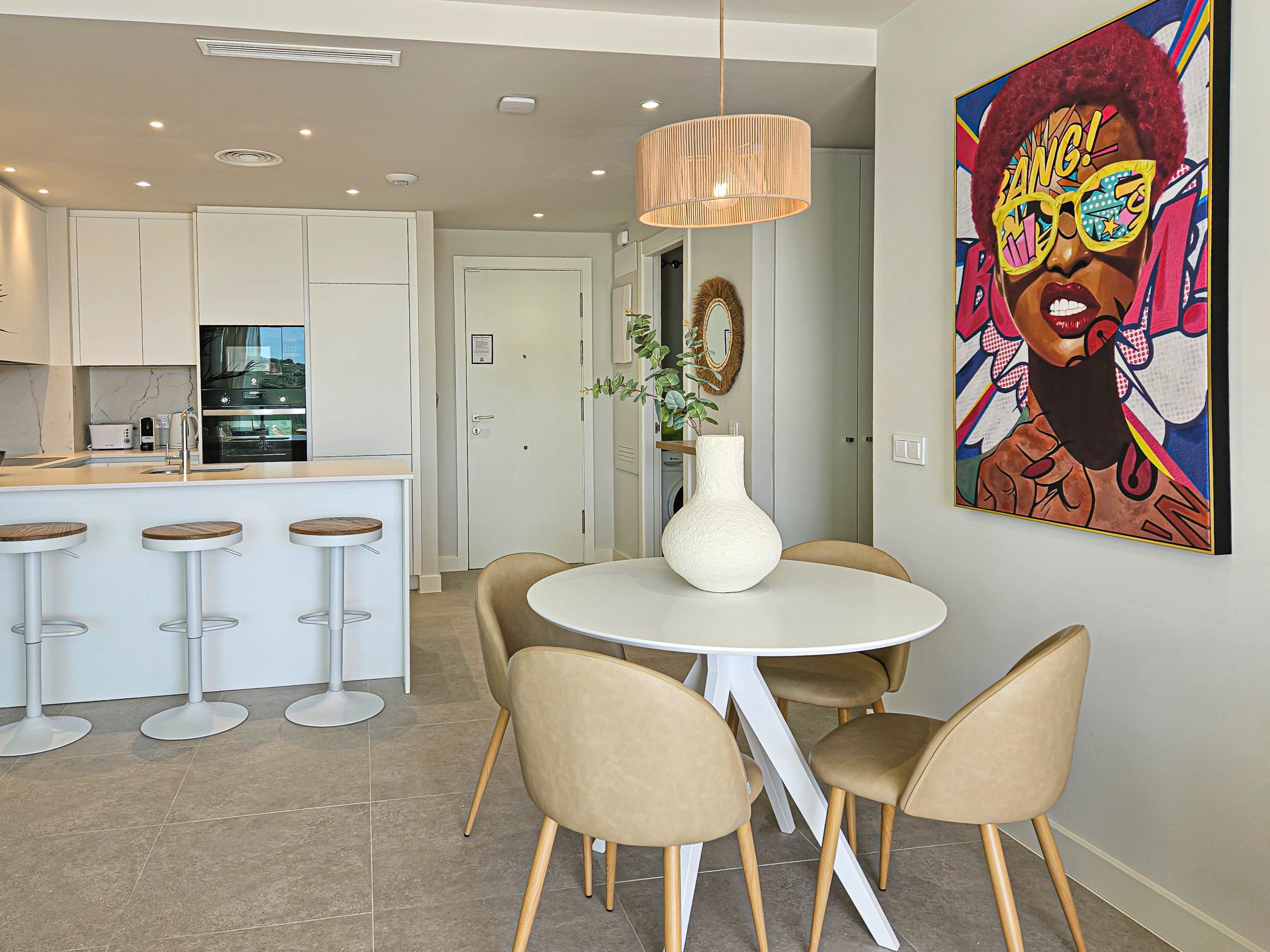The apartment is located on the 3rd floor and comprises of a lounge/diner furnished with 2 sofas, dining table and chairs and a TV. Access to the south facing lounge terrace and roof terrace is through the lounge. The compact, modern kitchen is fully equipped.