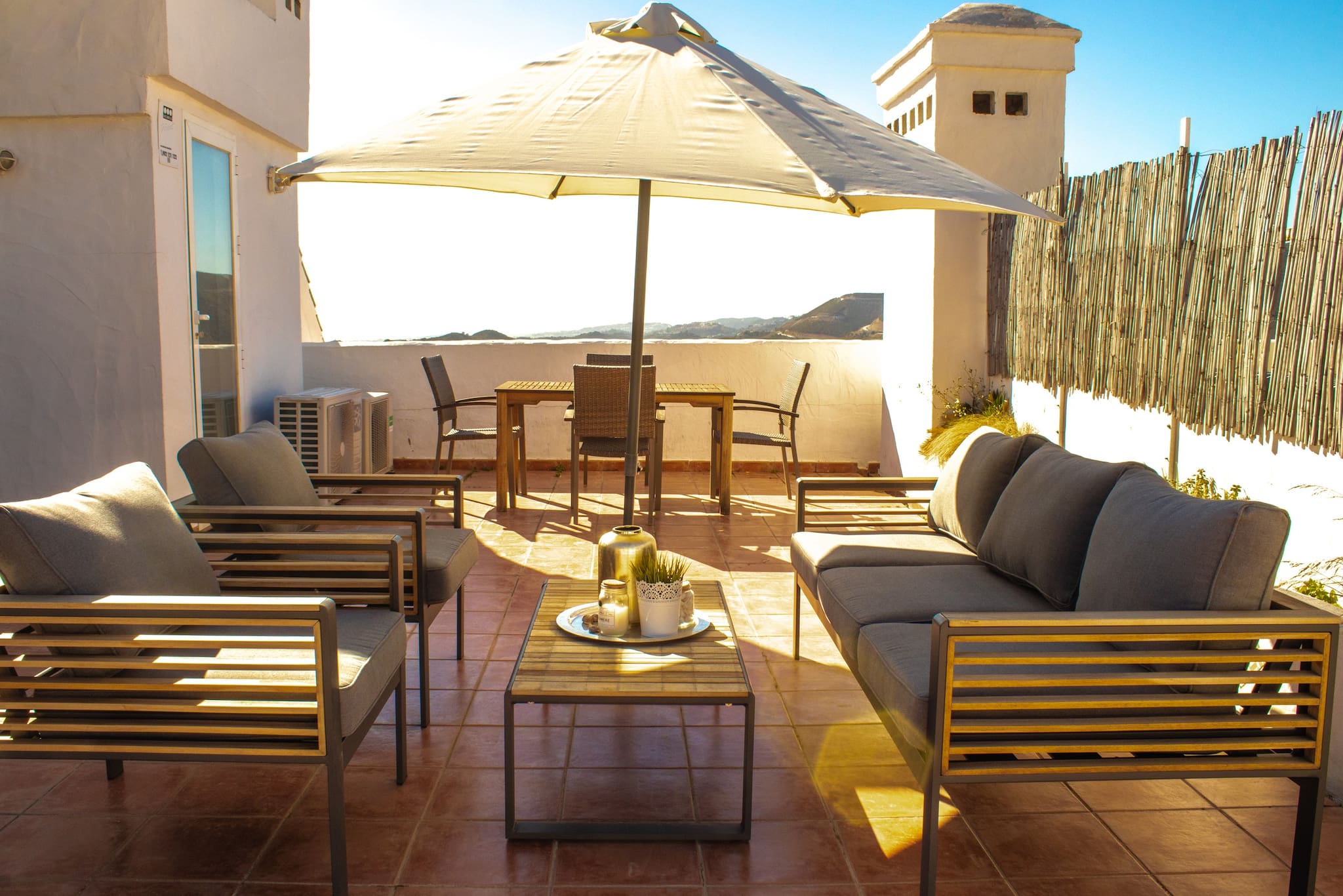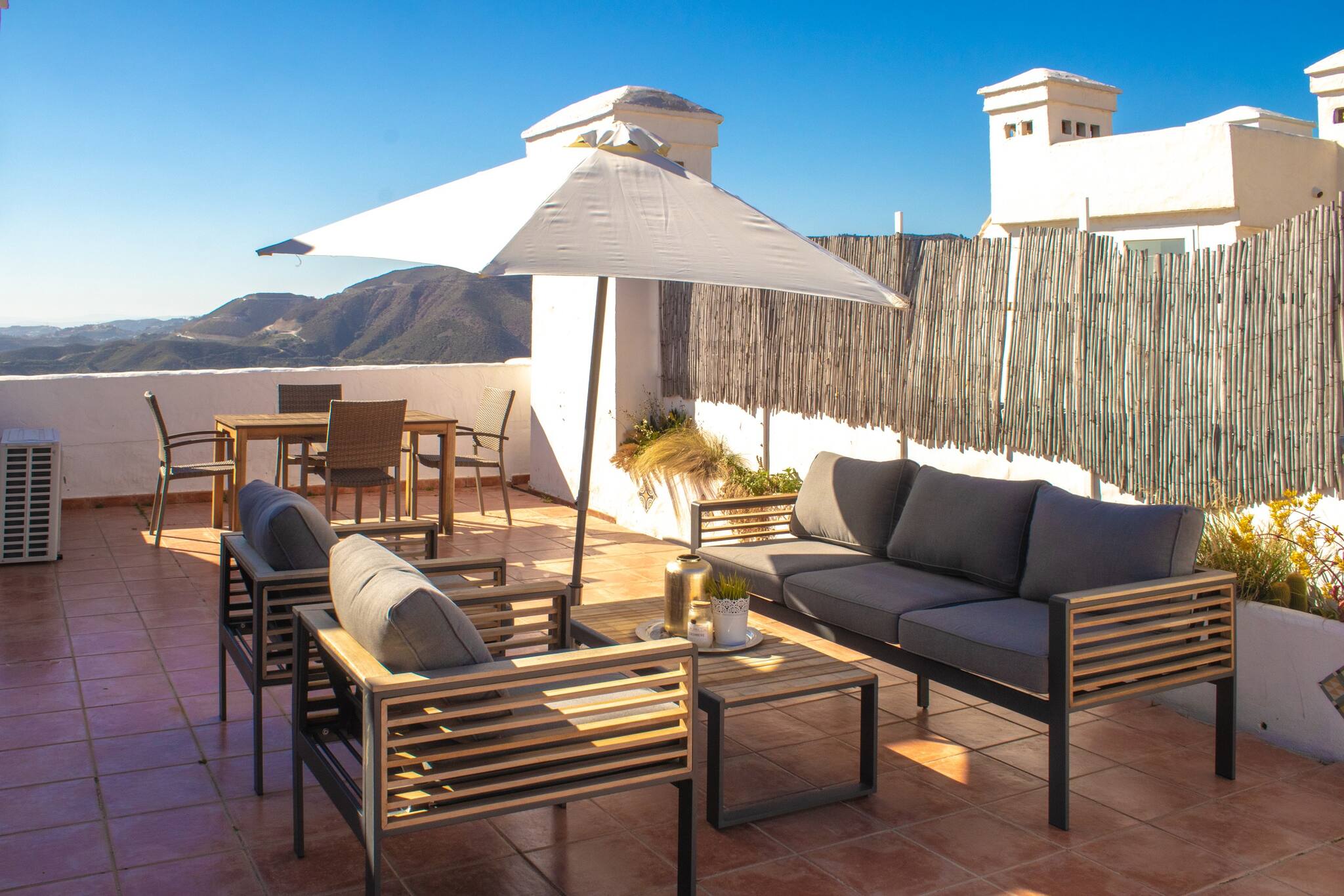There are marble floors and air-conditioning throughout and an alarm system. The 85m2 roof terrace is accessed by a covered staircase from the lounge terrace. Here you can enjoy some spectacular views, dine or soak up the sun. There are two parasols for shade.