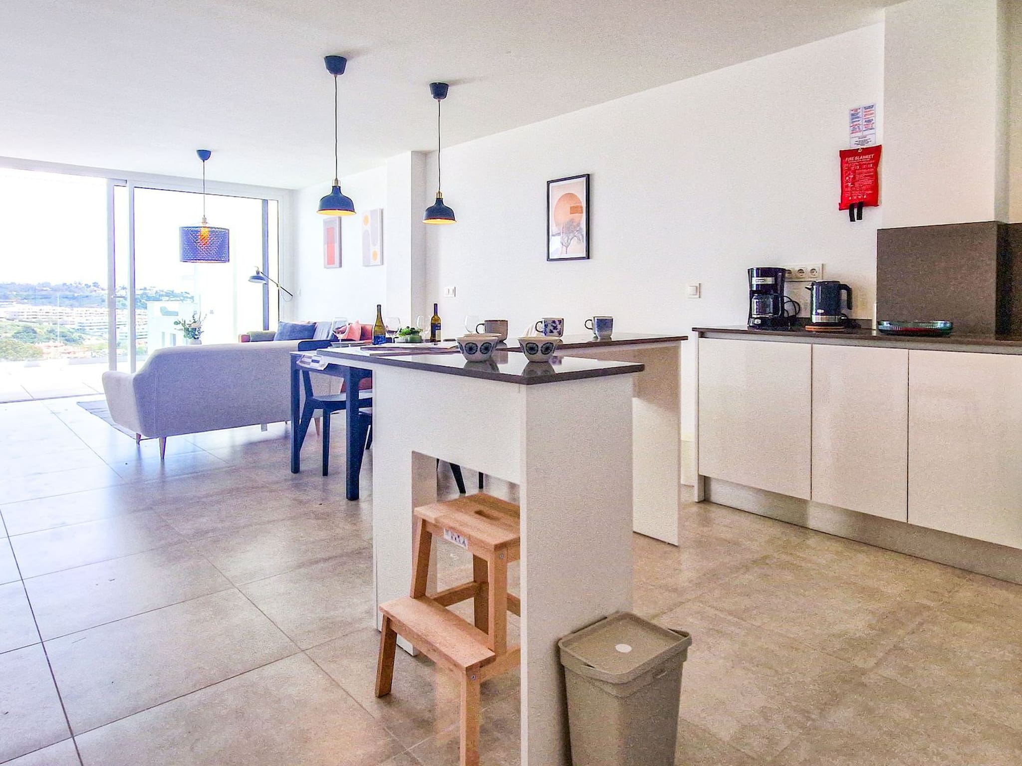 This apartment is arranged over one floor and consists of an open plan living space which leads out onto the terrace. The kitchen is fully equipped and has a breakfast bar.