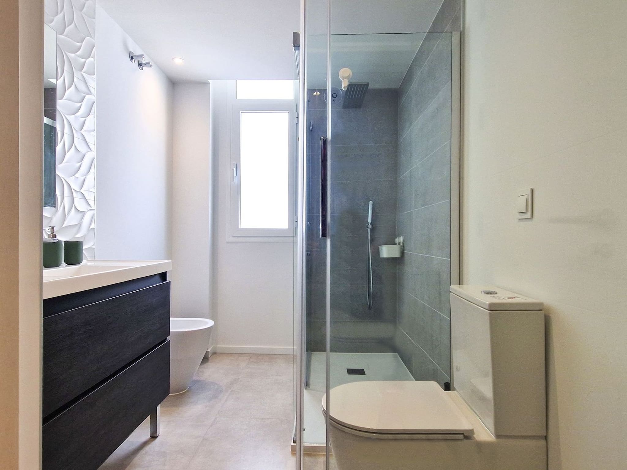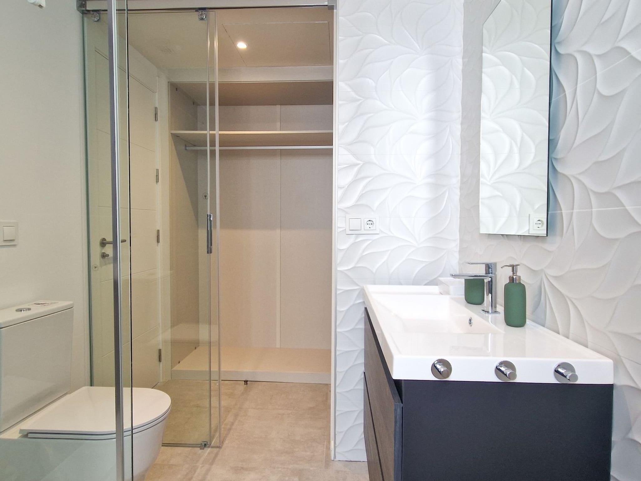 The master bedroom is furnished with a king-size bed and enjoys a large en suite shower room and walk in closet. The 2nd bedroom is furnished with a double bed and fitted wardrobes . The 3rd bedroom is benefits from a single size bed that can also pull out to make a king size bed and fitted wardrobes. There is also a guest shower room. The apartment offers free WIFI and hot and cold vented aircon throughout.