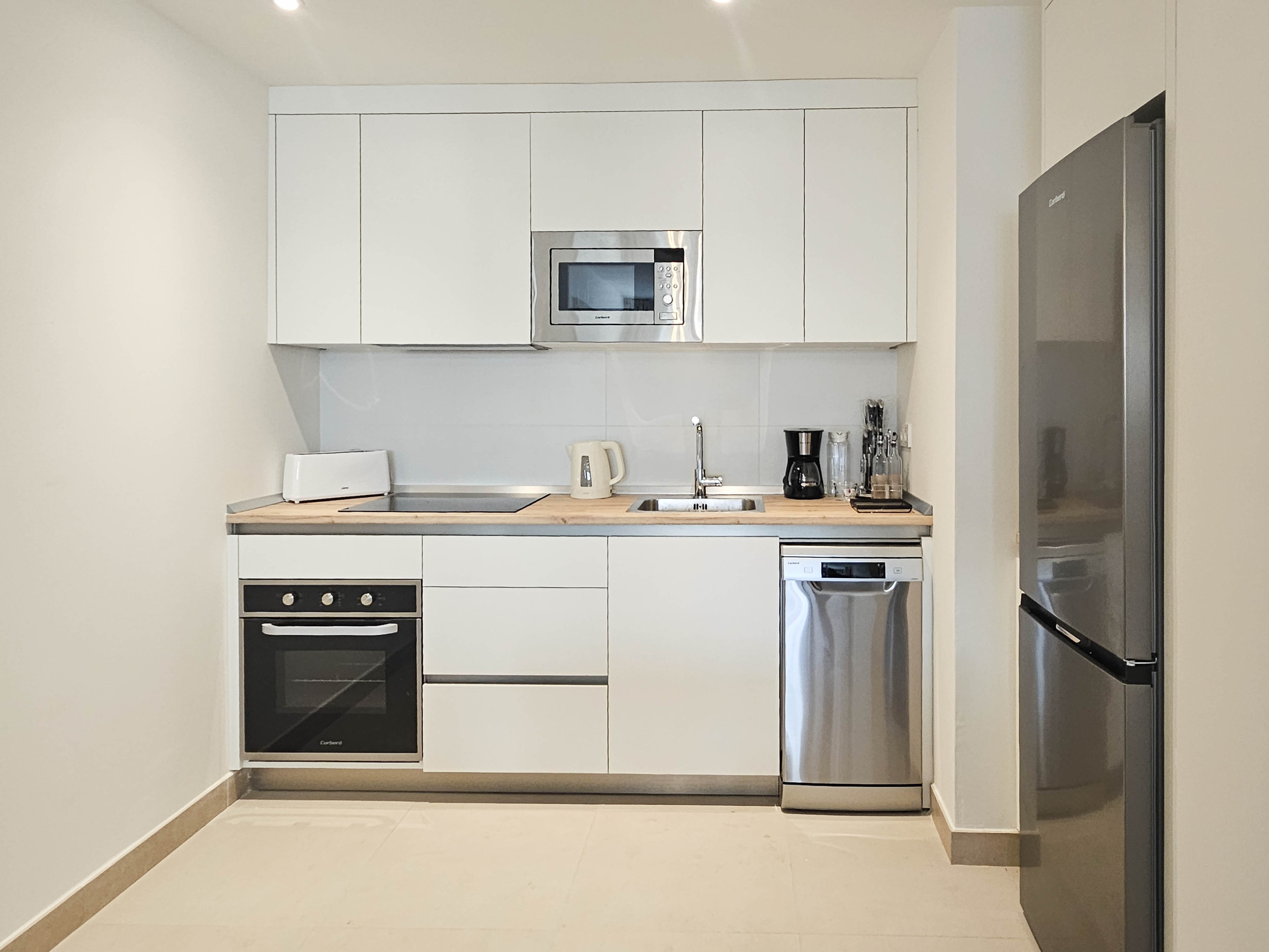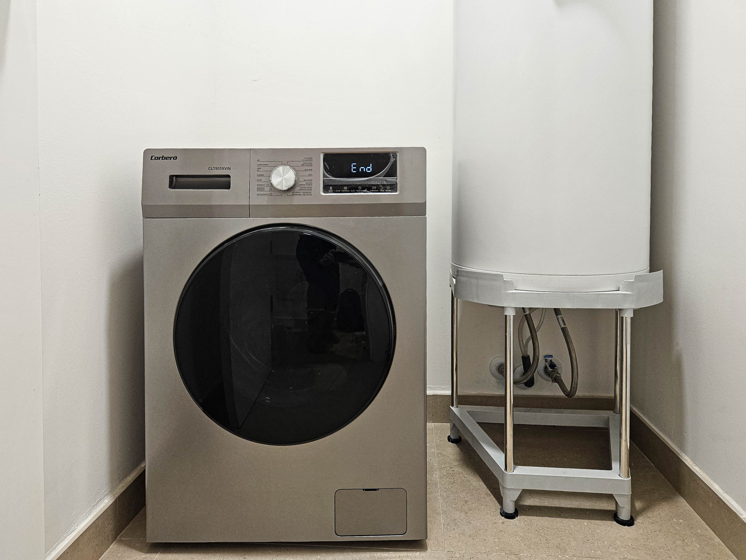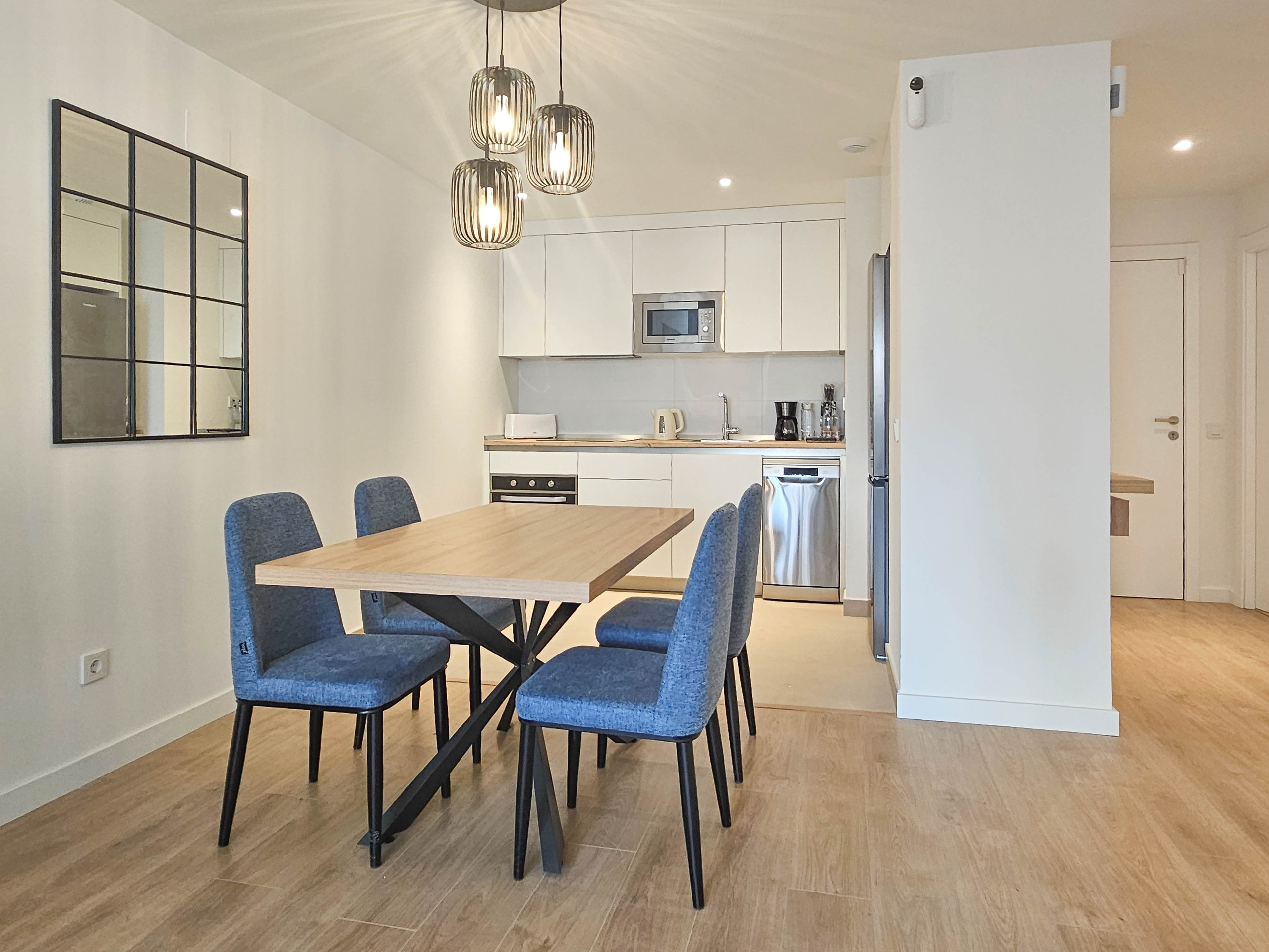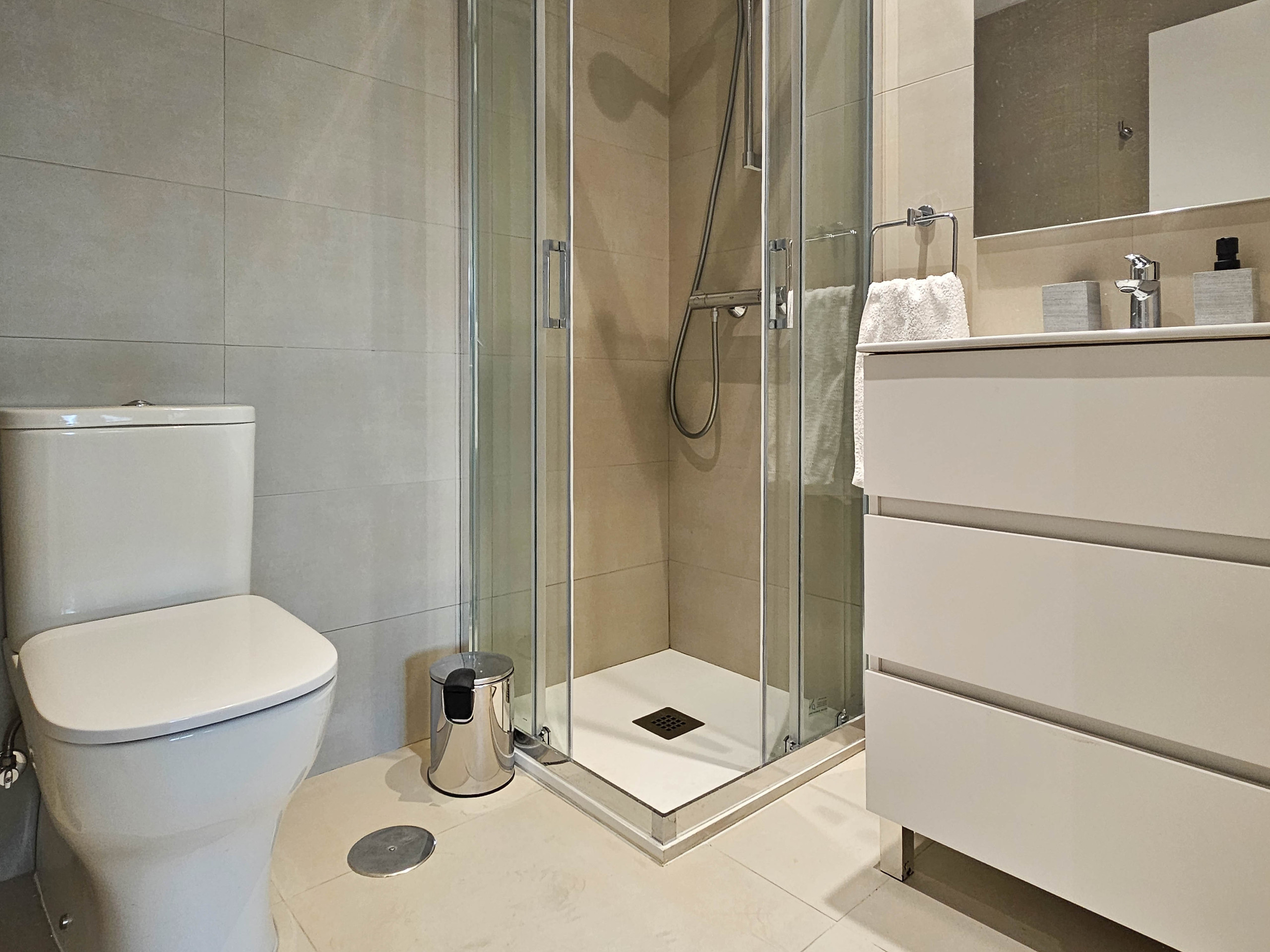 Guests have access to a communal rooftop terrace with seating areas (open until 23:00), perfect for relaxing after a day of exploring. The building also features a shared laundry room with washing and drying machines, as well as a gym available for daily or weekly use (€5.00 per day). The gym access can be arranged and paid for at the building’s office on the ground floor (Oficina). For added peace of mind, a security guard is on duty in the building at night.
