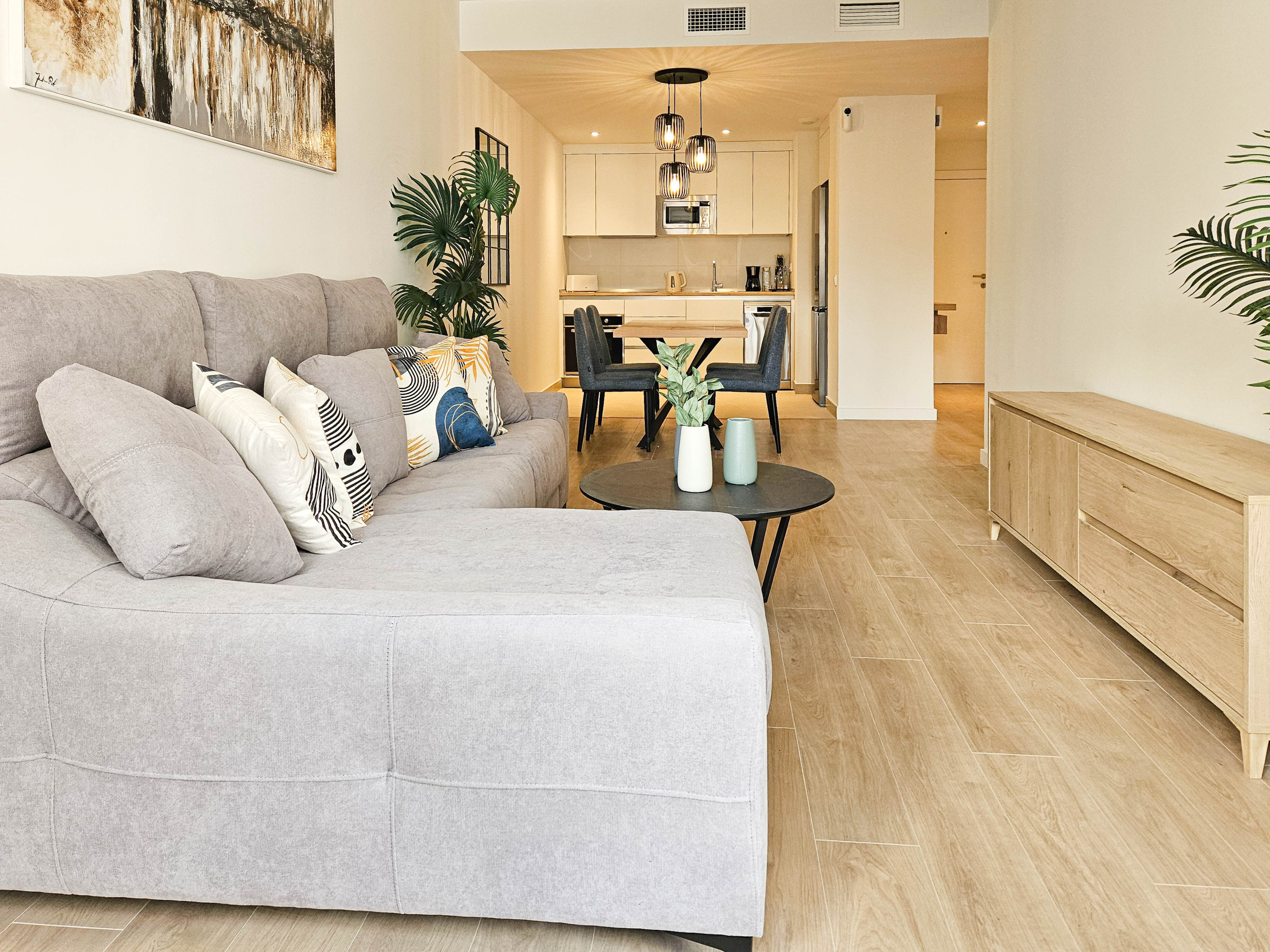 The apartment is located on the first floor and is accessed by stairs. Inside, the space is arranged over one level with an open-plan living area that includes air conditioning, two sofas, a 43” Smart TV, a dining table with chairs, and a well-equipped kitchen.