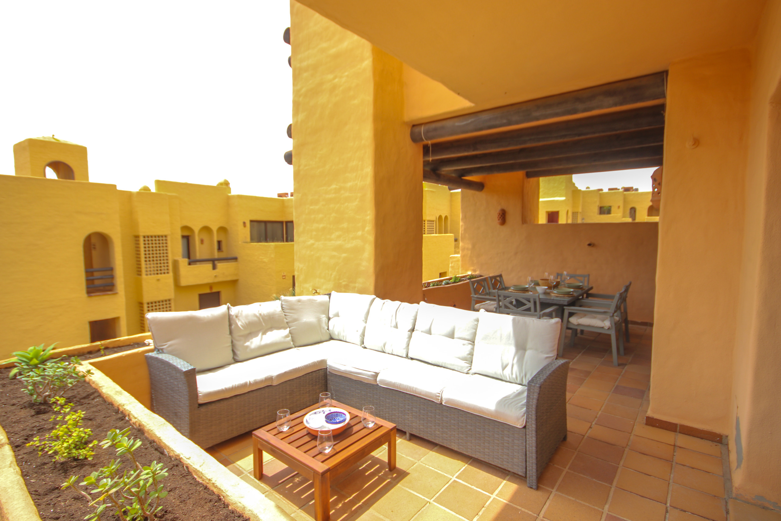 This four bedroom duplex penthouse apartment is situated in the quiet complex of Aldea Hills in Manilva, a few kilometres past Duquesa marina in a beautiful, unspoilt part of the coast. The complex offers manicured gardens and a lovely pool area with stunning views across to the Mediterranean Sea. The complex is only 300m from the beach which can be accessed through the untouched underpass of the main road or over a footbridge. Aldea Hills is a secure and gated complex and the apartment offers a space in the underground parking. There is also vented aircon in the lounge and bedrooms and free WIFI. All bedroom are fitted with shutters.