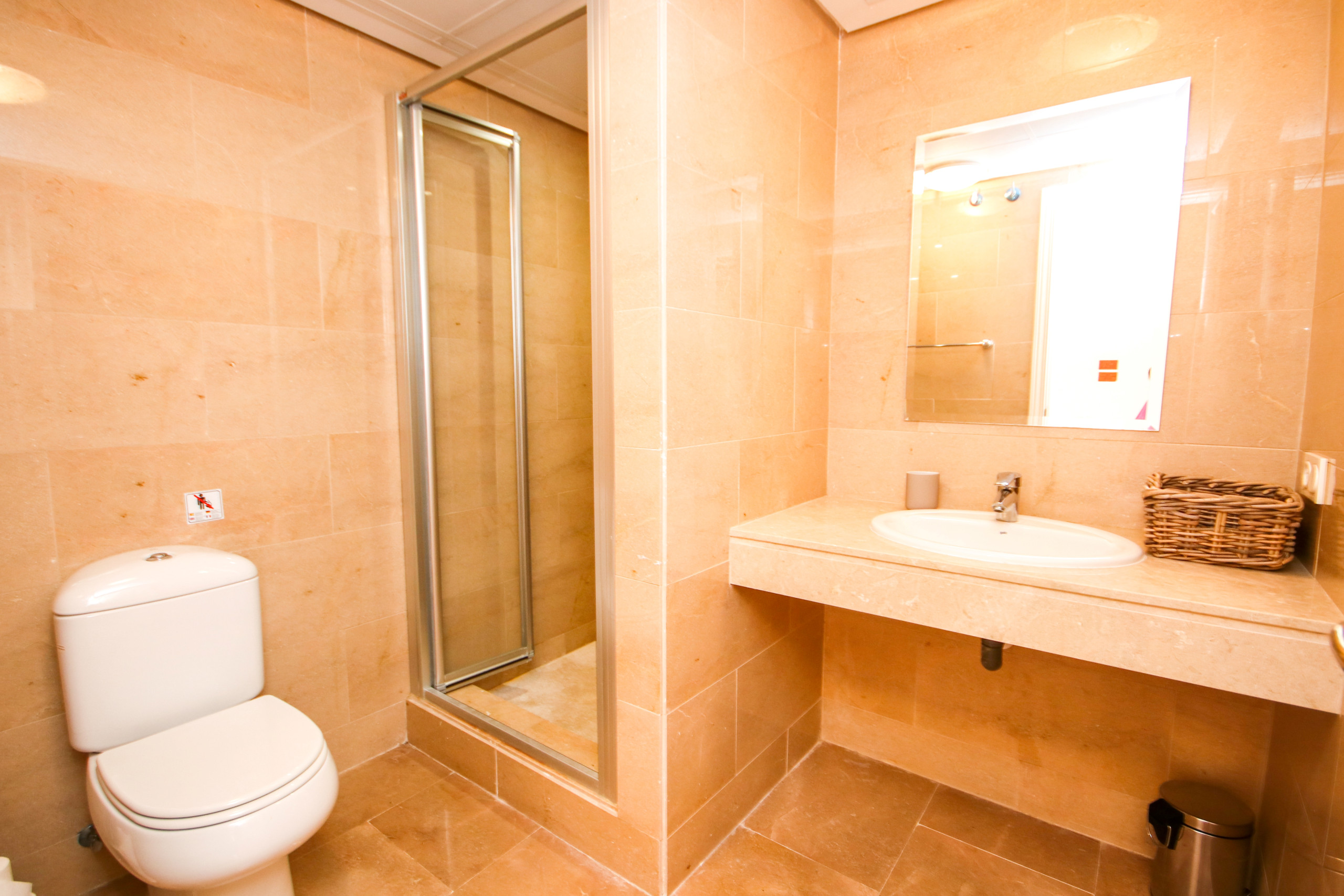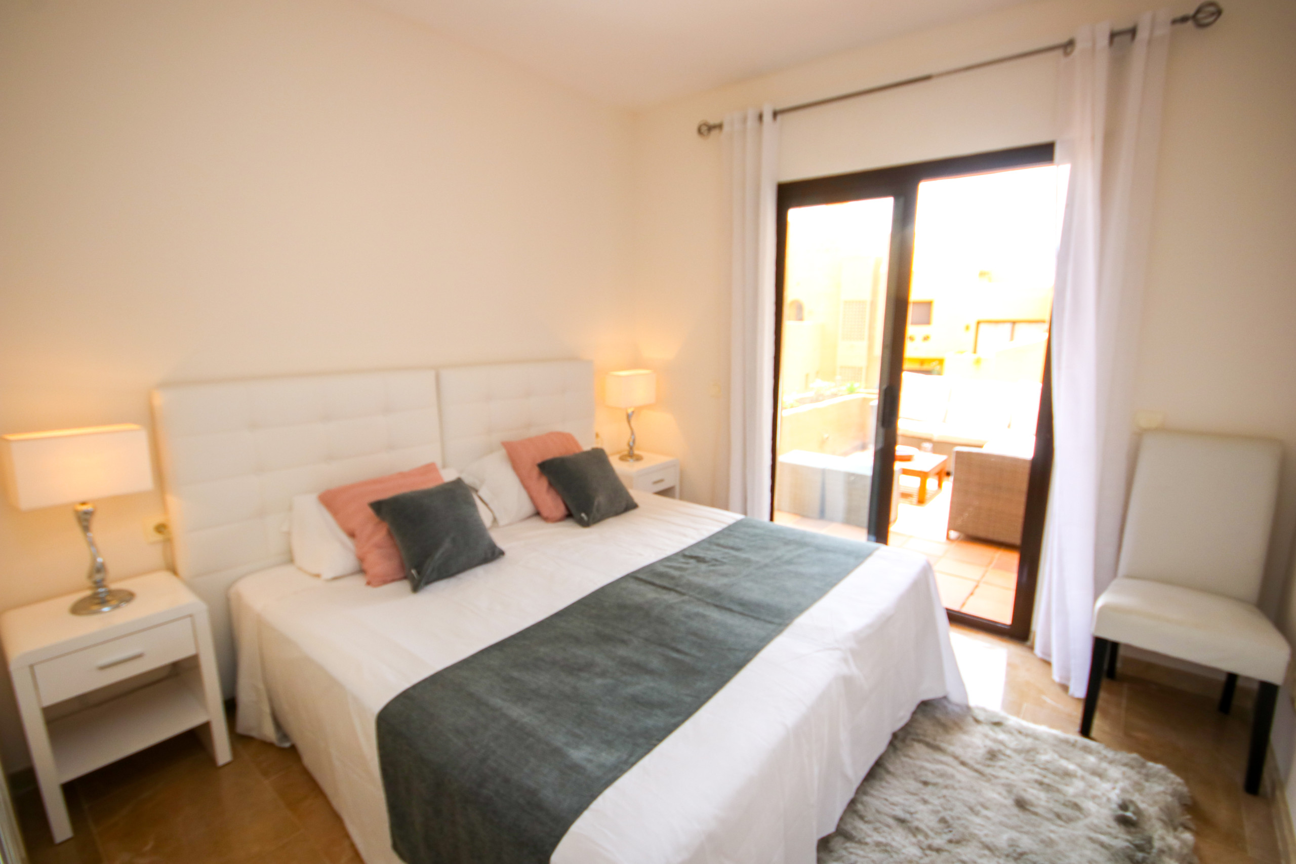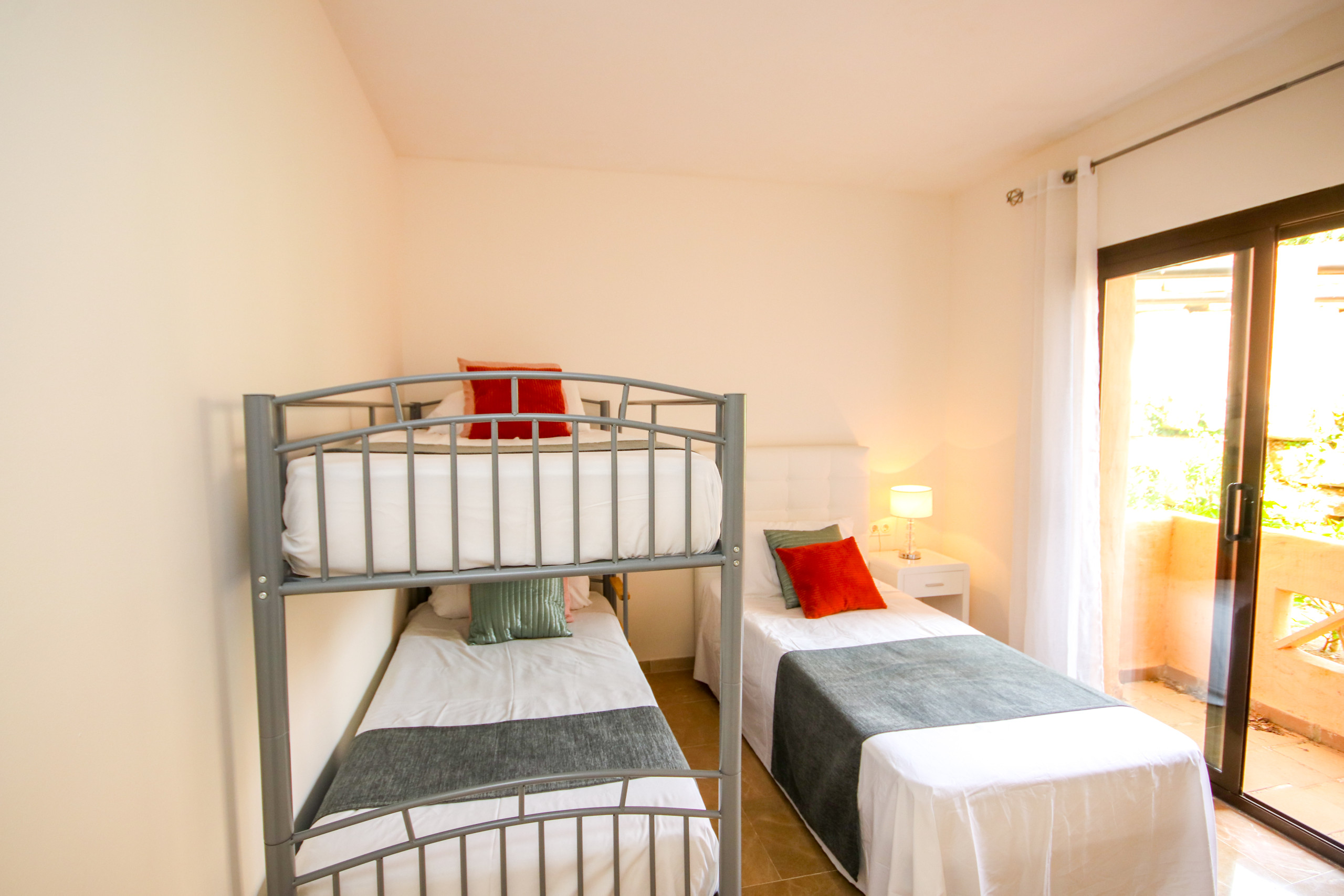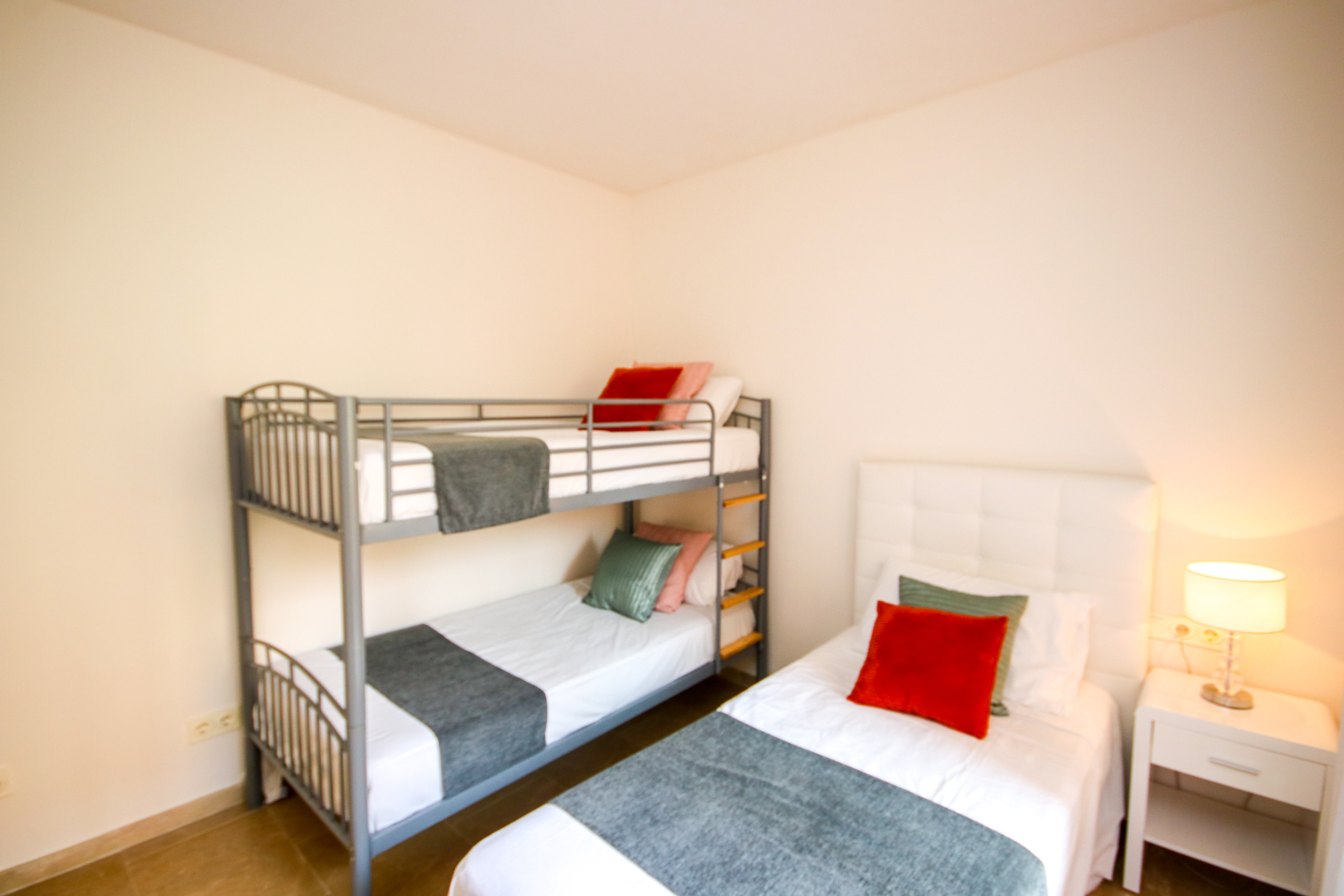 The hallway from the dining area leads to the bedrooms. The master bedroom has a king size bed and fitted wardrobes and has access to the terrace. The master bedroom enjoys an en-suite bathroom with a bath and shower attachment and baby bath. The second bedroom is furnished with two single beds, which can also be used as a super king sized bed and also has fitted wardrobes. This bedroom also has access to the terrace. The third bedroom, sleeping three people, has a bunkbed, plus a single bed. This room also has fitted wardrobes and a small terrace. There is also a guest bathroom with walk in shower.