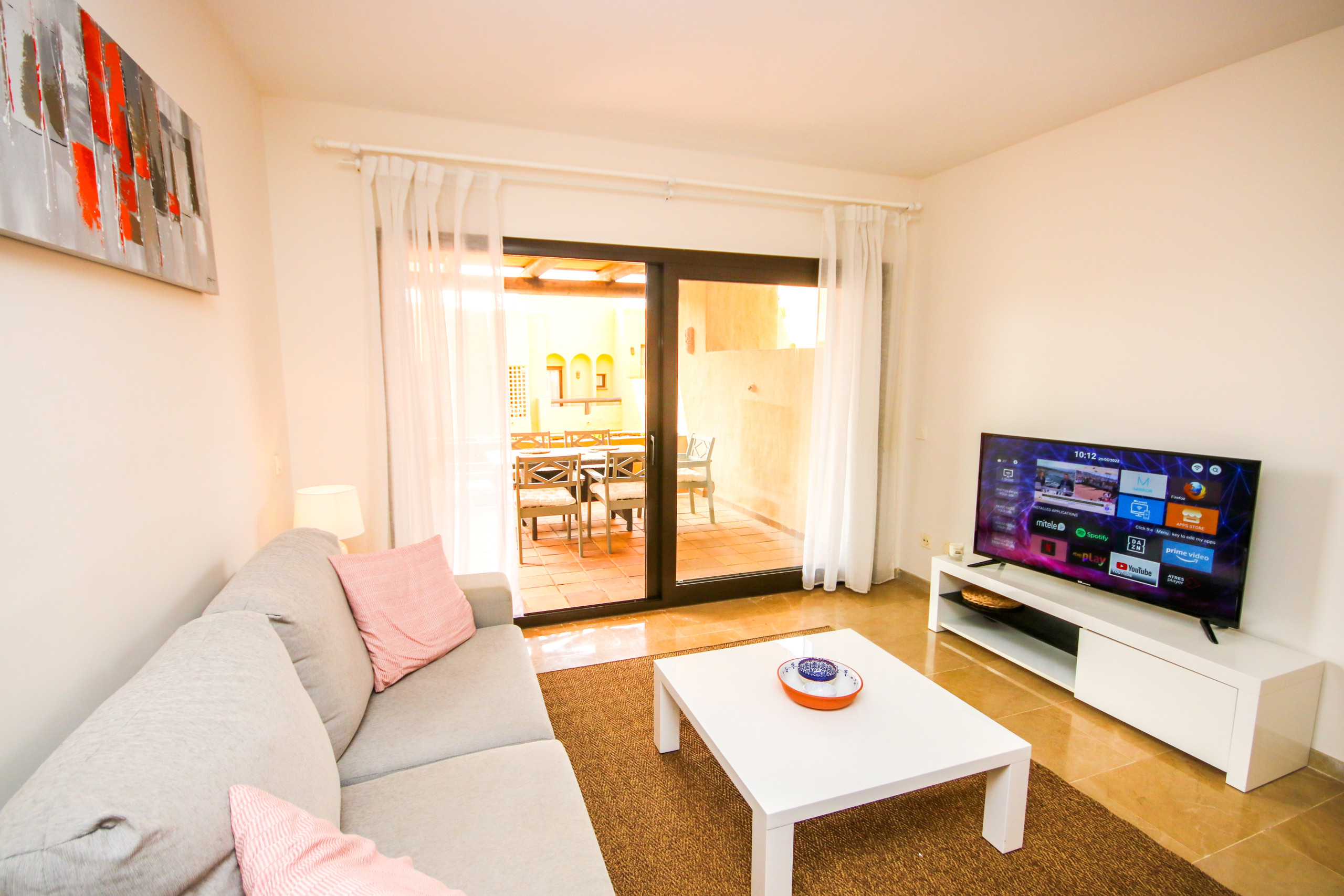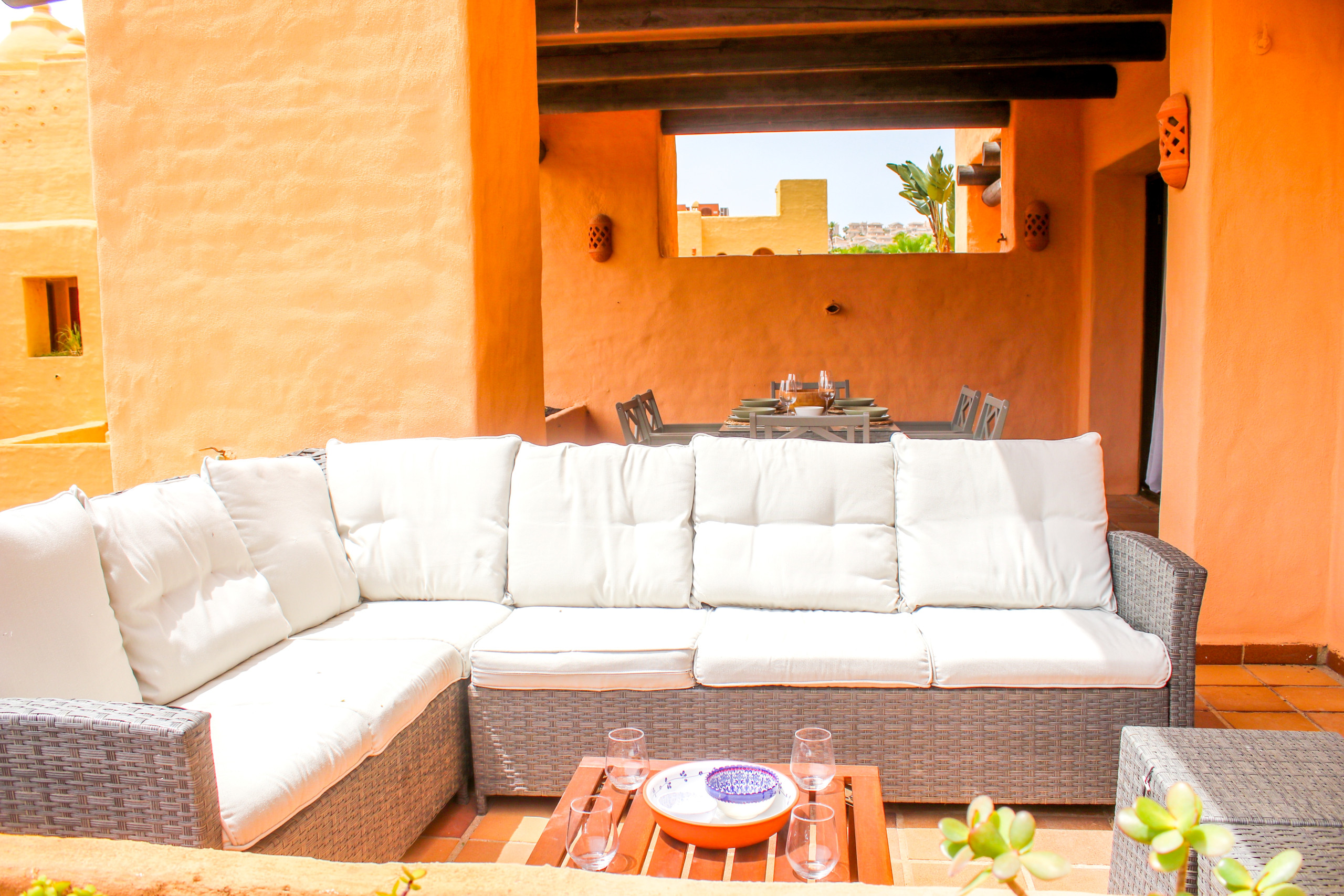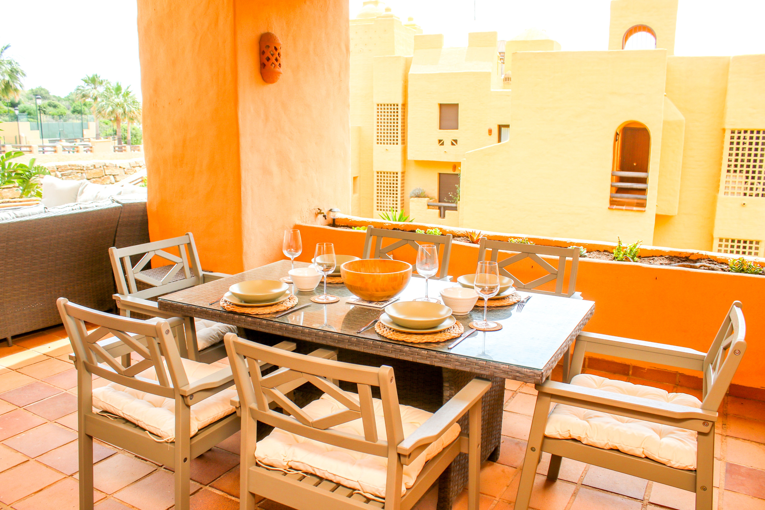 The apartment opens in to a hallway leading to the lounge and dining area, furnished with a dining table and six chairs, a 50¨ television and two comfortable sofas. The lounge opens on to a partially covered terrace where you can relax on the large lounge sofa or the dining area for six people and charcoal BBQ. There is a separate, fully equipped kitchen and utility room at the entrance of the apartment.