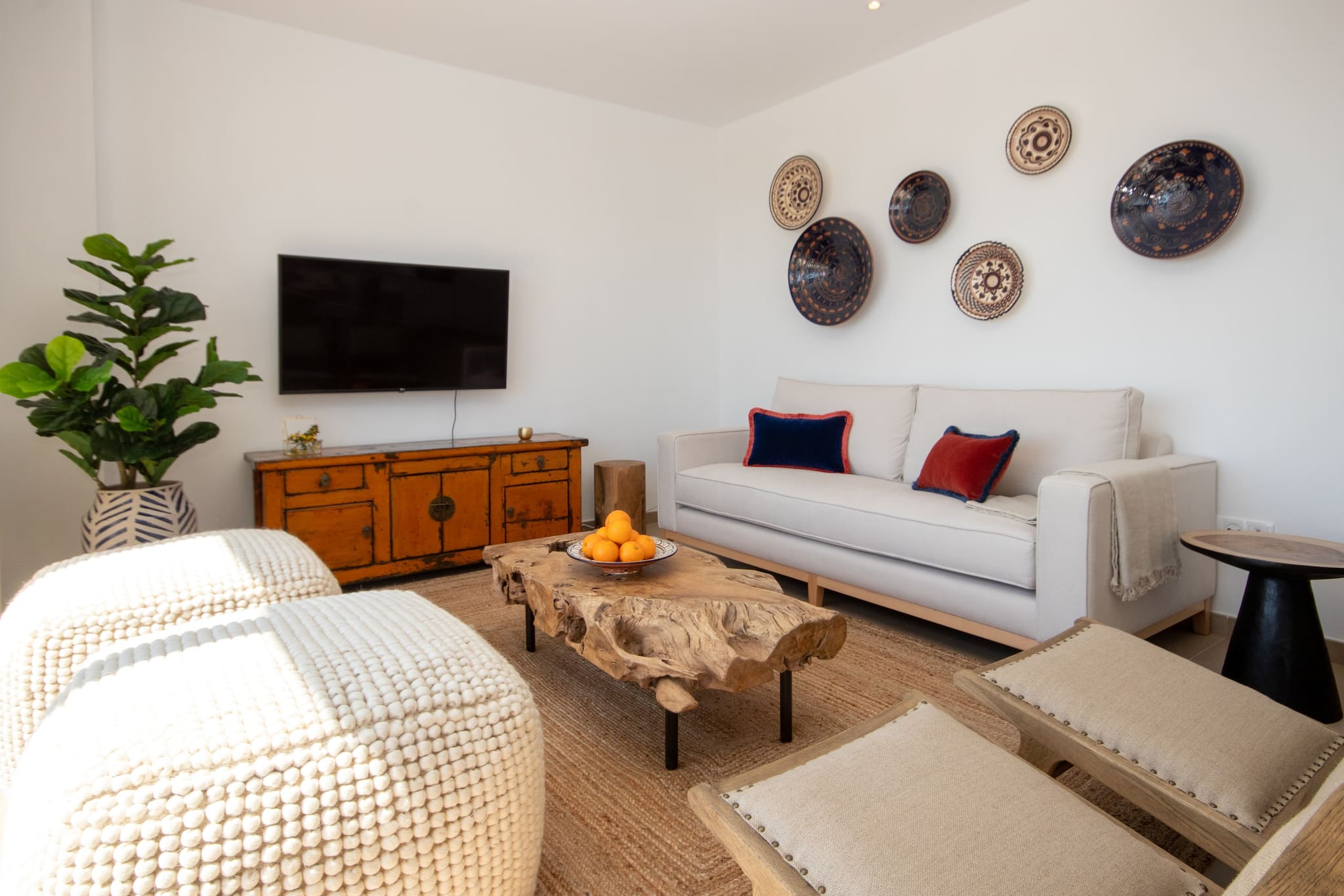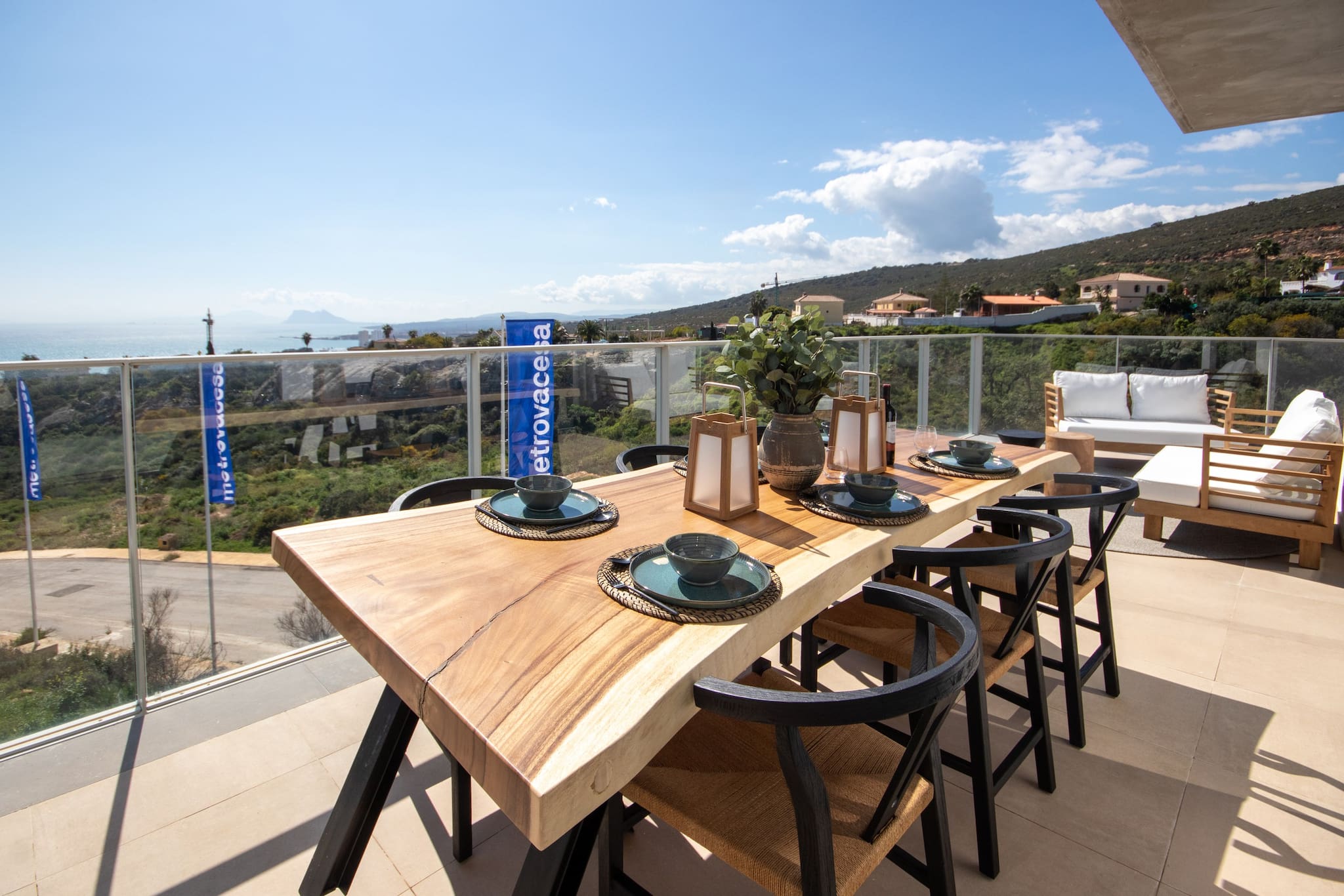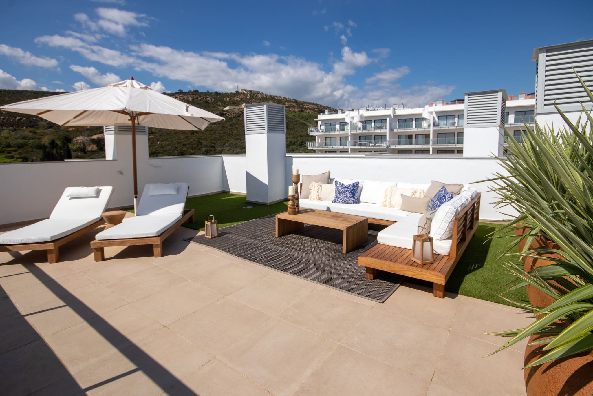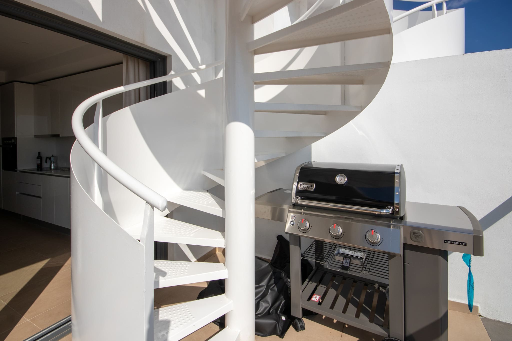 This 2nd floor apartment is arranged over one floor and is tastefully decorated and furnished with exceptional quality furniture and fittings. It offers a sunny terrace off the lounge and a large roof terrace, both giving breathtaking views to the sea. The lounge terrace is furnished with a dining table and chairs, gas BBQ and sofas to relax and enjoy the views and sun. The spiral staircase takes you to the roof terrace which is also furnished with a large sofa and sun loungers.