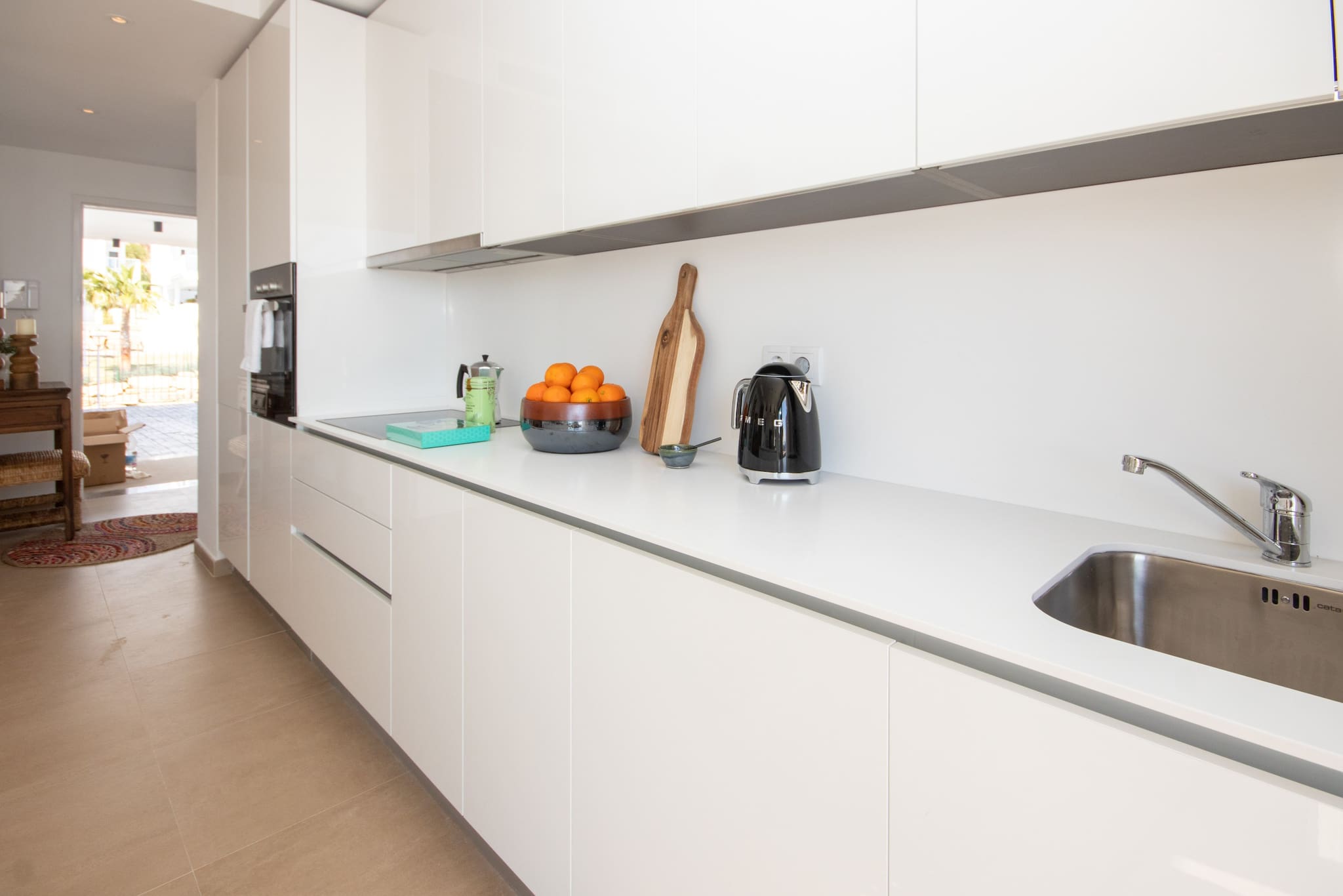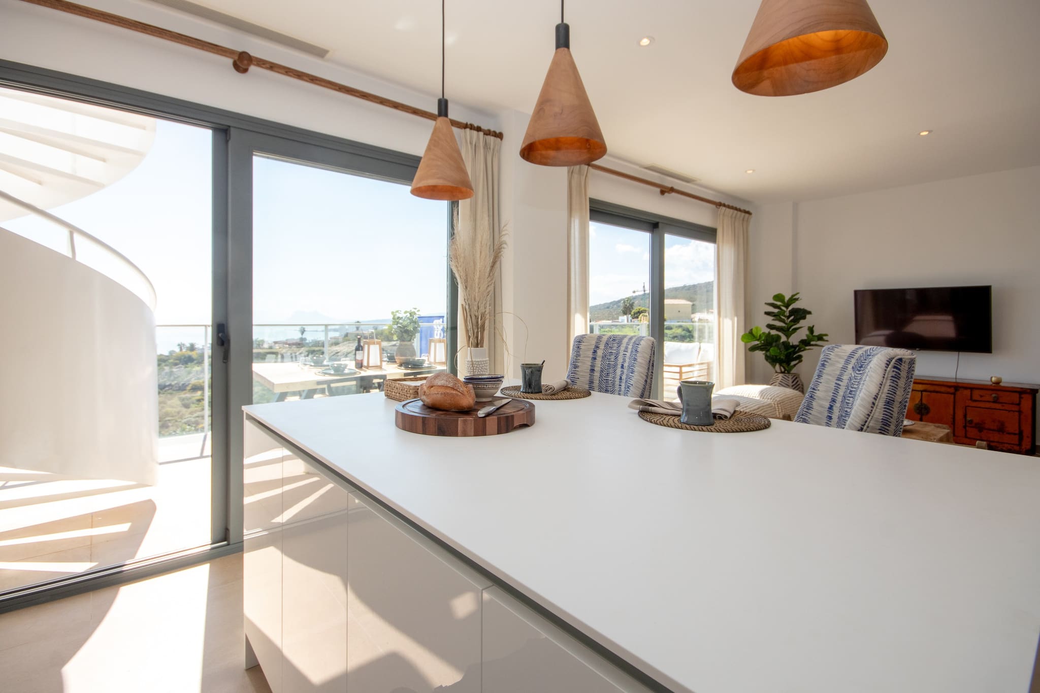 The open plan kitchen/lounge offers a contemporary style lounge with large Smart TV offering International channels and free WiFi. The lounge has large patio doors to access the south-west facing terrace. The fully-equipped kitchen benefits from a large island unit which can be used as a breakfast bar.