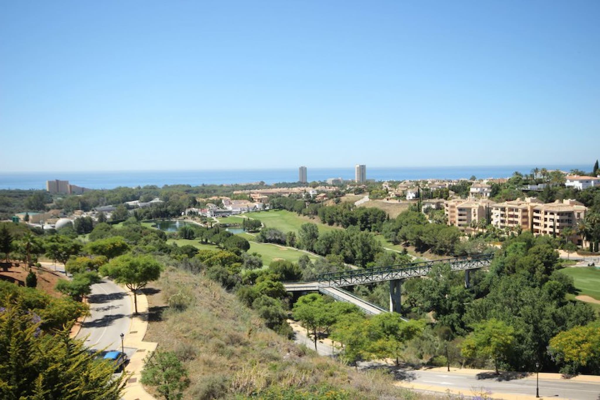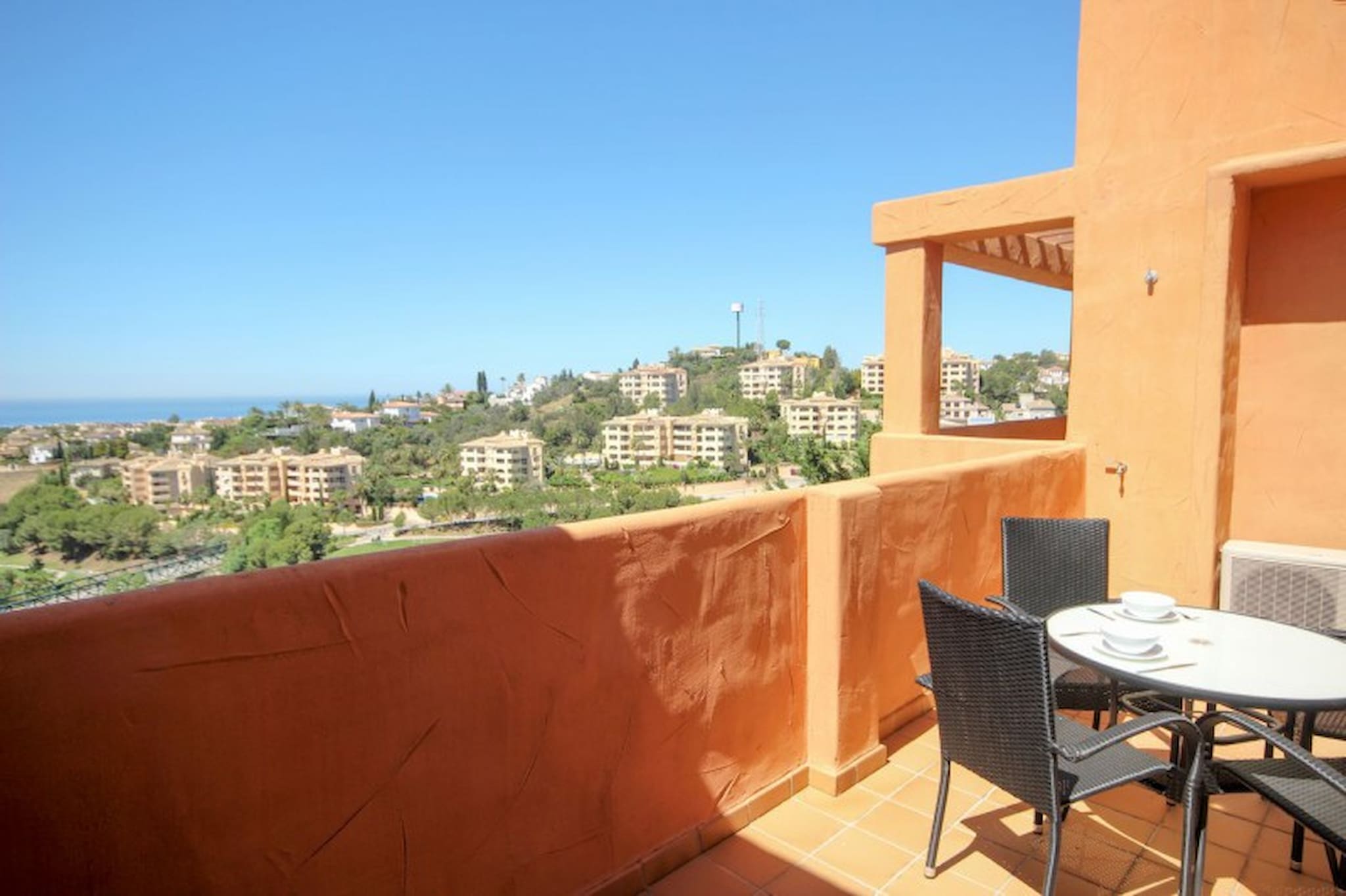 This apartment offers vented A/C and heating throughout. From the lounge you have access to the south-west facing terrace equipped with dining facilities for 4 to soak up the sun whilst enjoying the uninterrupted views over the golf course and down towards the Mediterranean sea. The kitchen is fully fitted with dishwasher, microwave and washing machine. The bedroom is furnished with a double bed, fitted wardrobes and benefits from having access onto the terrace. There is a full bathroom with shower unit over the bath.