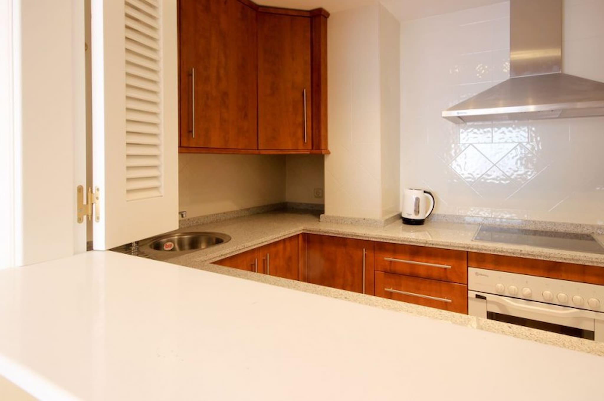 This tastefully decorated 1st floor apartment consists of a spacious lounge /diner which leads out onto the open terrace with beautiful views over the Santa Maria Golf course and to the sea. The lounge is furnished with a large comfortable sofa, dining table and chairs for 4 and a TV. The terrace is also fitted with a dining table and chairs to relax and enjoy the wonderful views and al fresco dining. The lounge has a convenient hatch through to the fully equipped modern .The bedroom is furnished with a double bed, built-in wardrobes and enjoys the benefit access to the terrace. The large bathroom is fitted with a bath with shower attachment.
