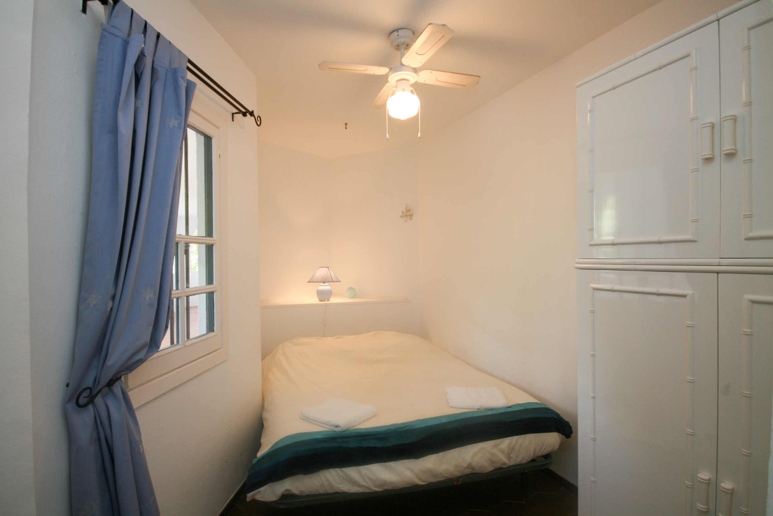 This 1st floor apartment is arranged over 2 floors and consists of a lounge/diner which opens out onto a small south east facing terrace. The lounge is furnished with 2 sofas, one of which is a sofa bed, TV and has A/C. There is a fully equipped kitchen with a convenient hatch through to the lounge.