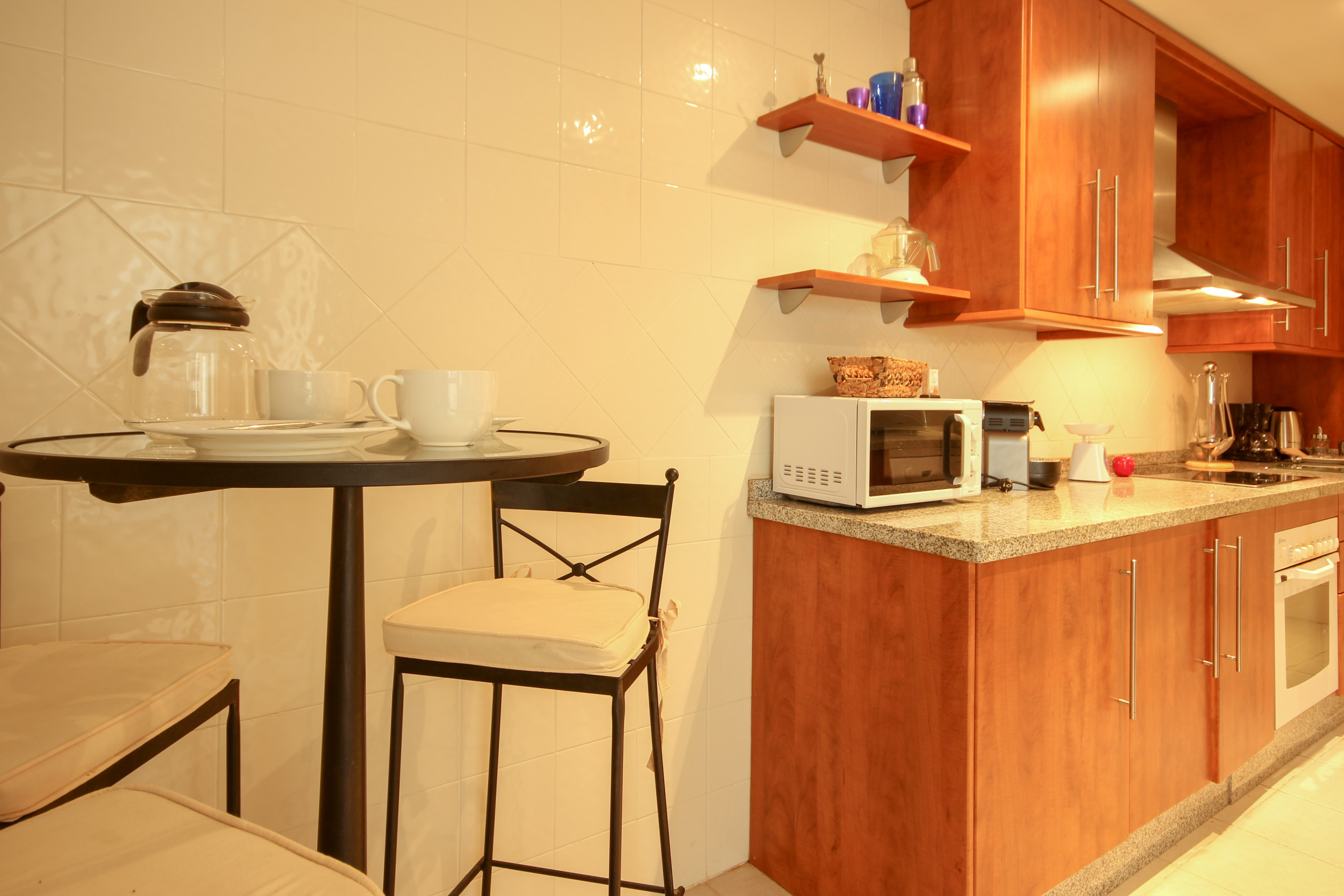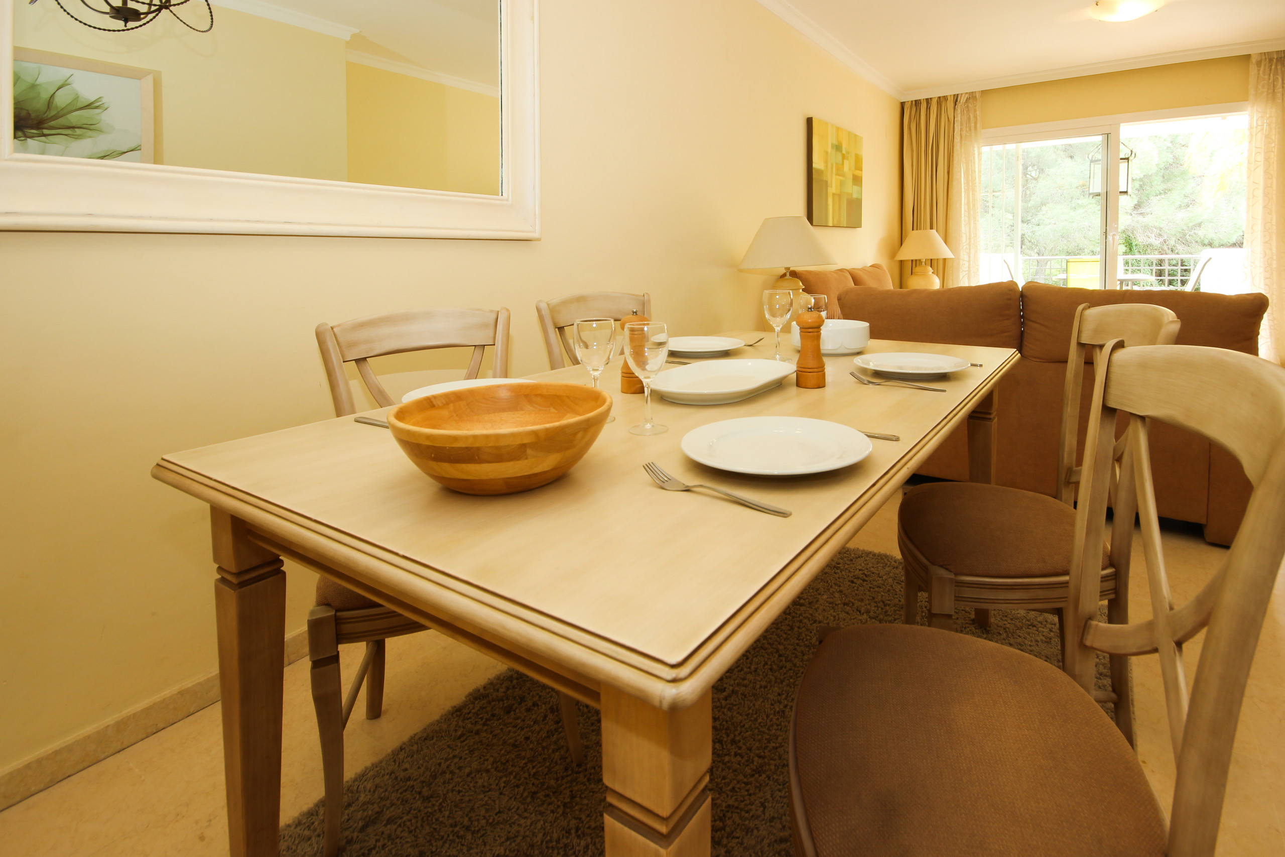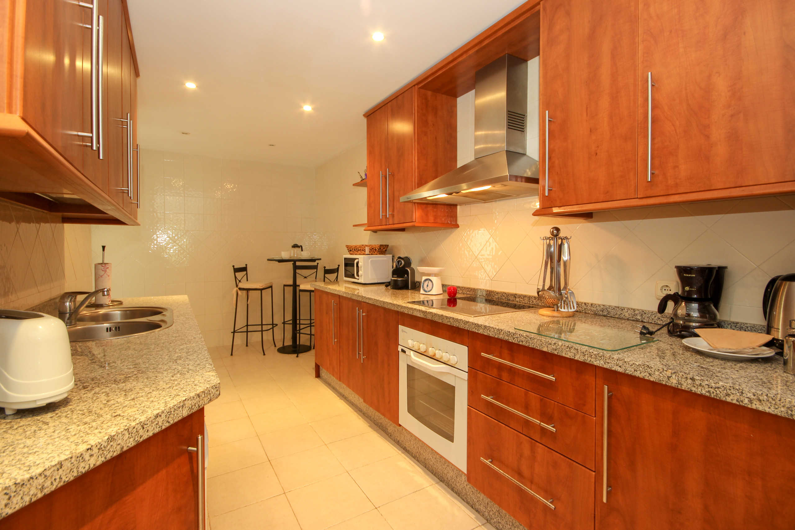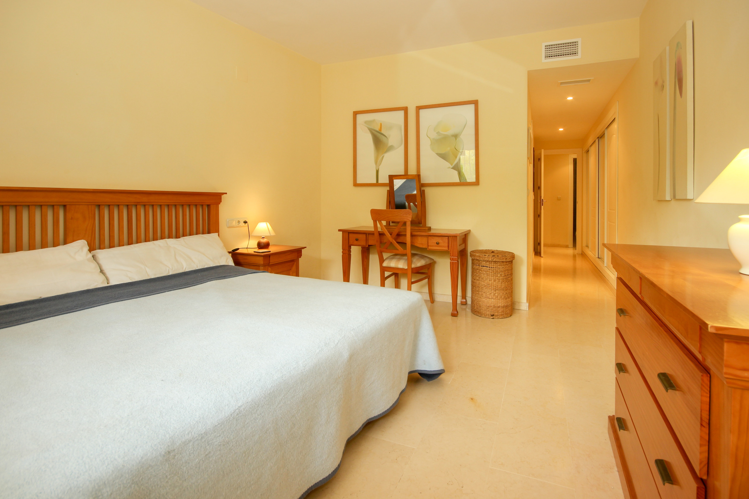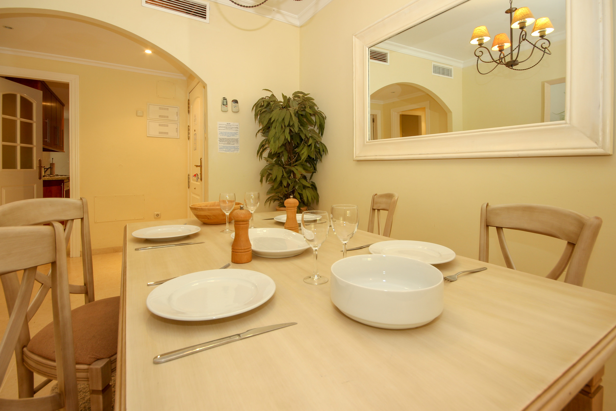 This spacious apartment is stylishly decorated and consists of a large lounge/diner leading onto a large south-west facing terrace with stunning mountain and some sea views. The covered terrace is equipped with table and chairs for al fresco dining. The lounge is furnished with comfy sofas, TV and dining table and chairs. The apartment has A/C throughout and the community WiFi can be accessed from the apartment. The well proportioned, modern kitchen has granite worktops and a breakfast table and stools.