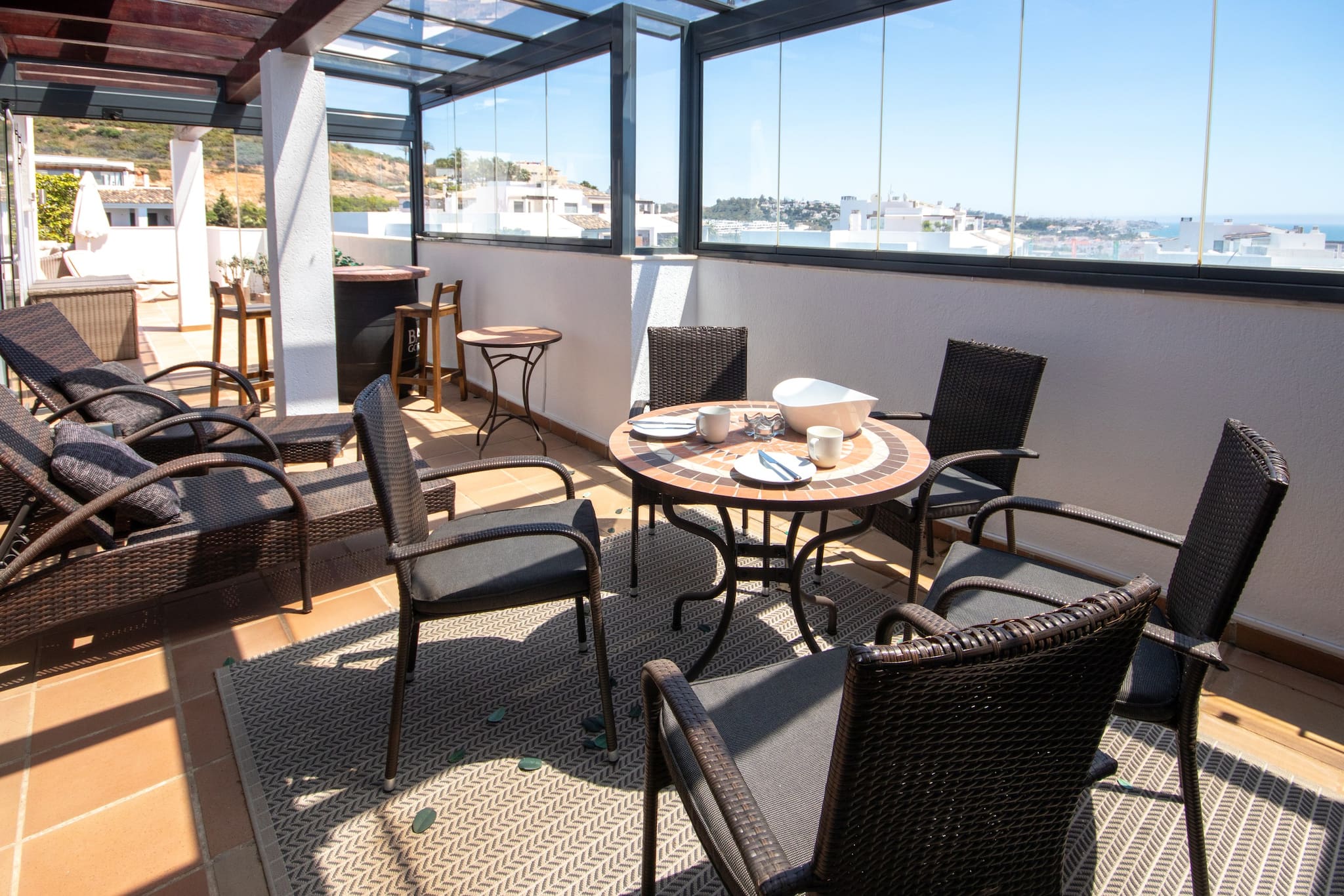 The apartment is located on the first floor with access by stairs and is arranged over one level. The open plan living space benefits from a well equipped kitchen. There is a dining seating area and the lounge area offers two sofas and a TV with International channels. From the dining area, access the private covered terrace to enjoy the dining seating area. From sunrise to sunset, take in the breath taking sea views.
