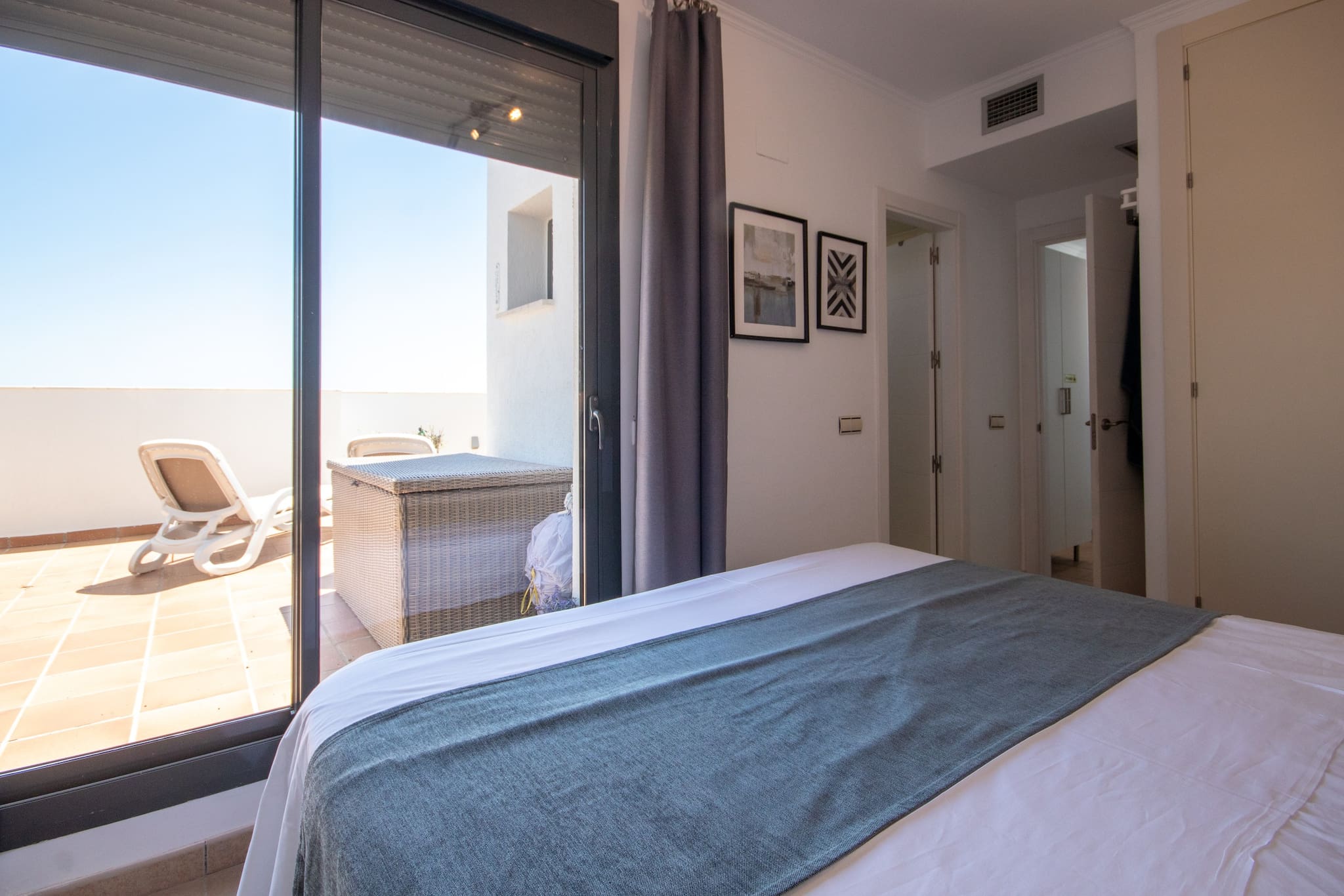 The bedroom is furnished with a king size bed and fitted wardrobes. There is an ensuite bathroom, fitted with a bath with a shower attachment and a bidet. The bedroom has direct access to the terrace.
