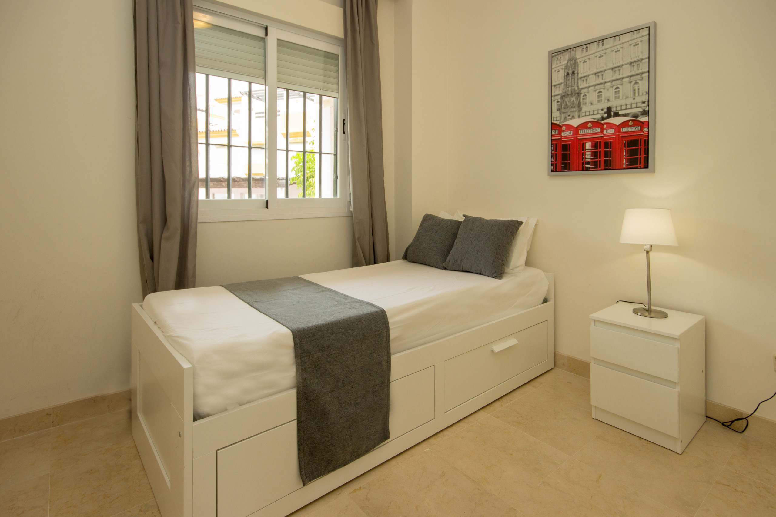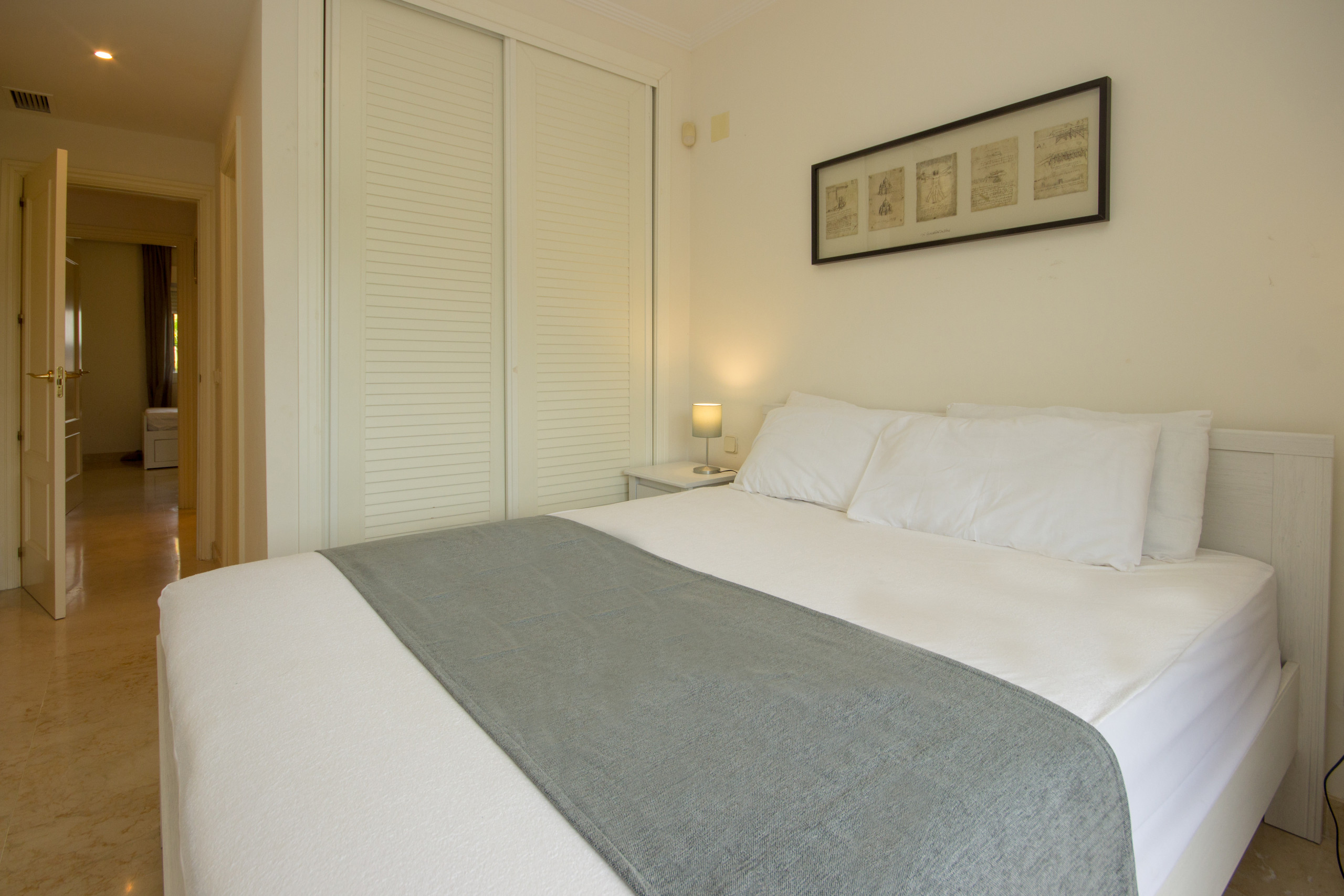 The main bedroom is furnished with a king size bed and fitted wardrobes. This bedroom benefits from an en suite full bathroom and access to the terrace. The 2nd bedroom is fitted with a single bed that pulls out to a king size bed and built in wardrobes. There is also a guest shower room with walk in shower.
