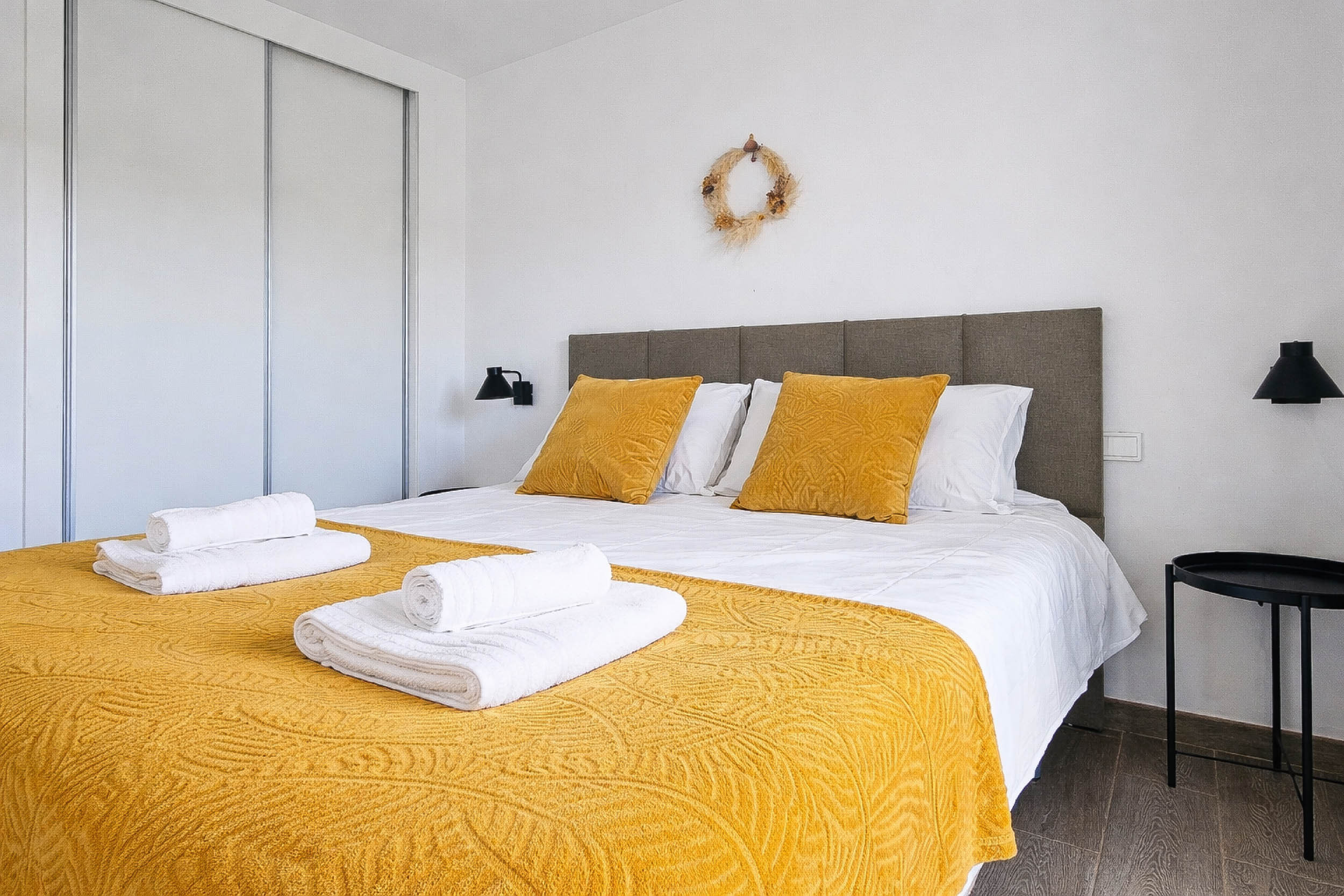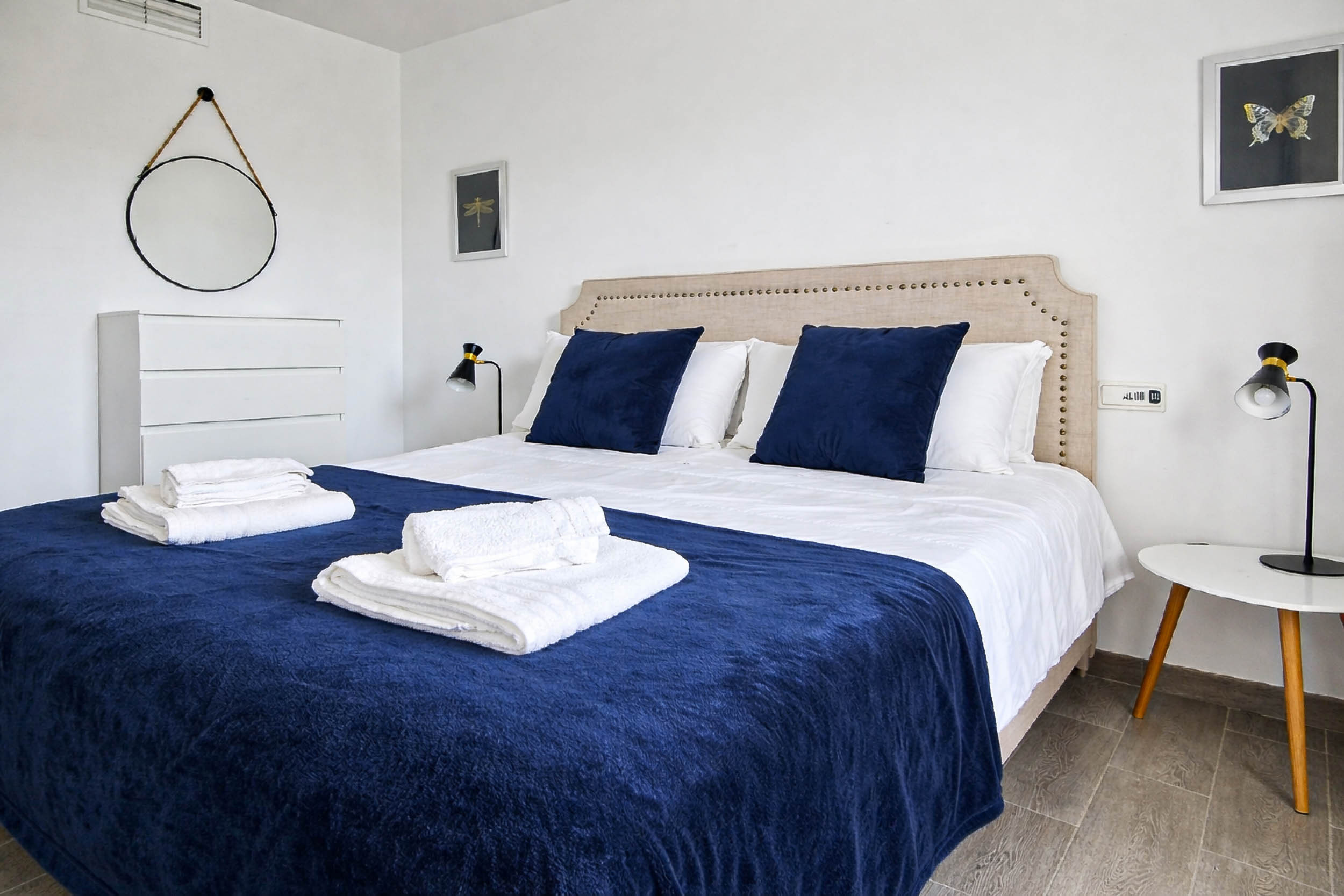 Both bedrooms enjoy direct access to the terrace. The master bedroom features a super king-size bed, fitted wardrobes and an ensuite bathroom with bath and shower attachment. The second bedroom also offers a super king-size bed, fitted wardrobes and access to a separate guest shower room.