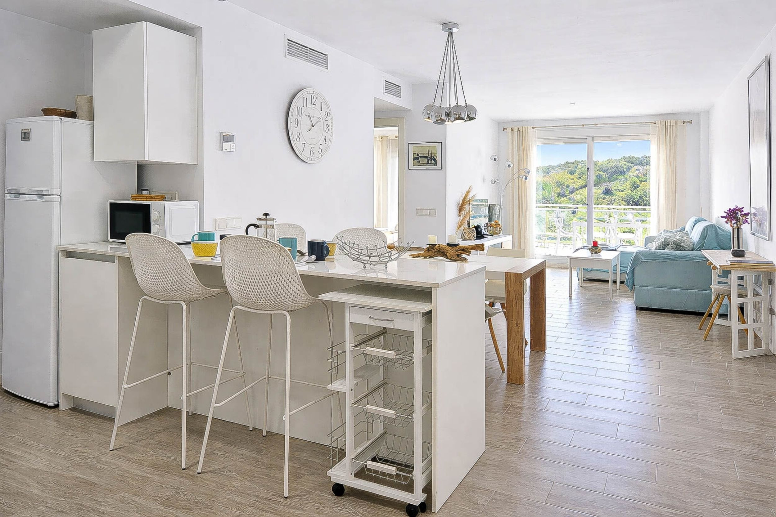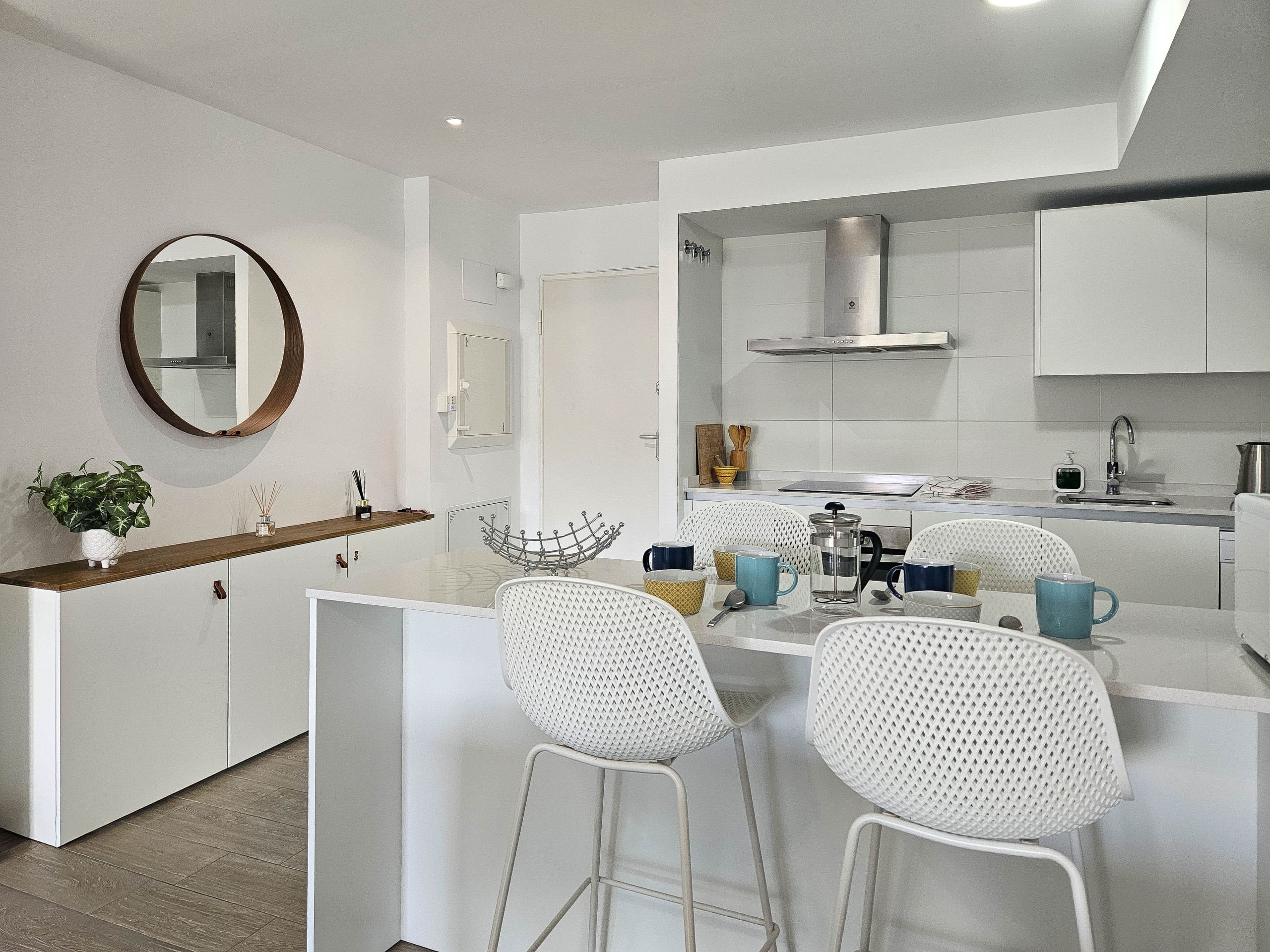 Inside, the apartment offers a bright open-plan living space with dining for up to six guests, a fully equipped kitchen and a breakfast-bar island with stools. The comfortable L-shaped sofa converts into a double sofa bed, allowing the apartment to sleep up to six guests if required.