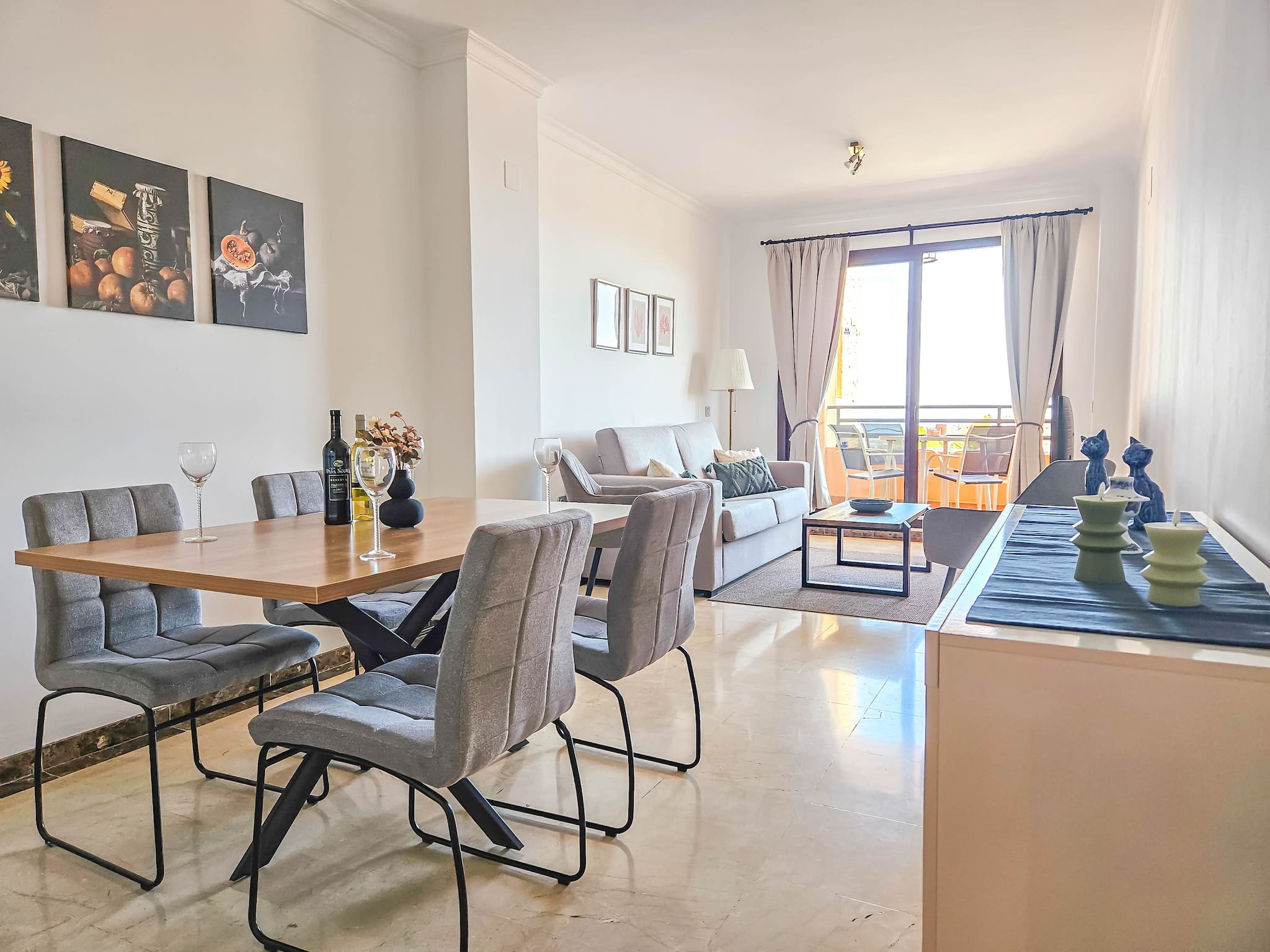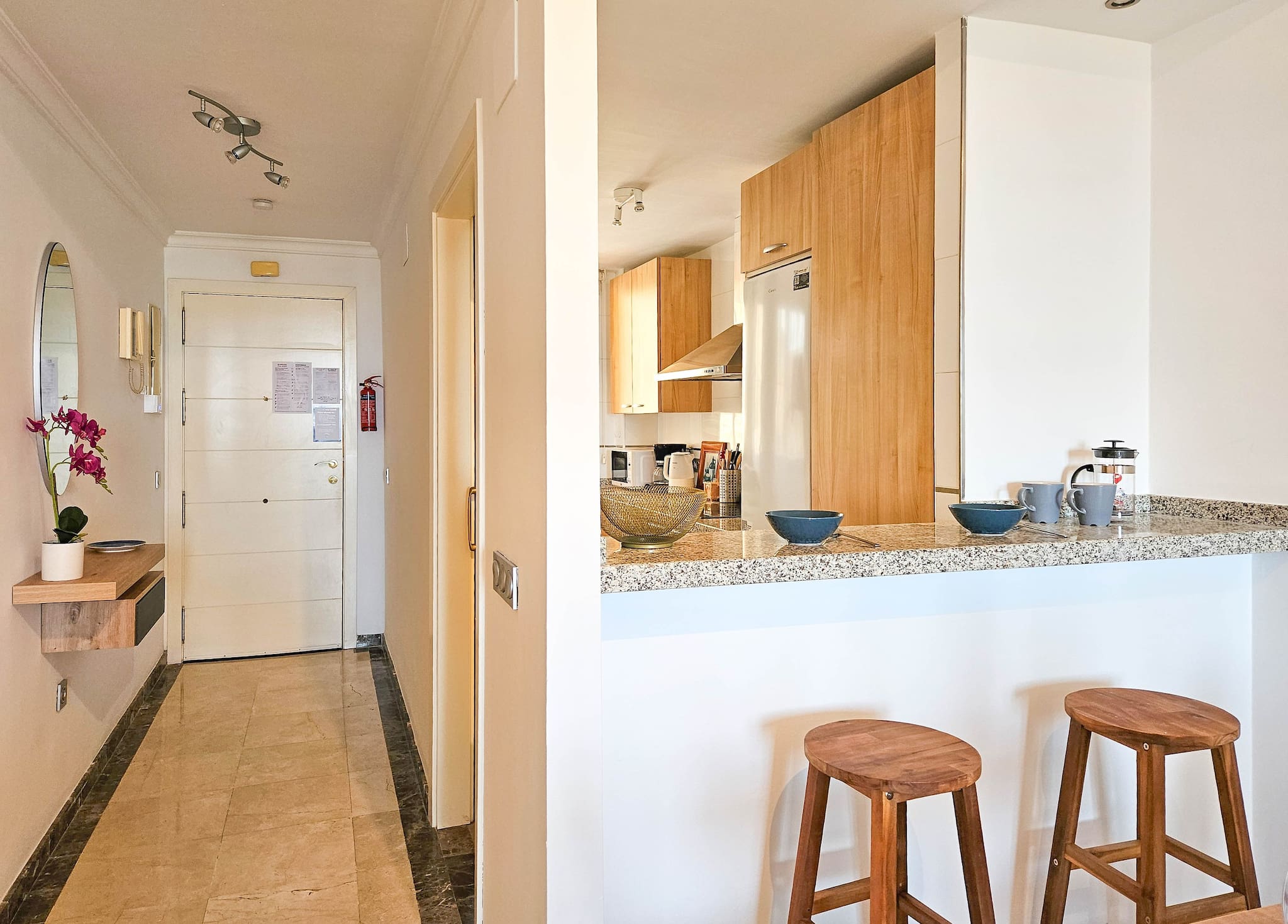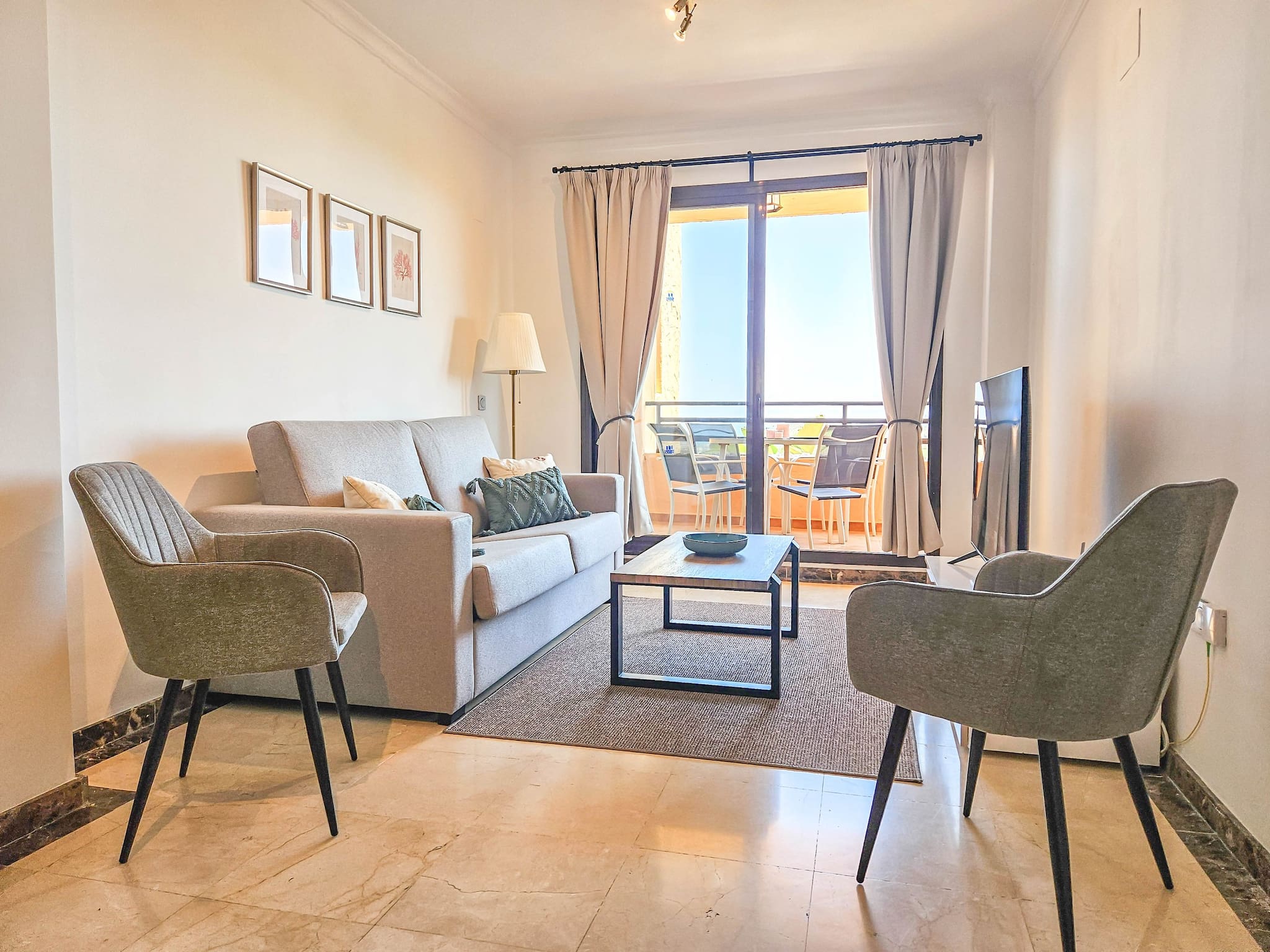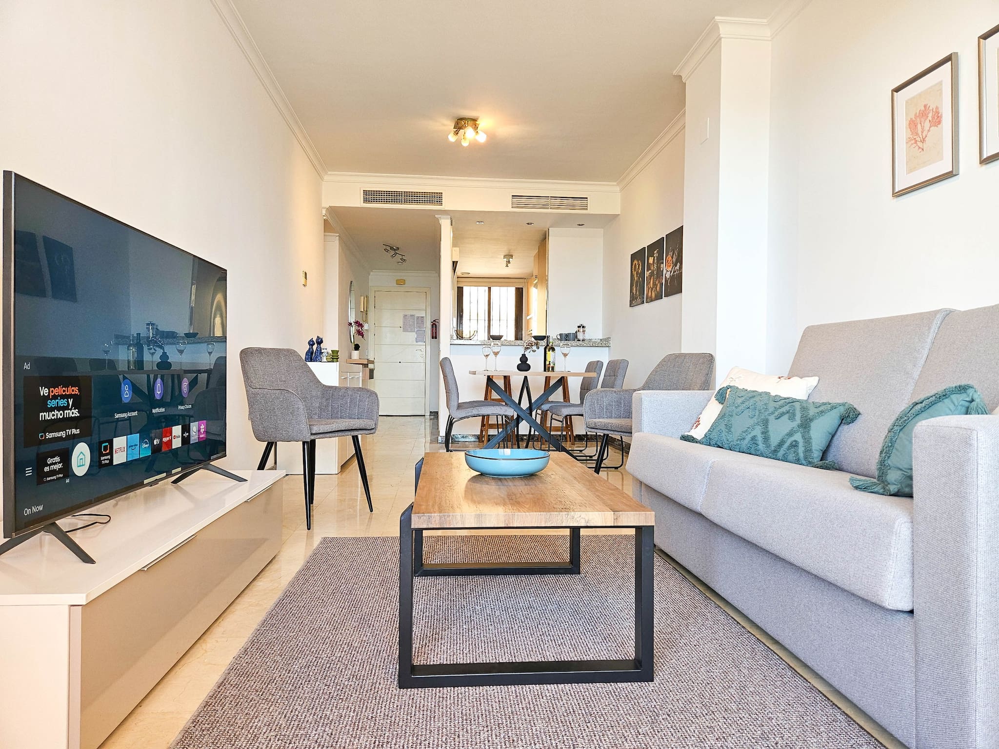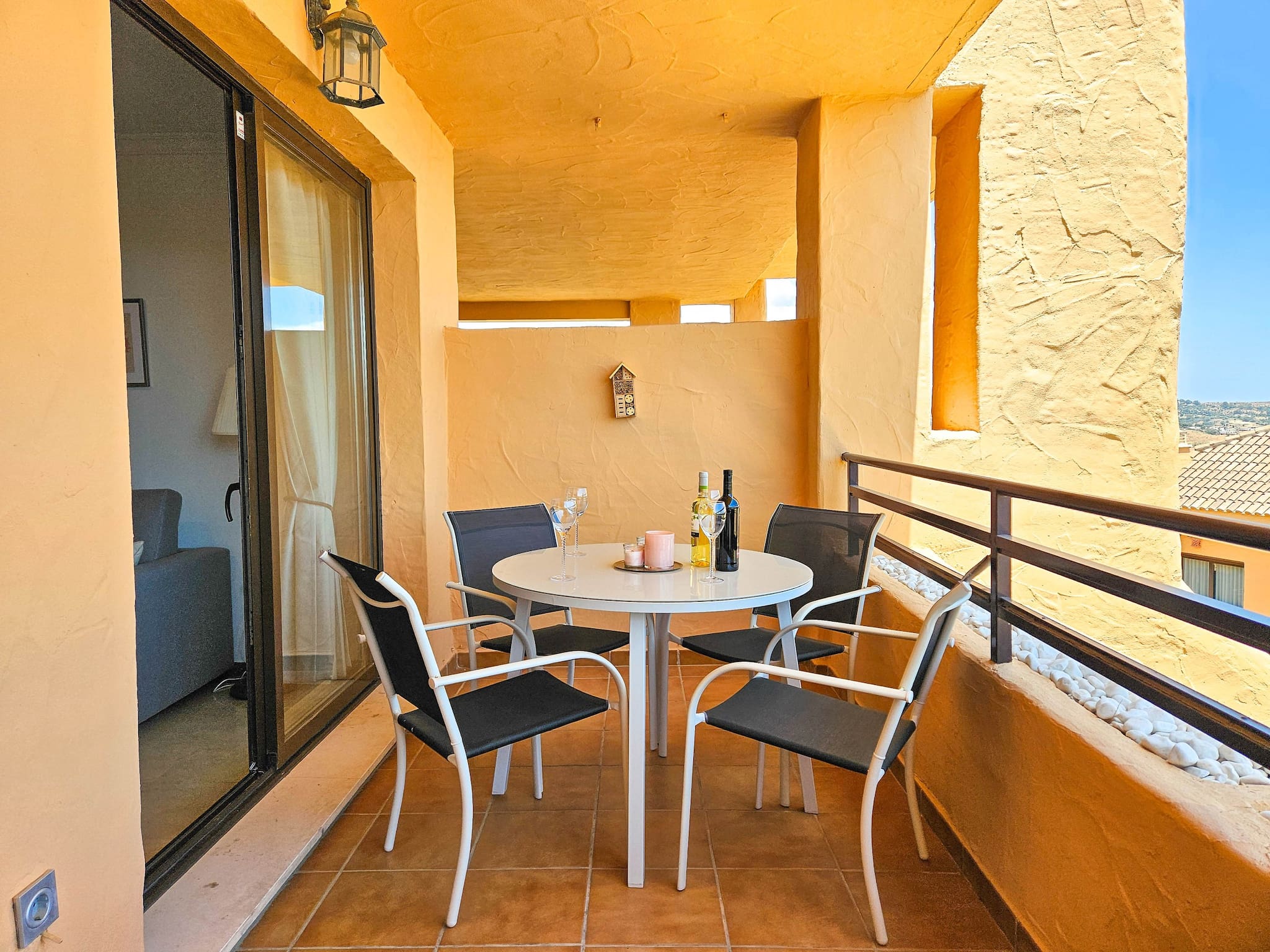 The tastefully furnished apartment is located on the first floor, with access by lift and is arranged over one level. The separate kitchen is well equipped and has a breakfast bar with two stools. The open plan lounge, dining area is furnished with a dining table and chairs, a sofa and two chairs and also a 55" smart TV . The covered terrace can be accessed from the lounge. Here you can enjoy a further dining seating area, plus two lounge seats while you take in the beautiful views over the pools, golf course and sea views.