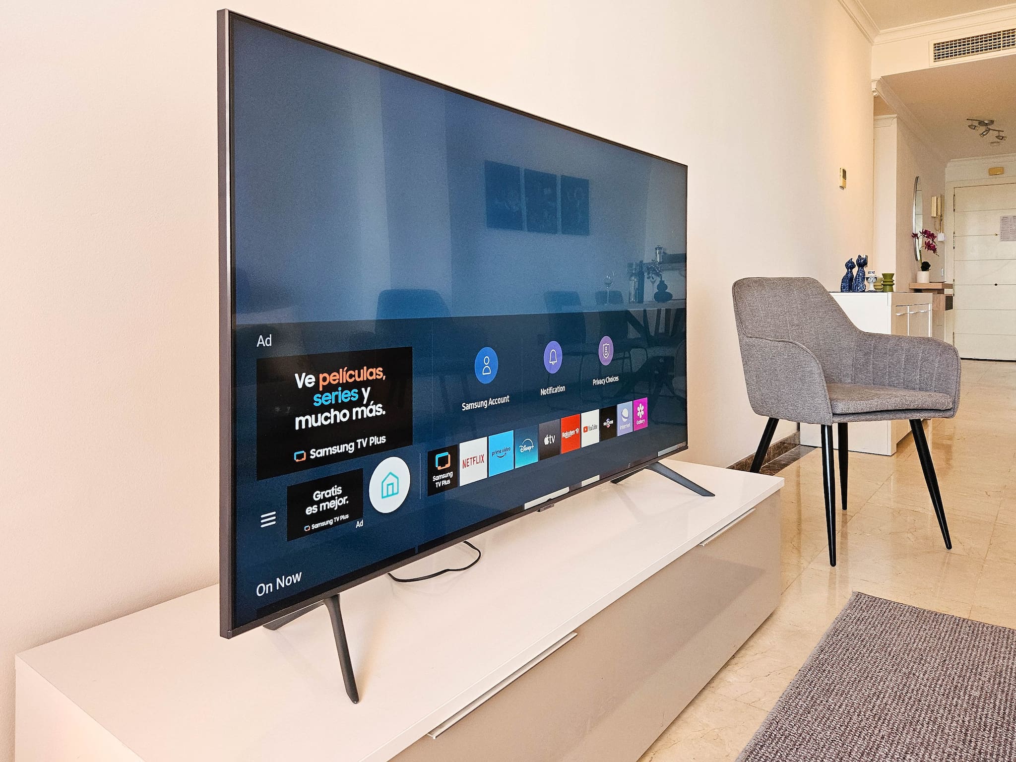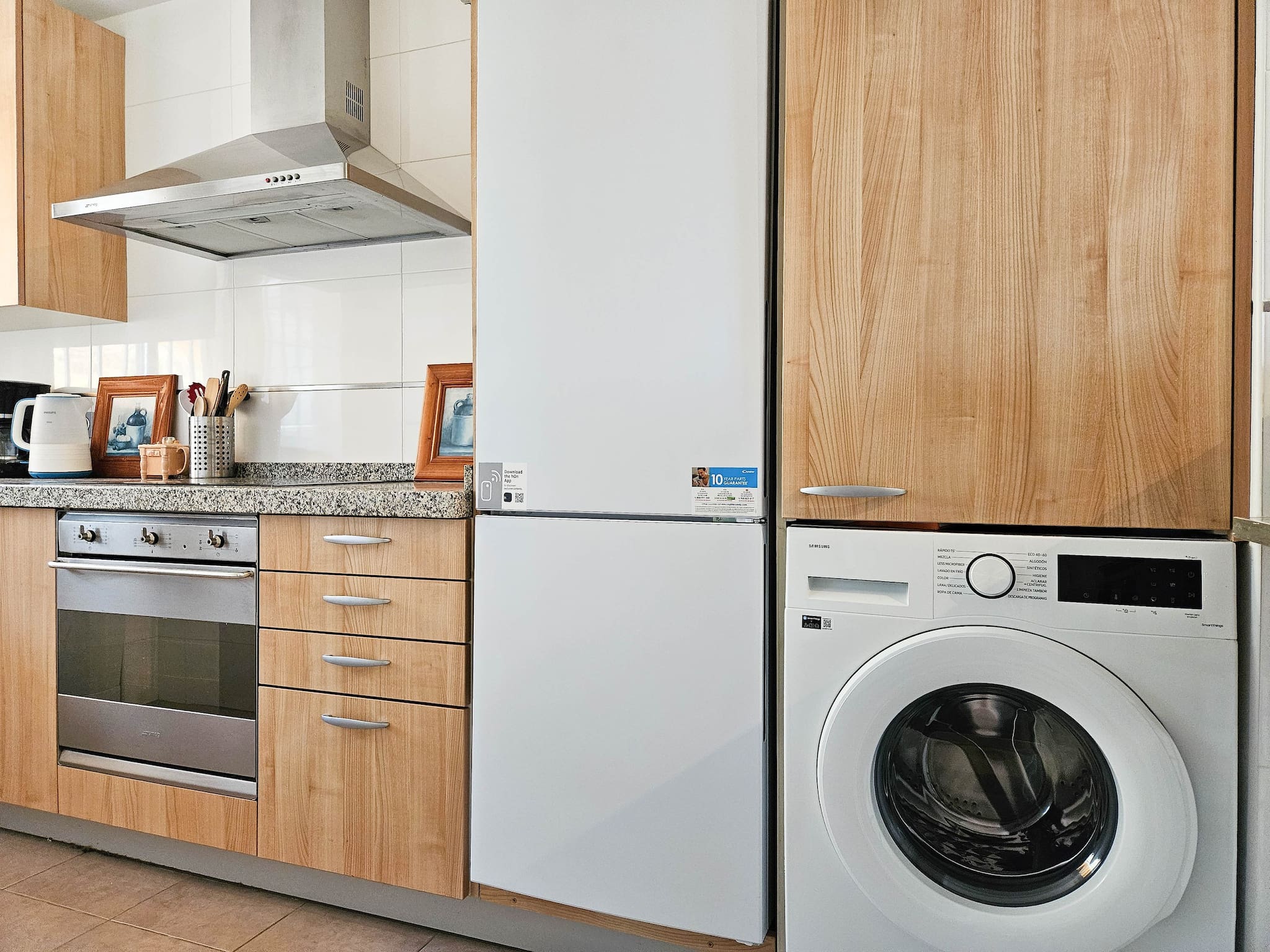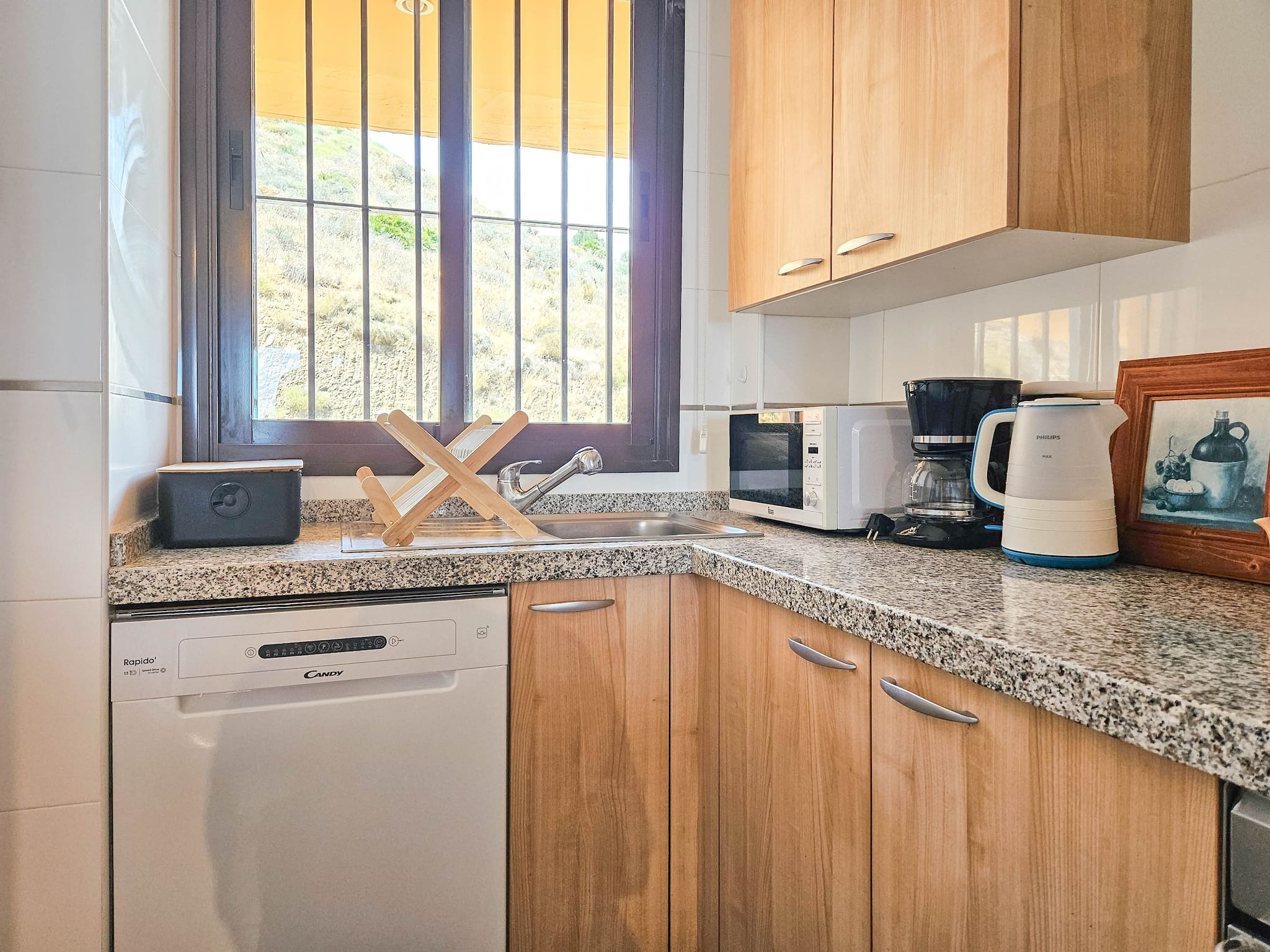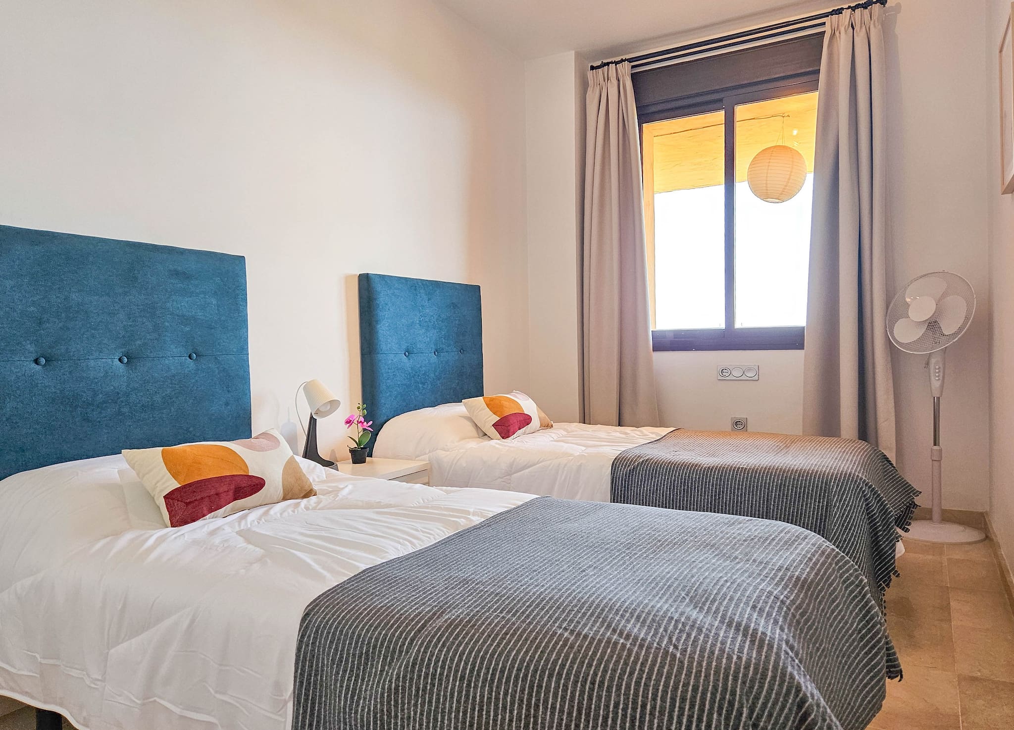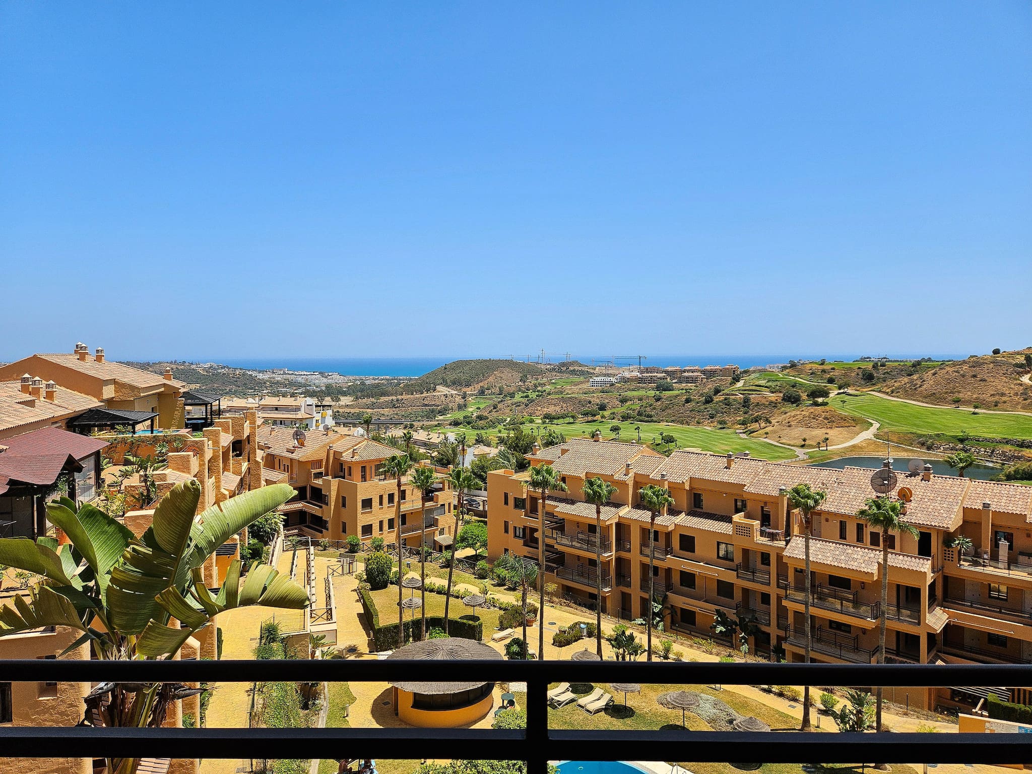 The tastefully furnished apartment is located on the first floor, with access by lift and is arranged over one level. The separate kitchen is well equipped and has a breakfast bar with two stools. The open plan lounge, dining area is furnished with a dining table and chairs, a sofa and two chairs and also a 55" smart TV . The covered terrace can be accessed from the lounge. Here you can enjoy a further dining seating area, plus two lounge seats while you take in the beautiful views over the pools, golf course and sea views.