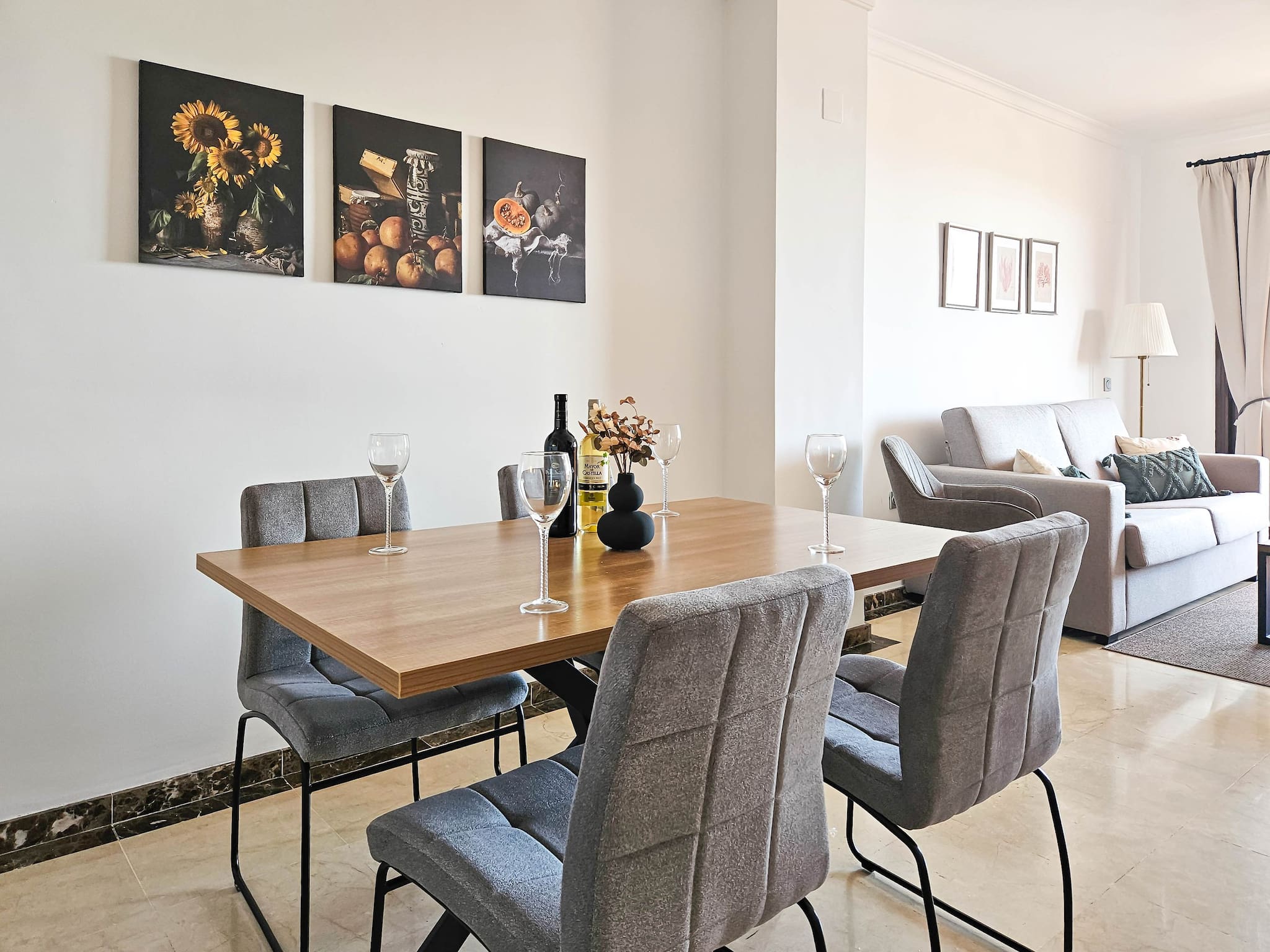 This spacious apartment is located on the third floor, with access by lift and is arranged over one floor. There is a separate, fully equipped kitchen and the open plan living space offers a dining seating area and an L shaped sofa that opens out to make a double bed, to sleep two people. There is also a 50¨smart TV and sound bar. There is access onto the wrap around from the lounge and dining areas. Here you can enjoy views of the pool while you relax in the lounge or dining seating areas. There are deck chairs, a built in charcoal BBQ and an awning for those hotter days.