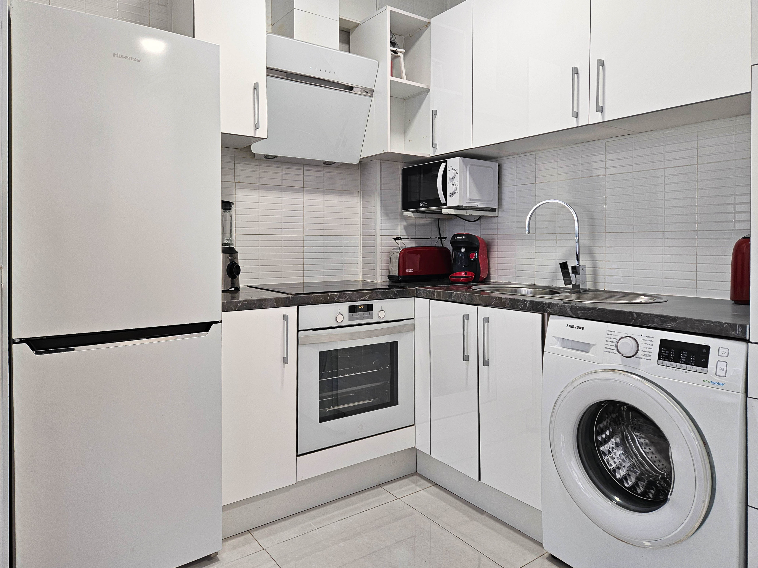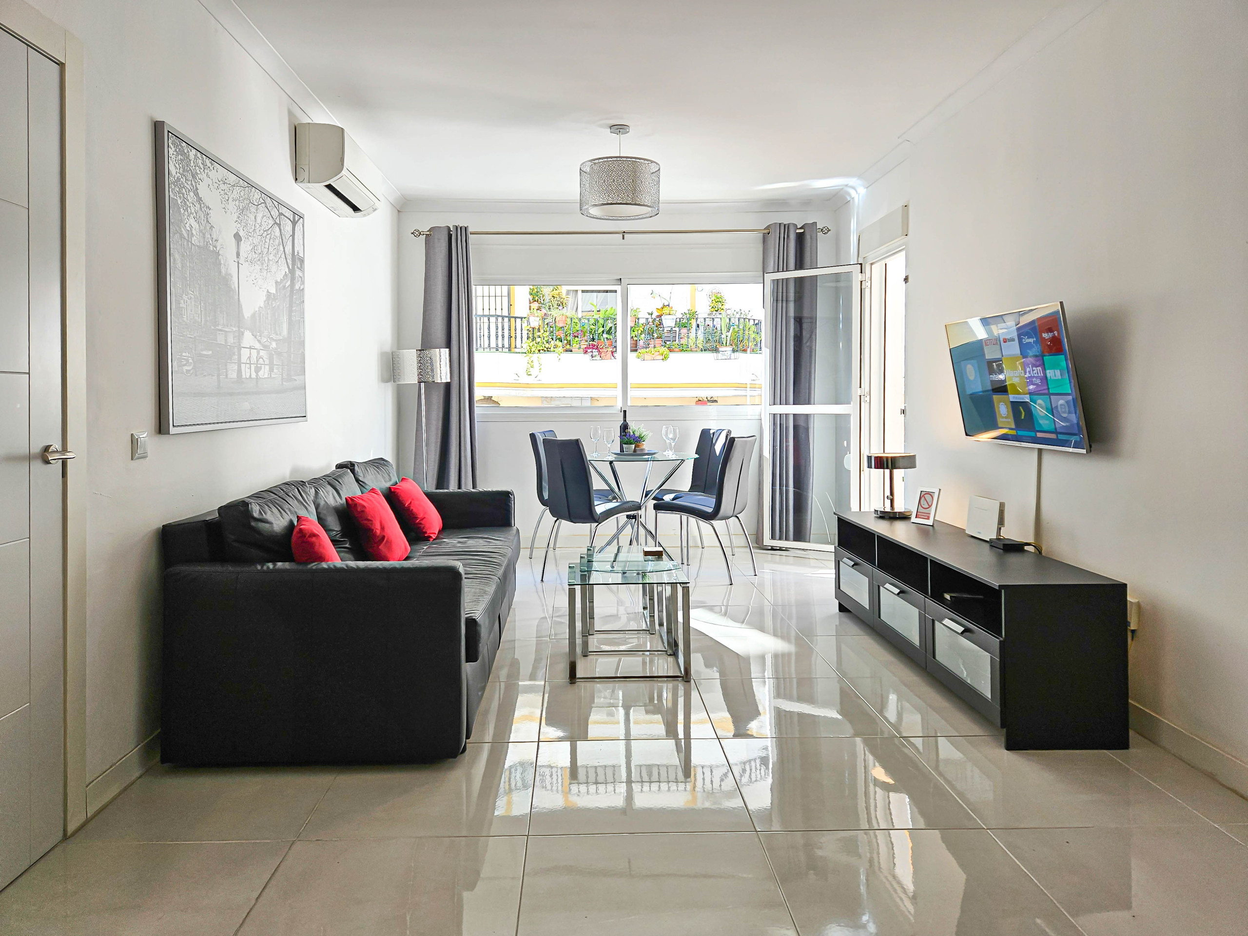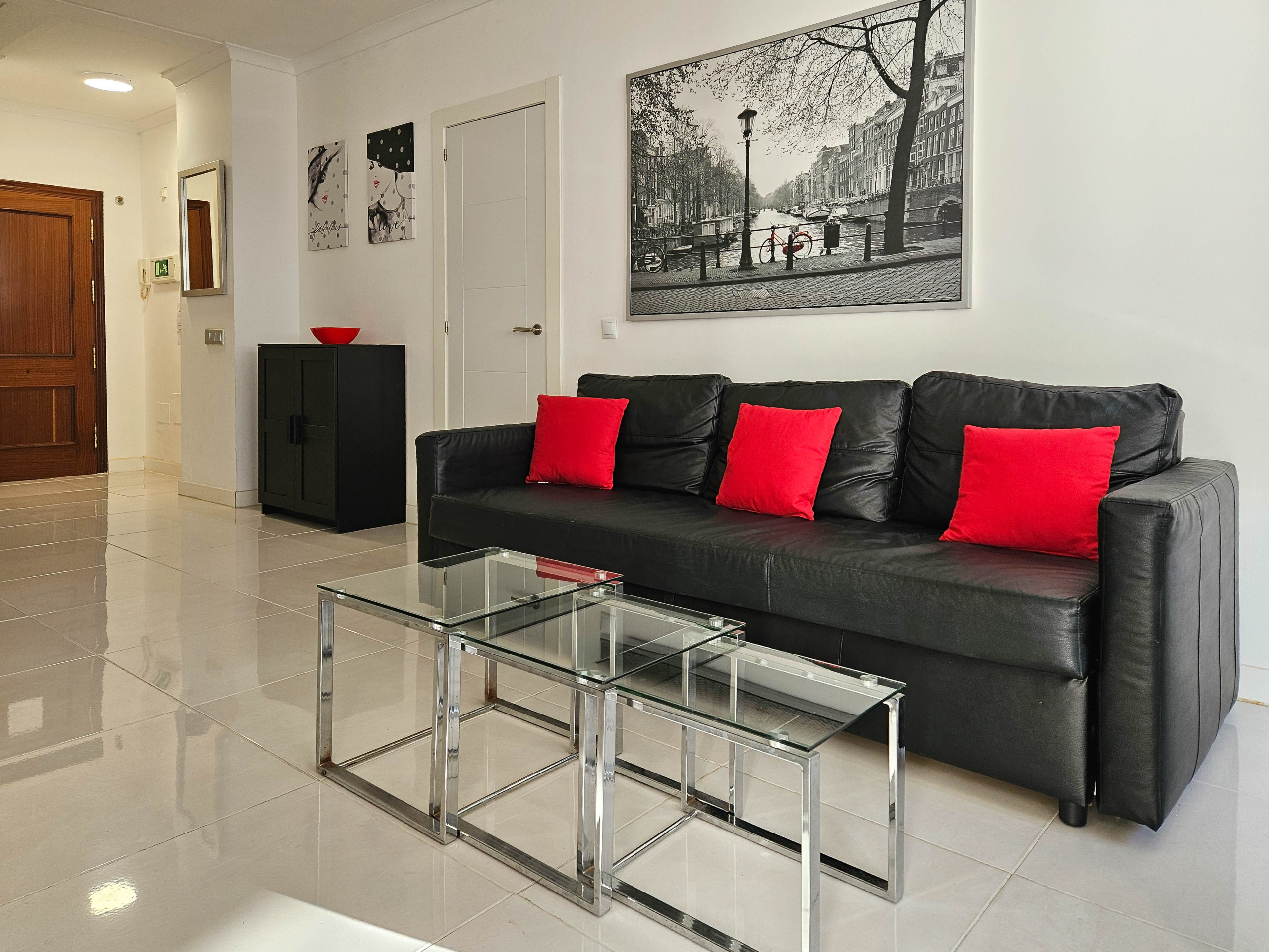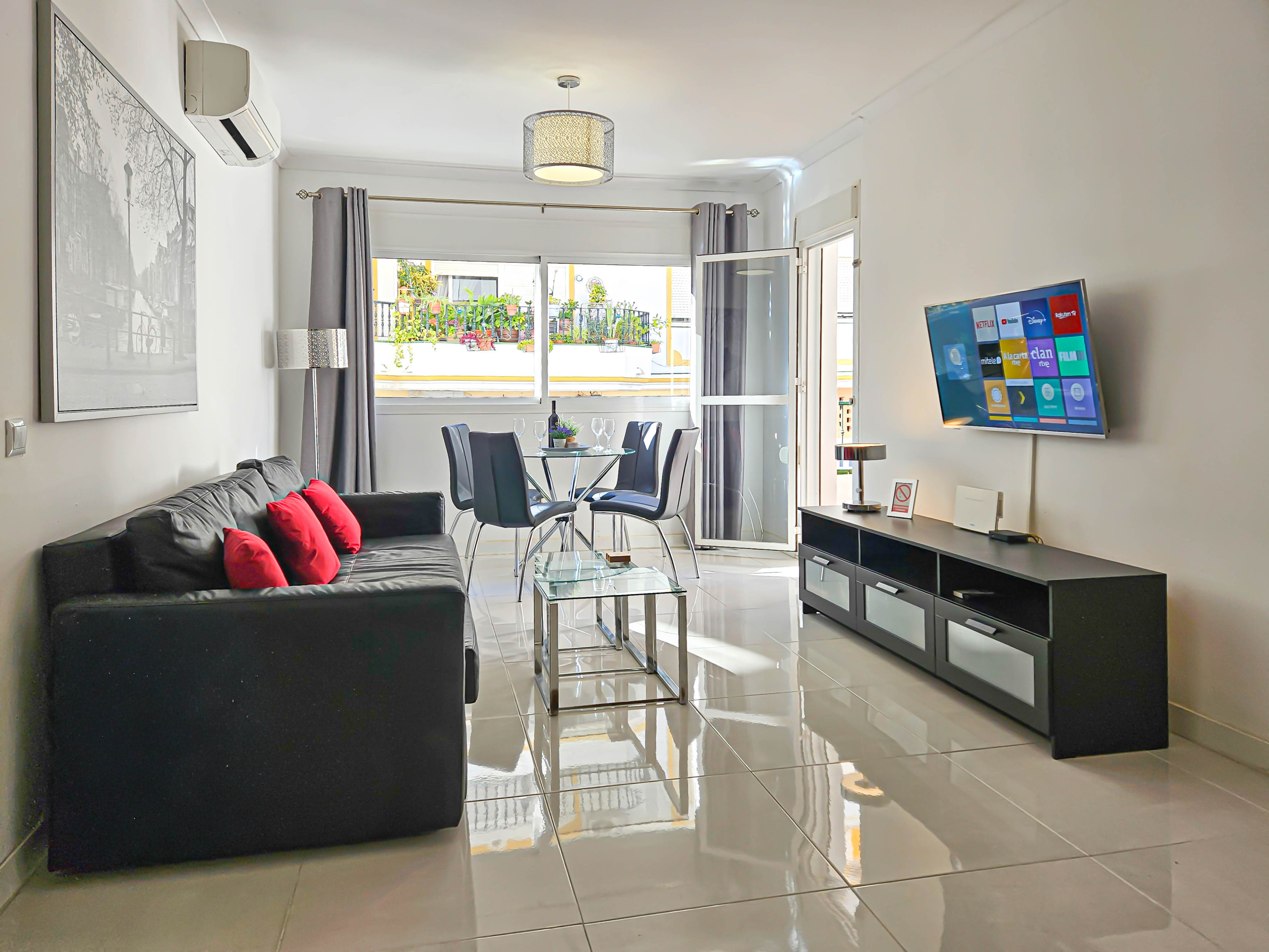 The apartment is fully equipped with shutters throughout, air conditioning in both the lounge and bedrooms, and free Wi-Fi.